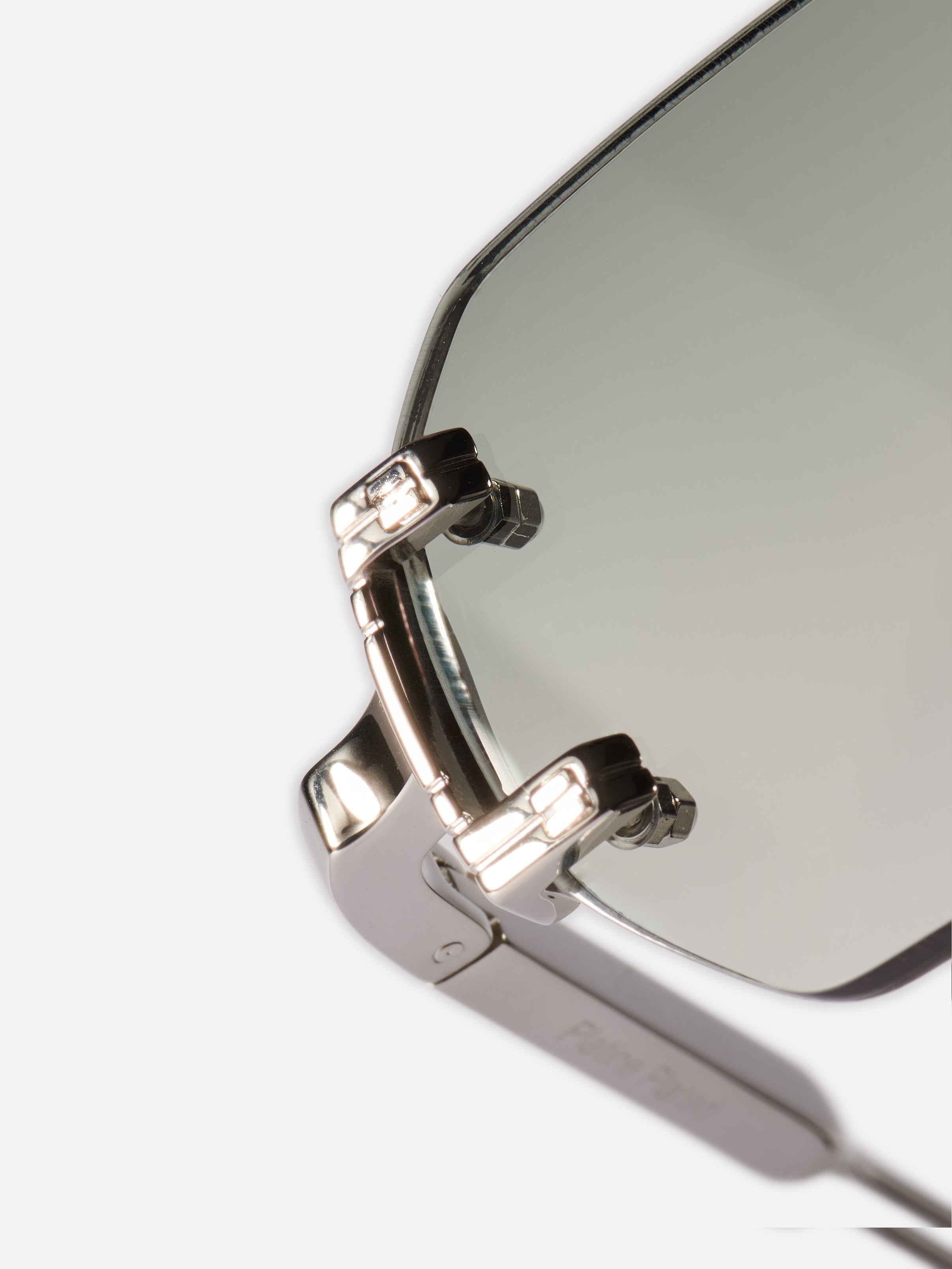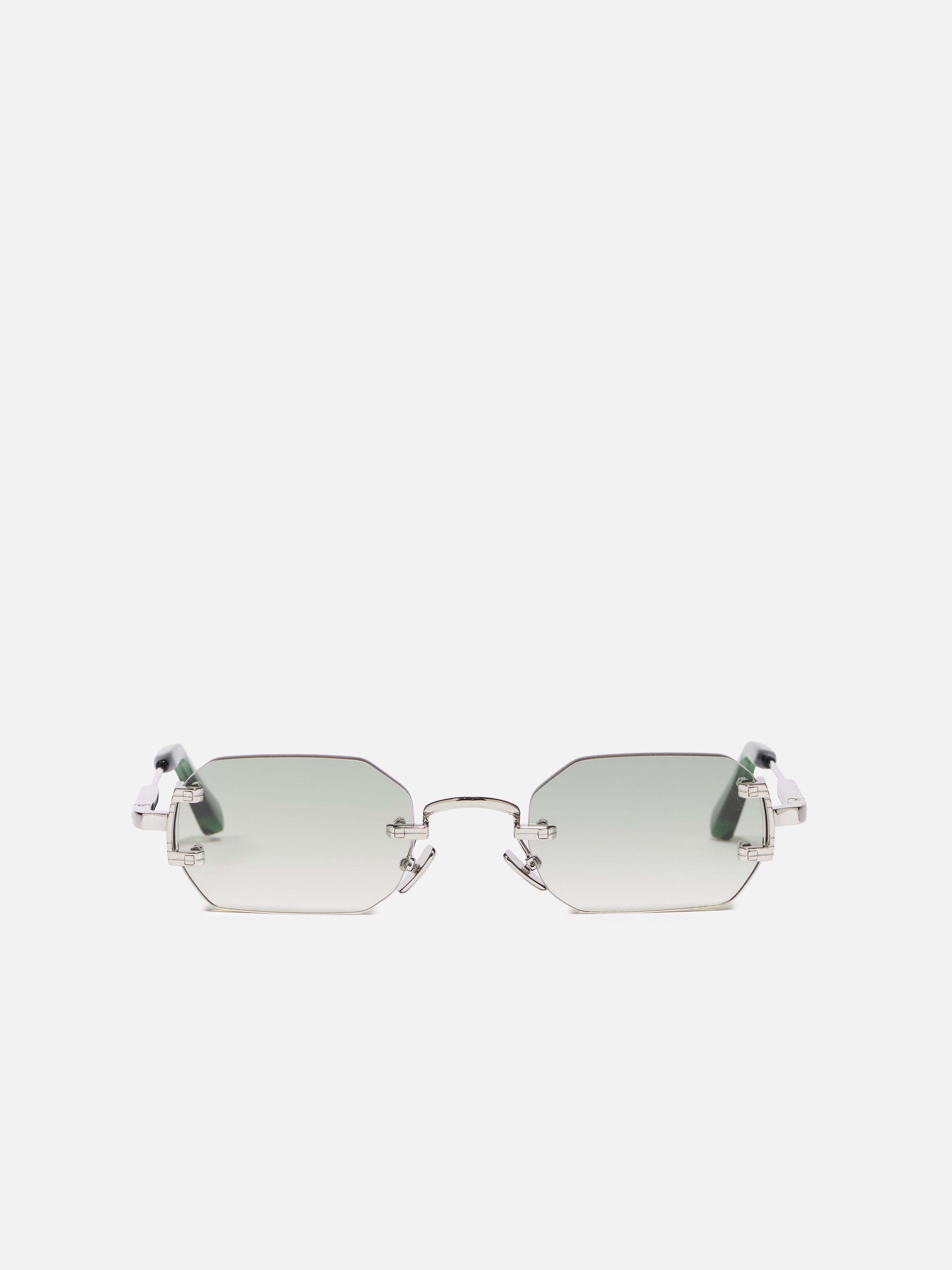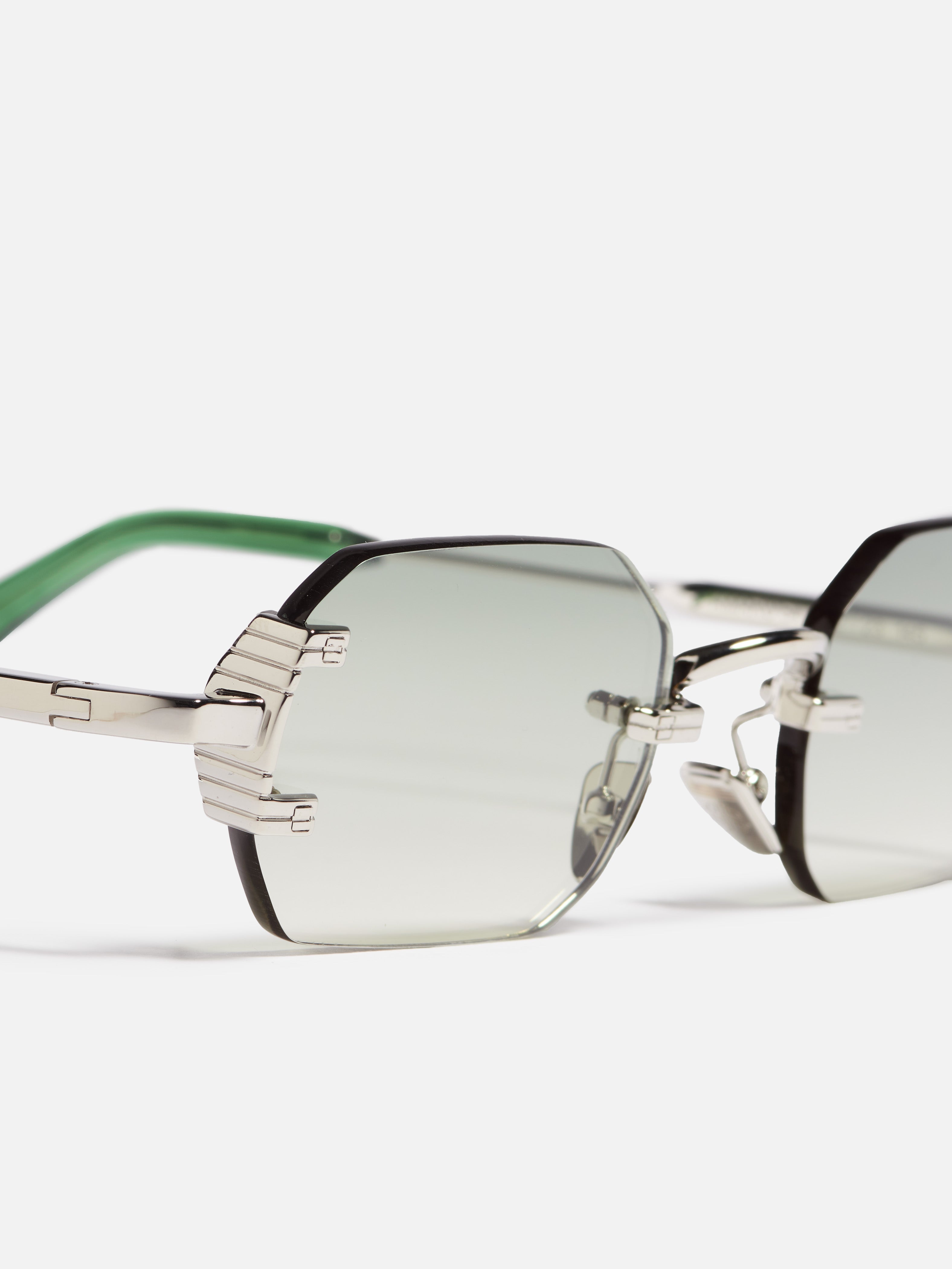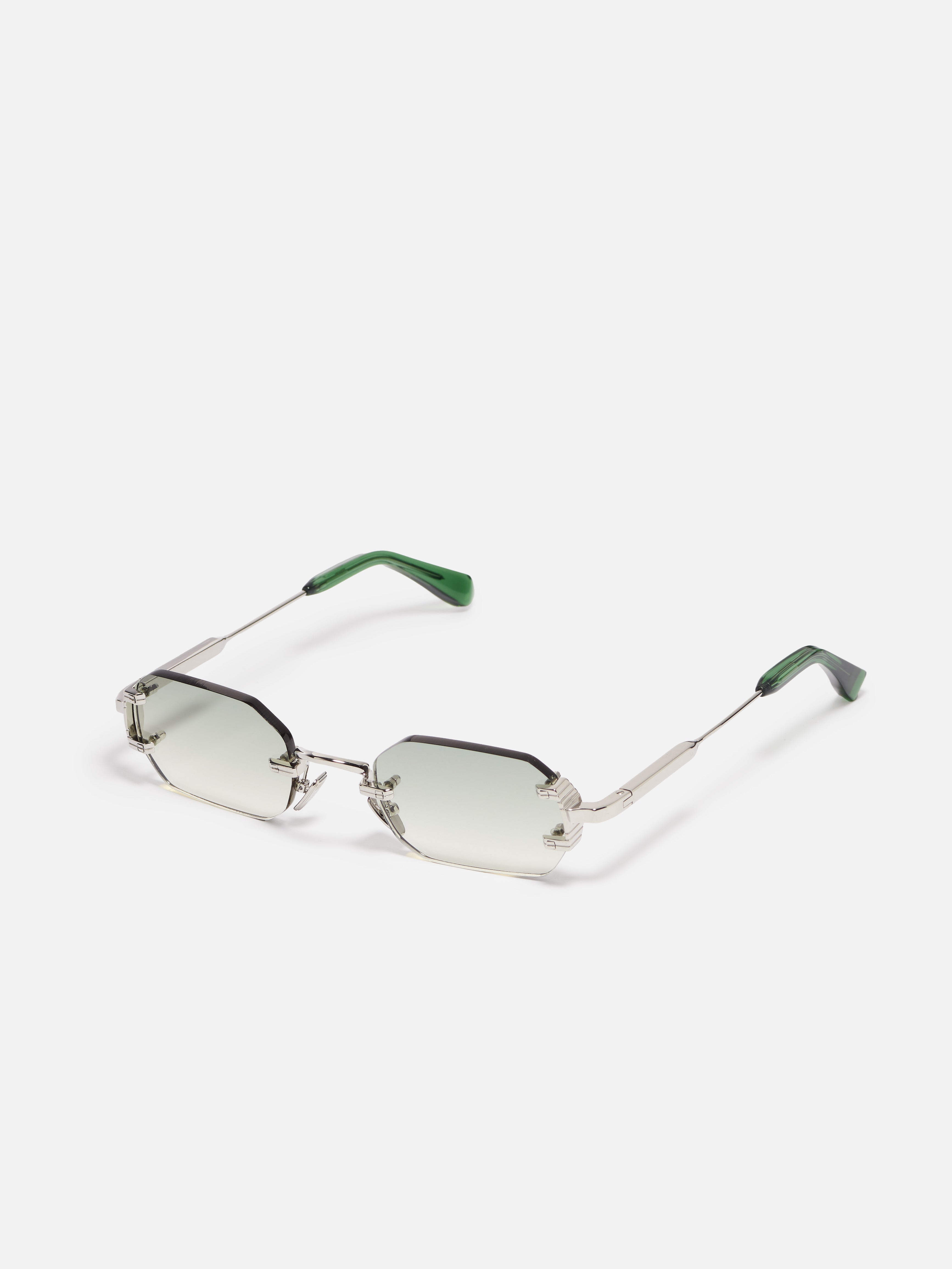 The metal corewire is made of stainless steel with a silver plating (3µ). Temple tips in translucent green acetate. Nose pads silver colored. Grey gradient nylon lenses (3.8mm thick) with anti-reflective (AR) coating on the inner surface.