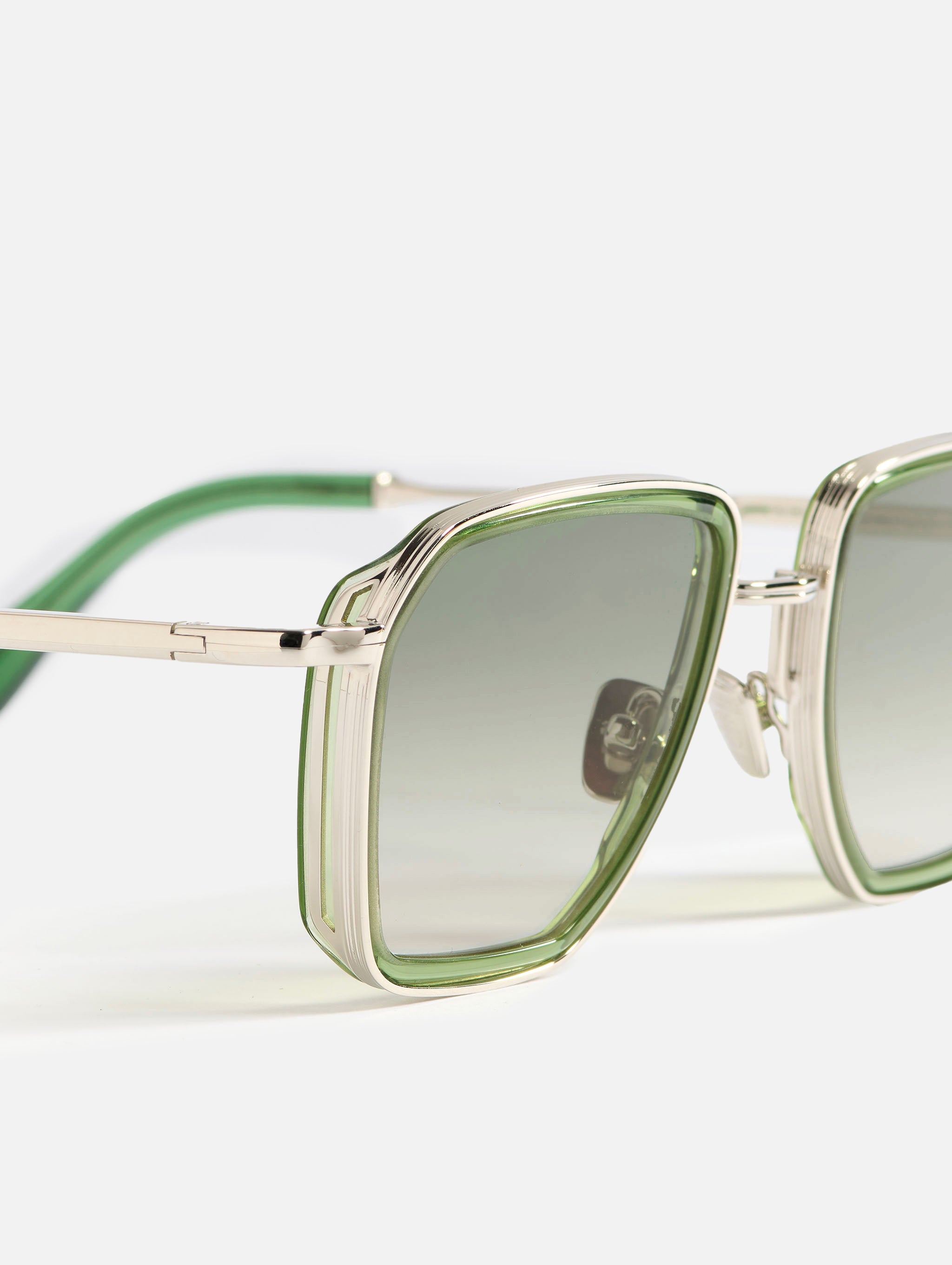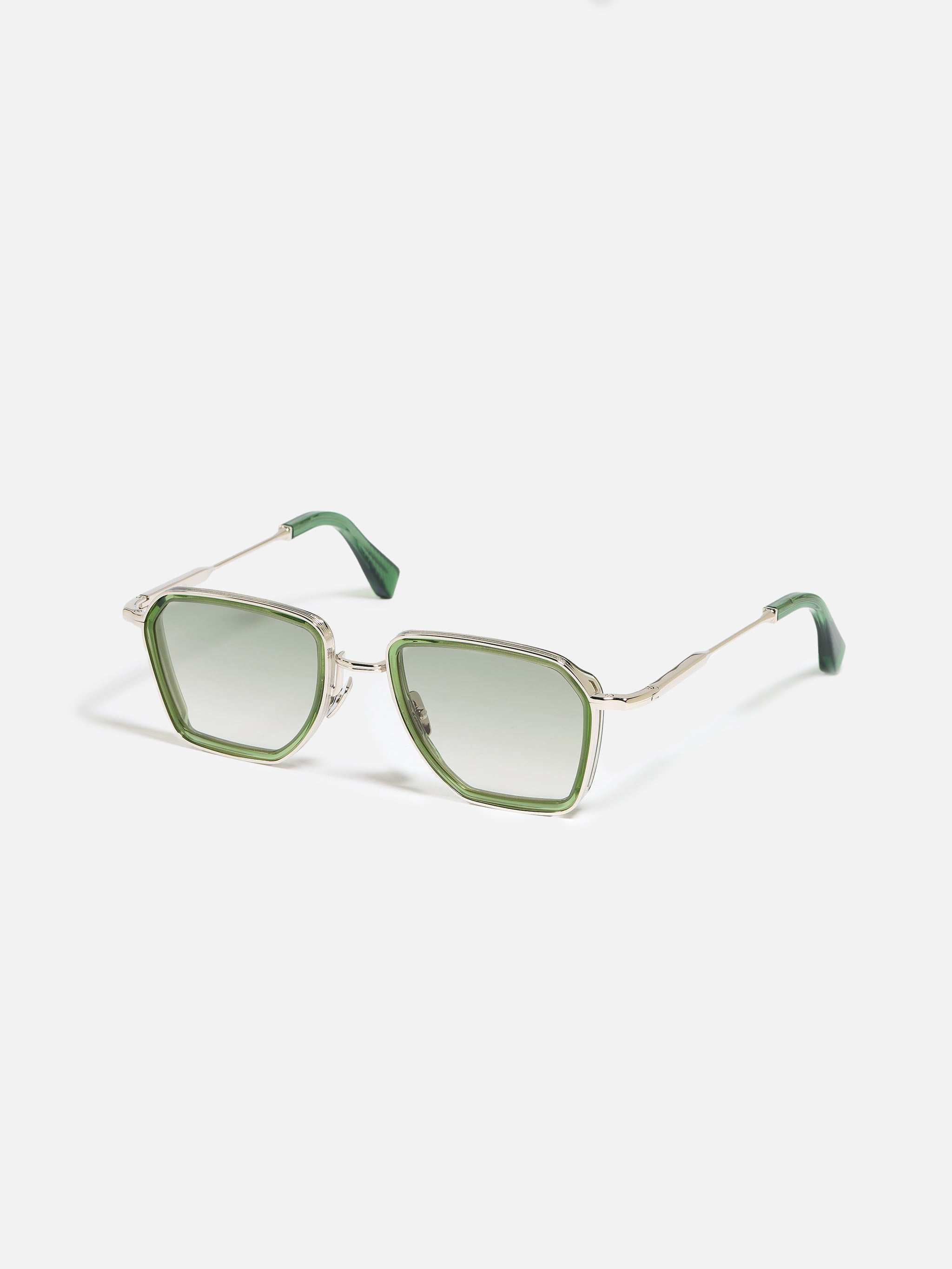 Masculine square frame combining metal and acetate. It features a reinforced bridge and end pieces. The frame includes titanium nose pads and acetate temple tips embossed with the John Dalia signature.