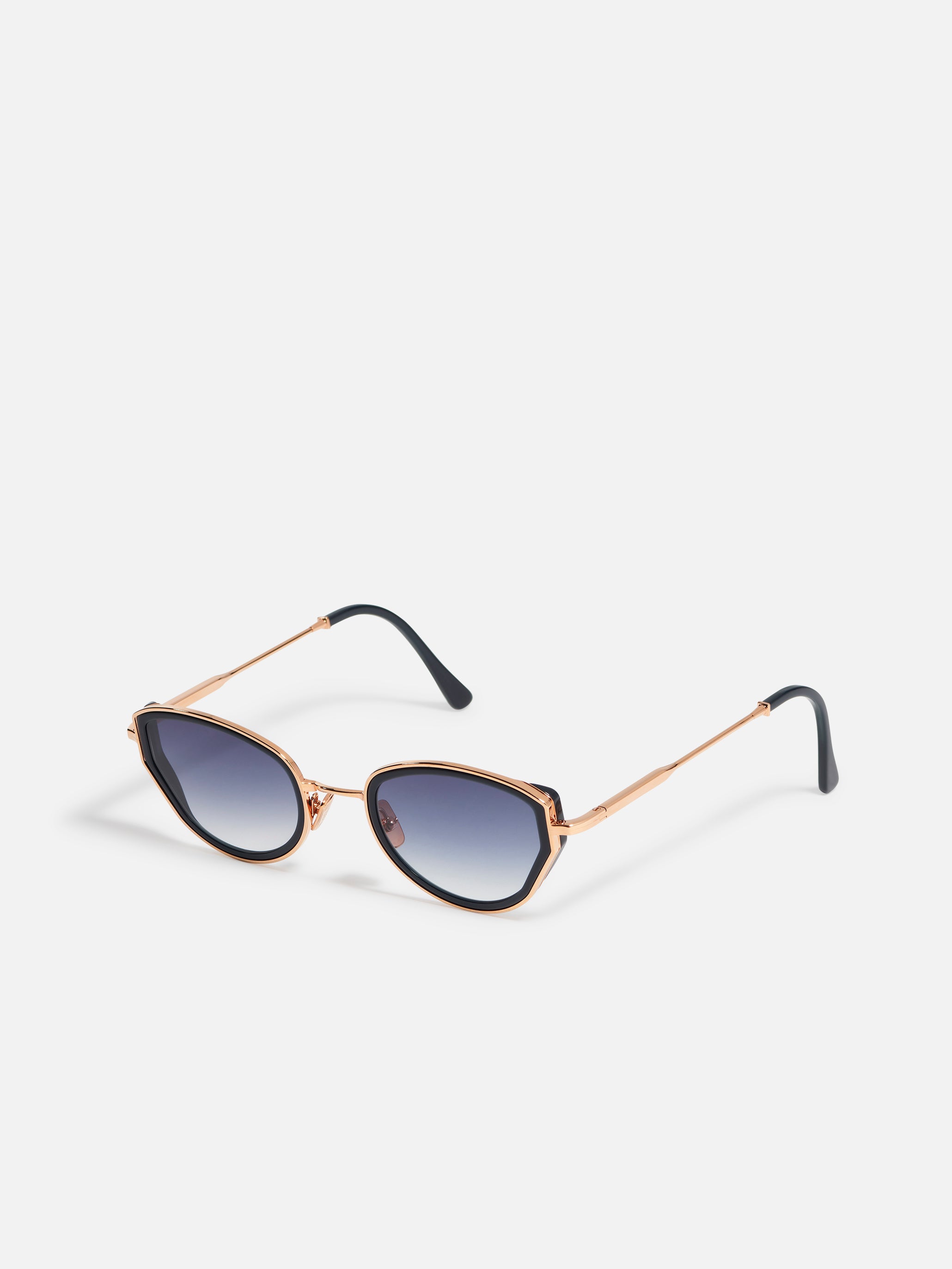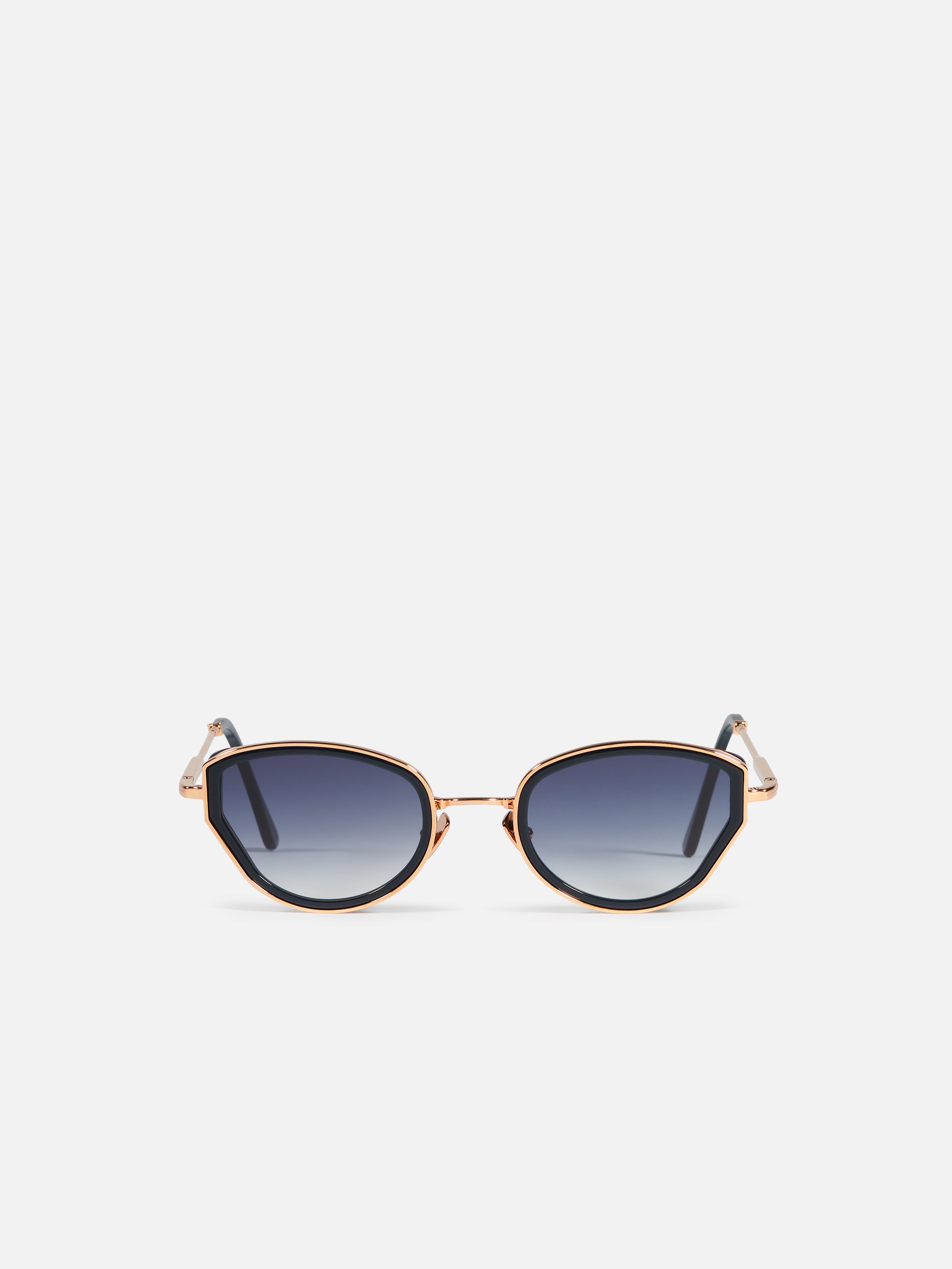 The metal corewire is made of stainless steel frame with a rose gold plating (5µ, with a jeweler’s stamp inside the temple). Temple tips and eye rims in Navy blue acetate.