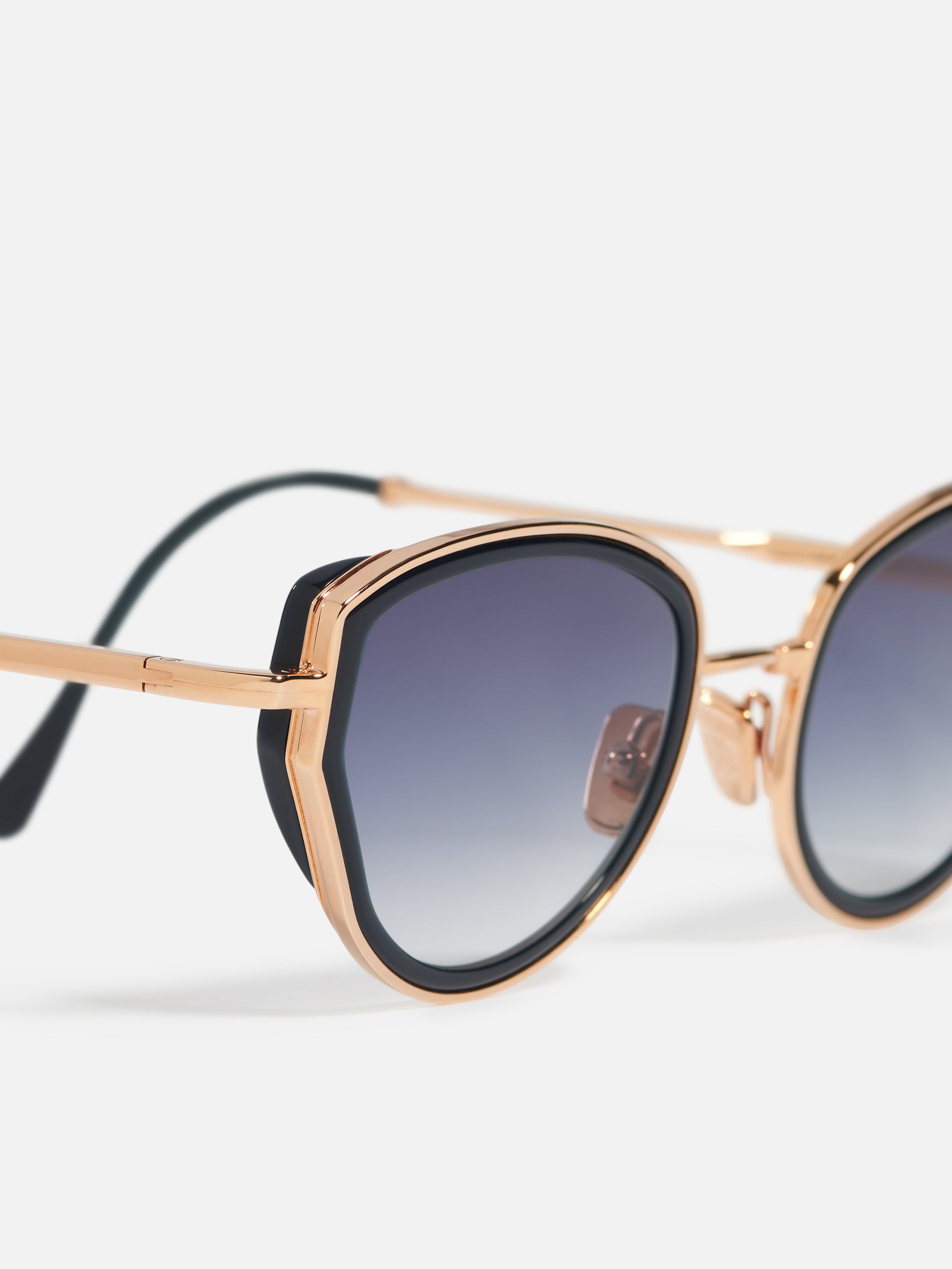 Feminine cat eye frame combining metal and acetate. The frame includes titanium nose pads and acetate temple tips embossed with the John Dalia signature.