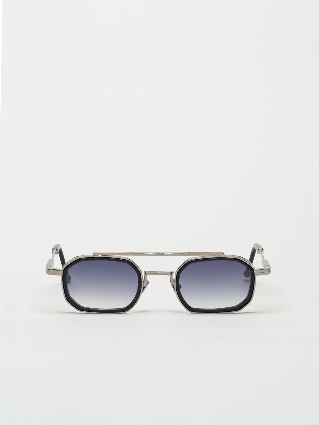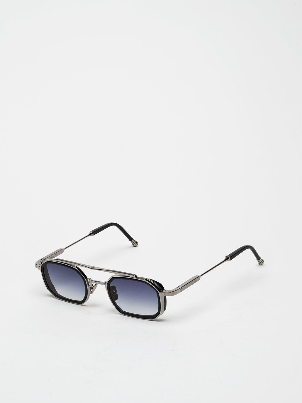Masculine aviator frame in a rectangular shape, combining metal and acetate. It features titanium nose pads and acetate temple tips embossed with the John Dalia signature.