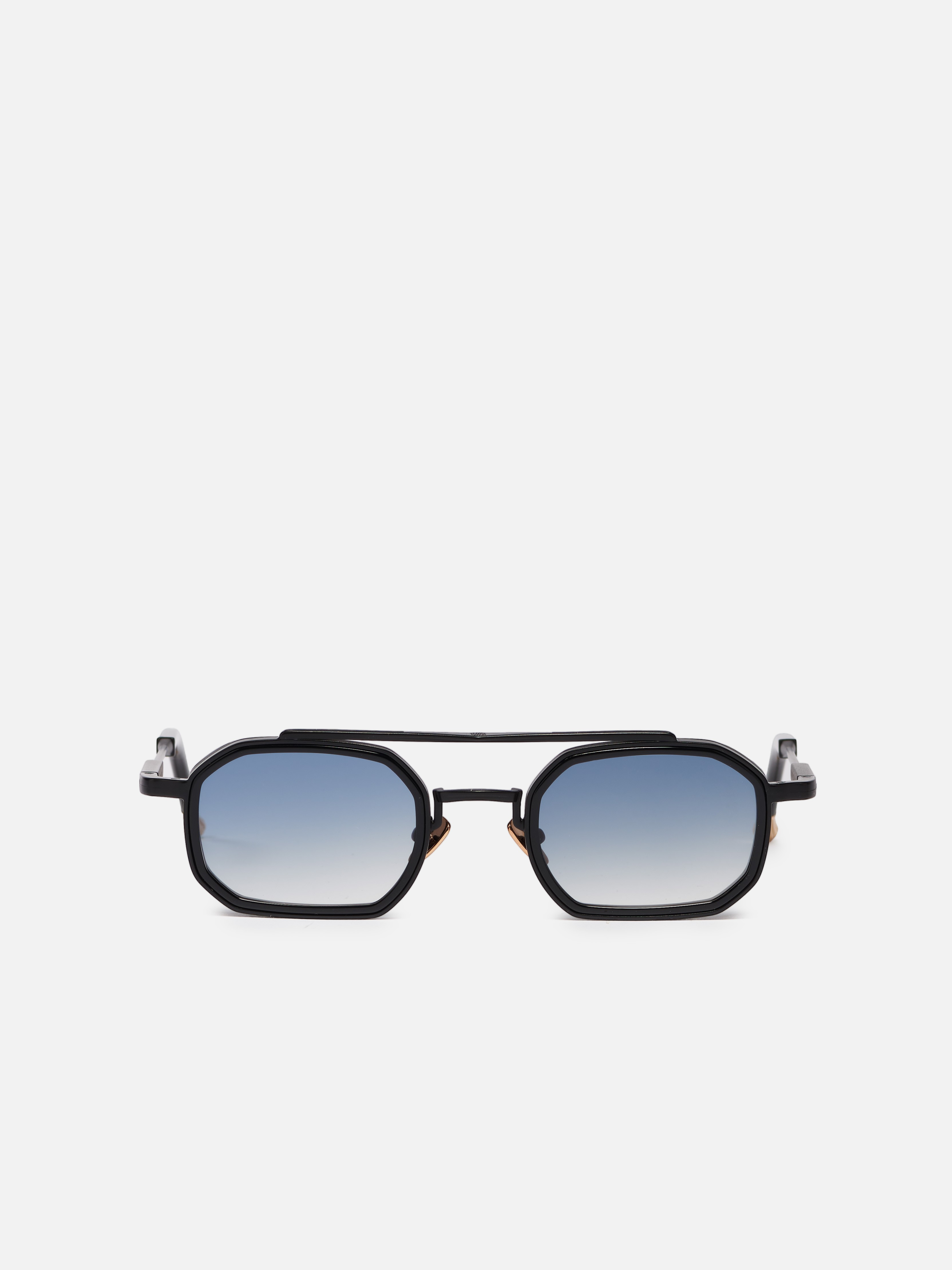 Masculine aviator frame in a rectangular shape, combining metal and acetate. It features titanium nose pads and acetate temple tips embossed with the John Dalia signature.