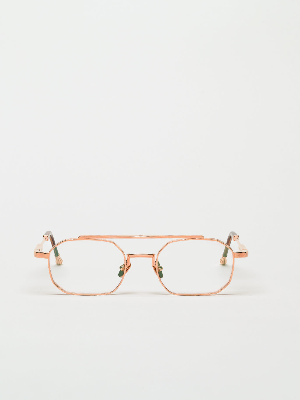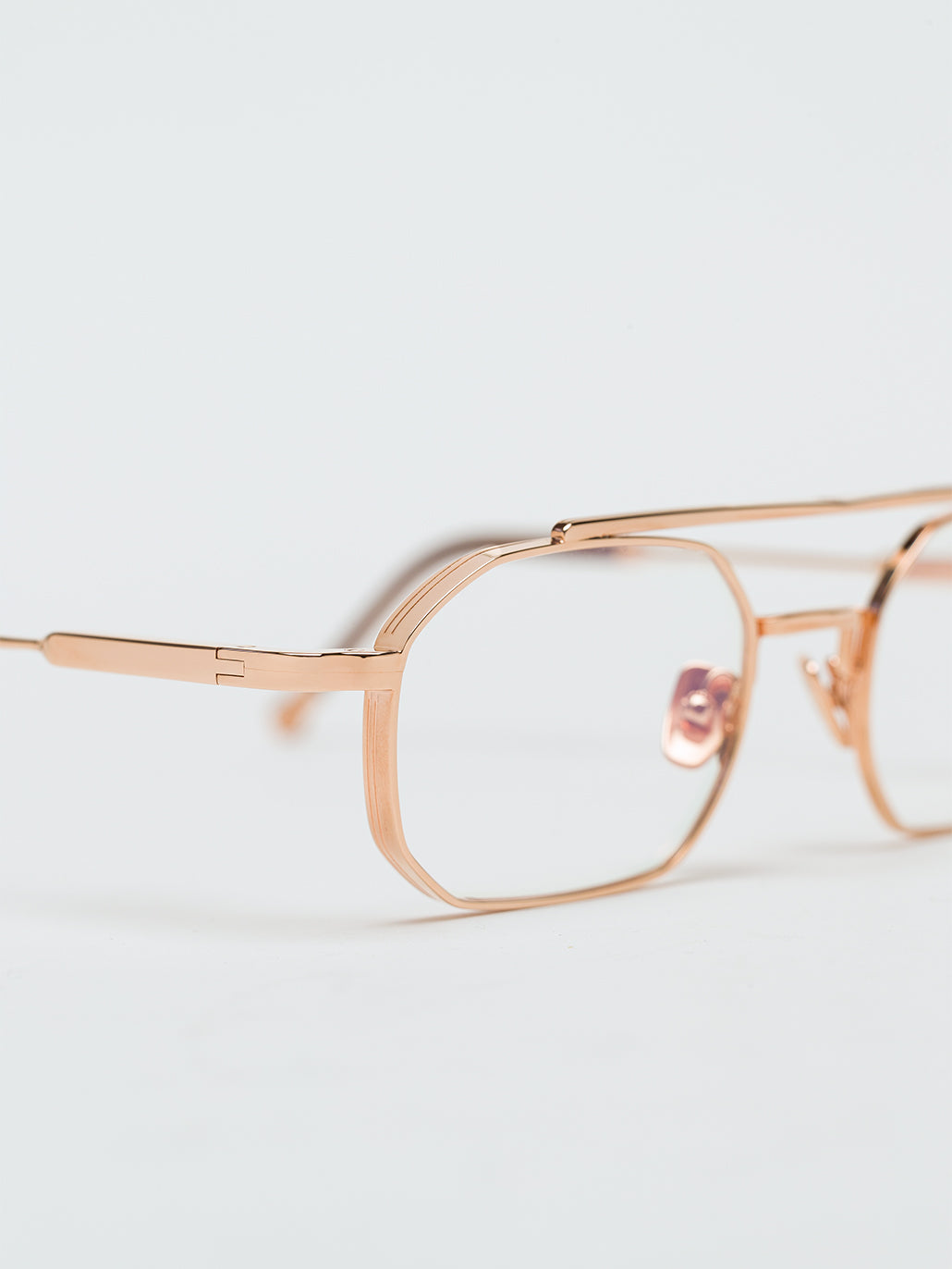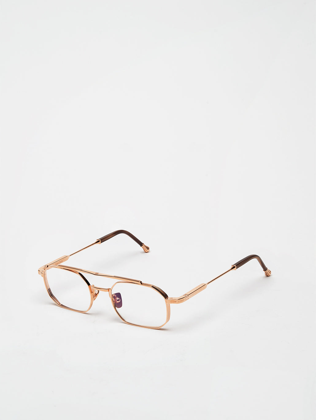 A unisex rectangular shape with 4mm streak-engraved metal. The frame is enlivened by our new signature temples featuring John Dalia’s engraved end pieces. Custom mocha acetate on temples & 22-carat rose gold-plated alloy frame (c. 5µ layer and jewelry stamp inside the temple). Demonstration CR39 lenses. Reference O-511. Case and cleaning cloth are included.