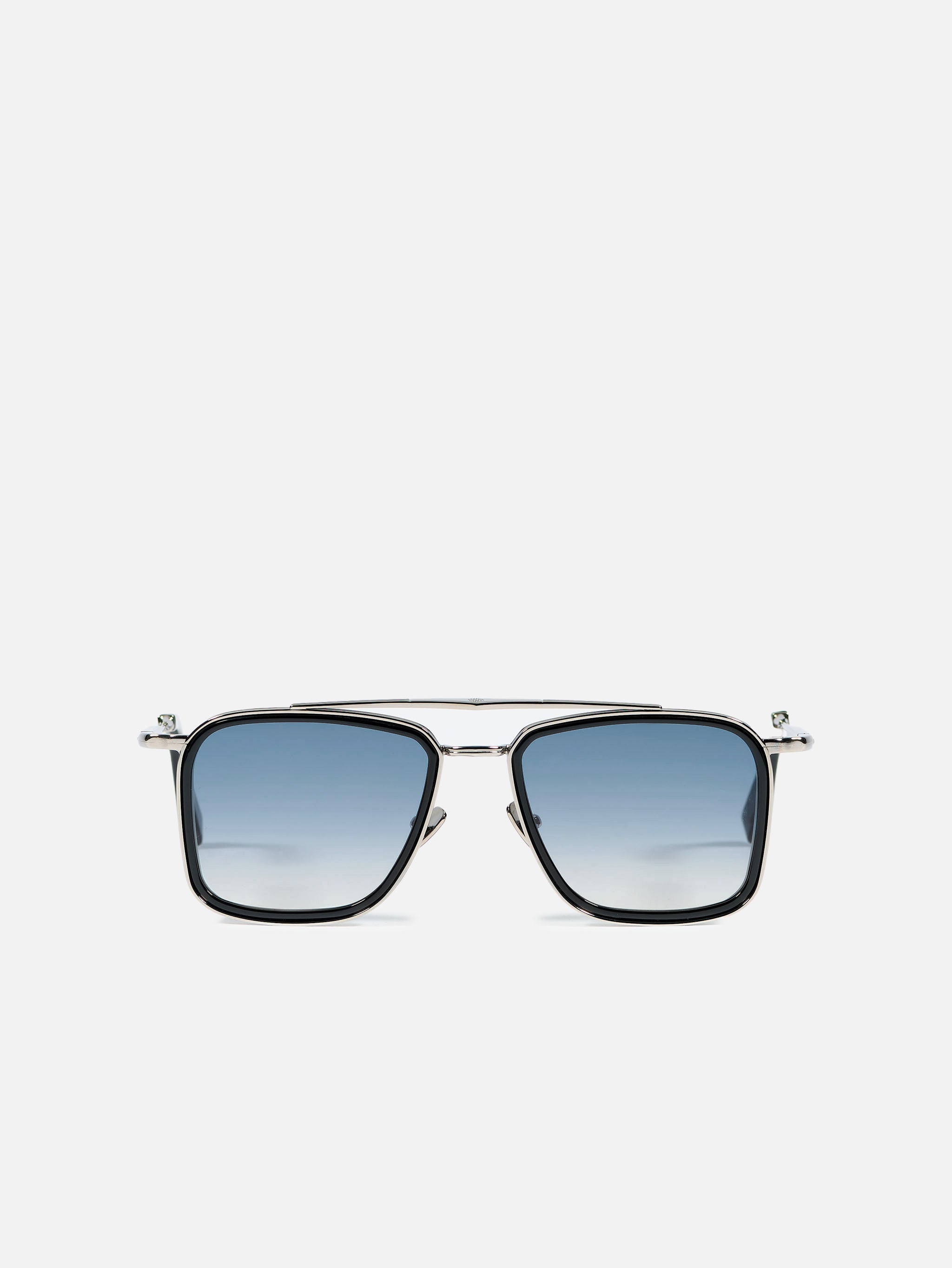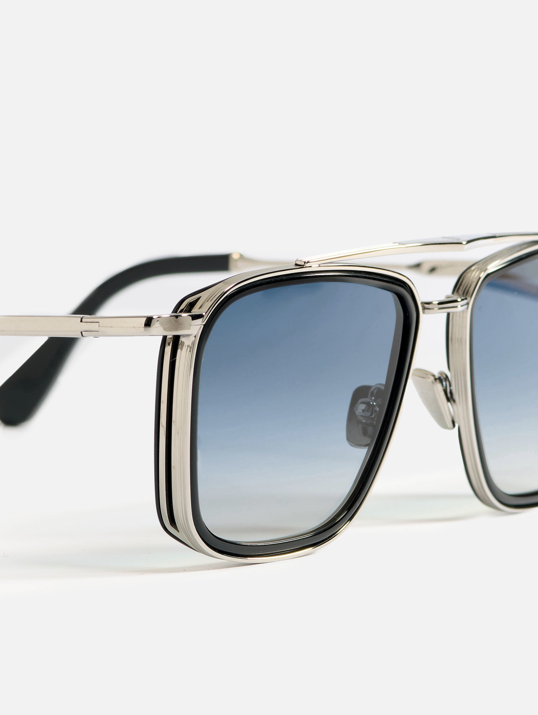 A unisex oversize rectangular shape with rims carved out of a 4mm engraved metal strip. The frame is enlivened by our new geometric bridge and features traditional end pieces. Custom infinite black acetate & ruthenium plated alloy frame (c. 3µ layer). Clear blue gradient CR39 lenses with AR treatment. Reference C-107. Case and cleaning cloth are included.