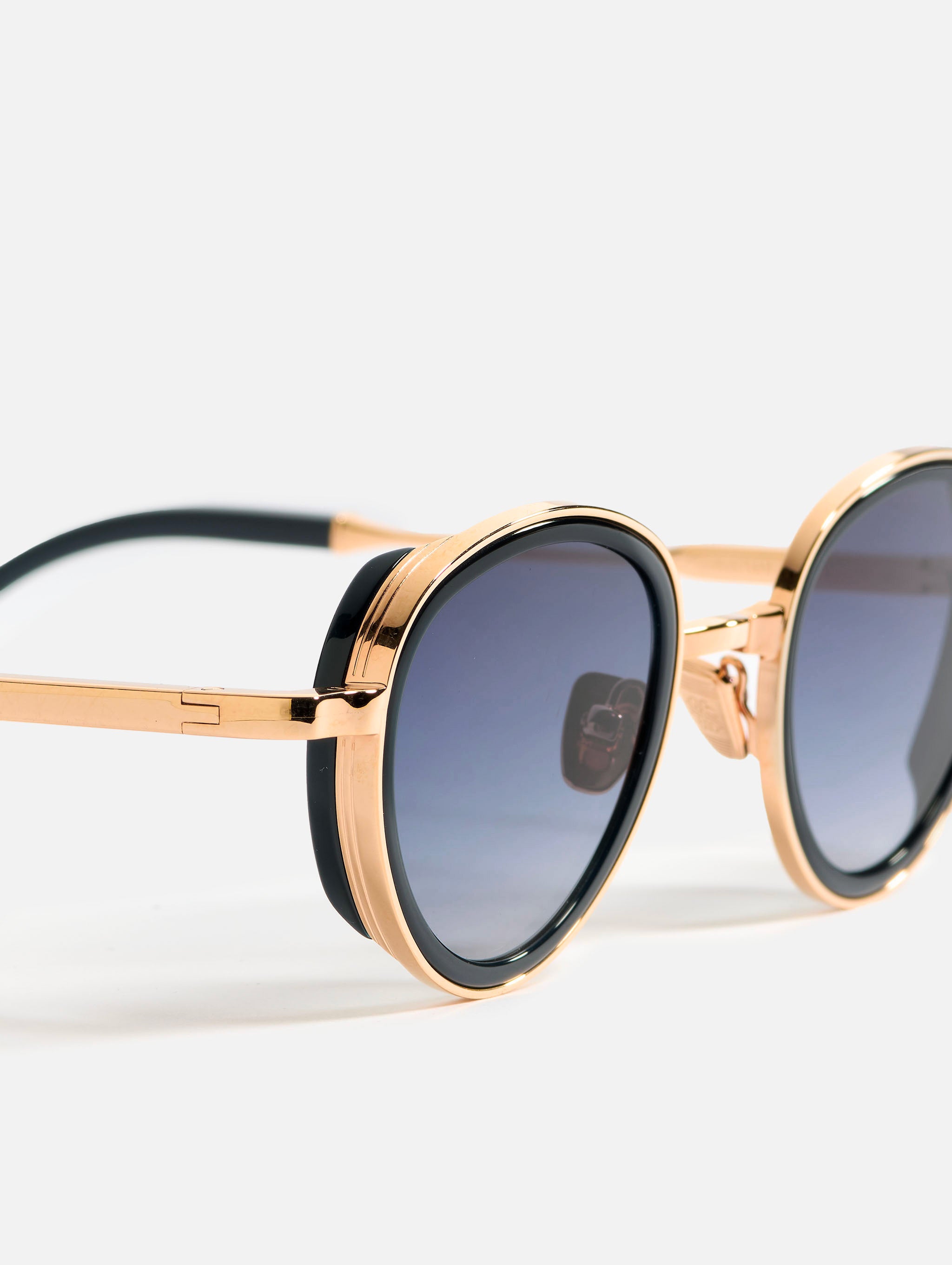 The metal corewire is made of stainless steel frame with a rose gold plating (5µ, with a jeweler’s stamp inside the temple). Temple tips and eye rims in navy blue acetate.