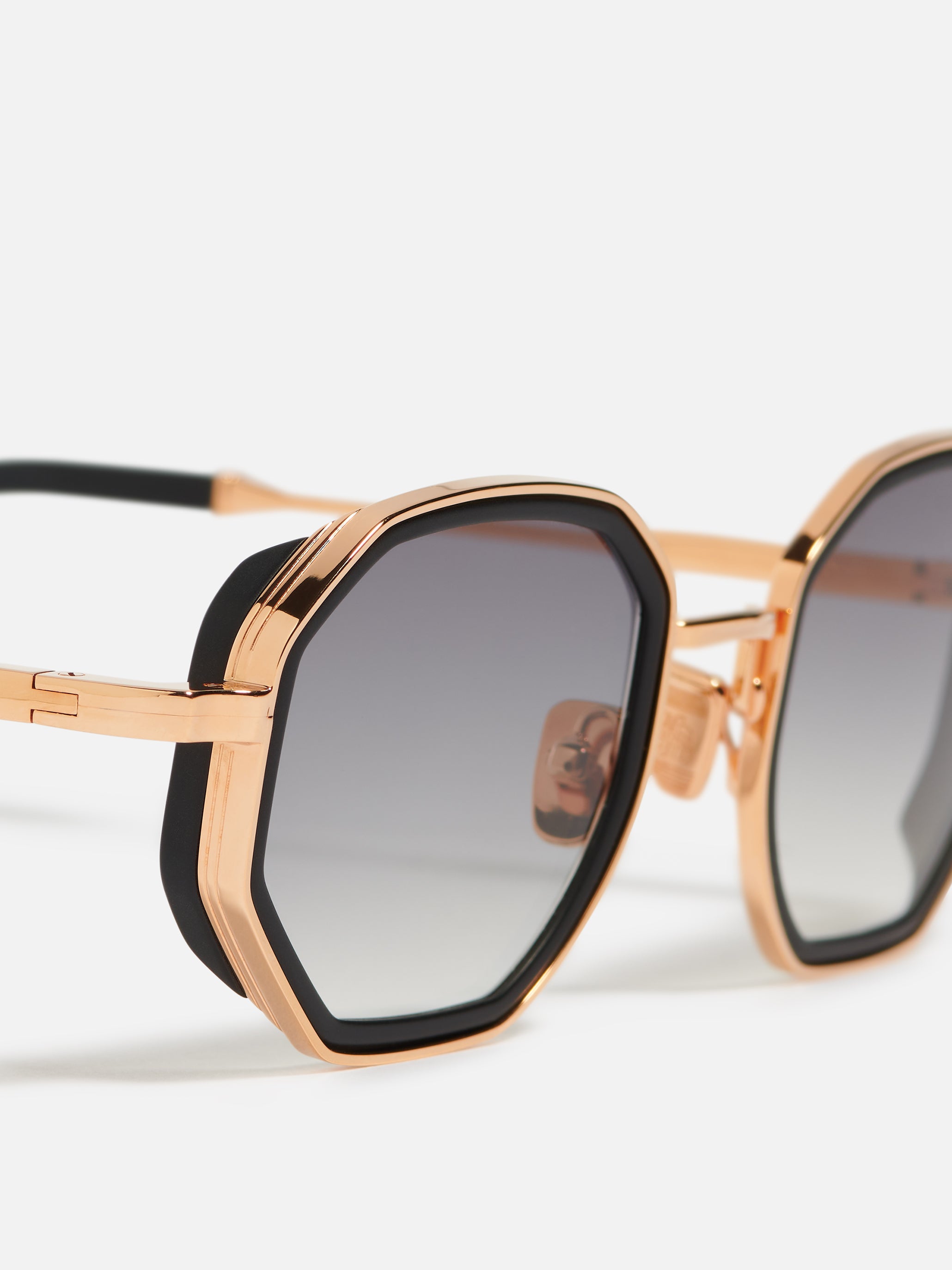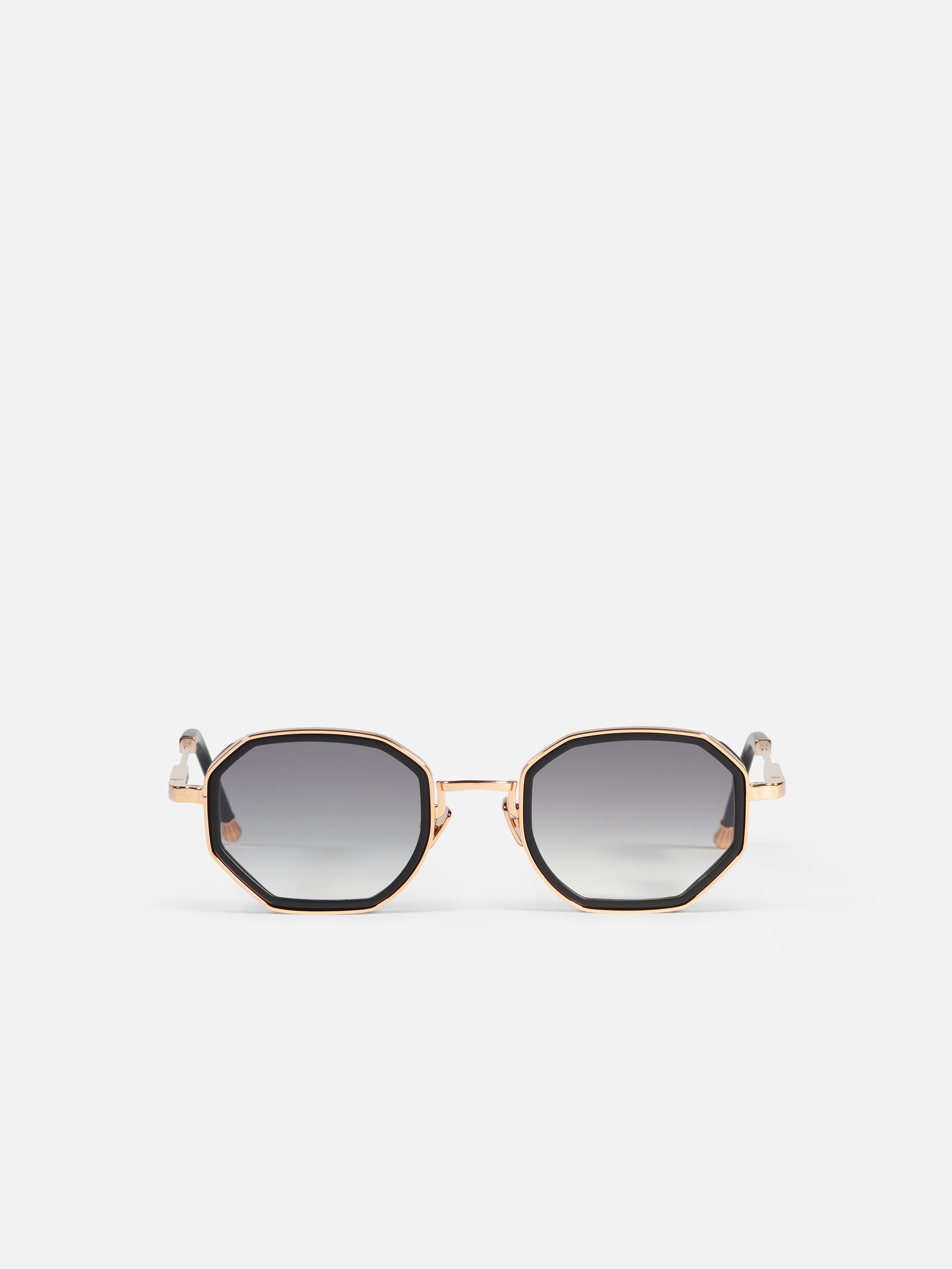 A unisex octagonal shape with acetate rims cut that stands out from the 4mm streak-engraved metal. The frame is enlivened by our new signature temples featuring John Dalia’s engraved end pieces. Custom matte black acetate & 22-carat rose gold-plated alloy frame (c. 5µ layer and jewelry stamp inside the temple). Grey gradient CR39 lenses with AR treatment. Reference C-114. Case and cleaning cloth are included.