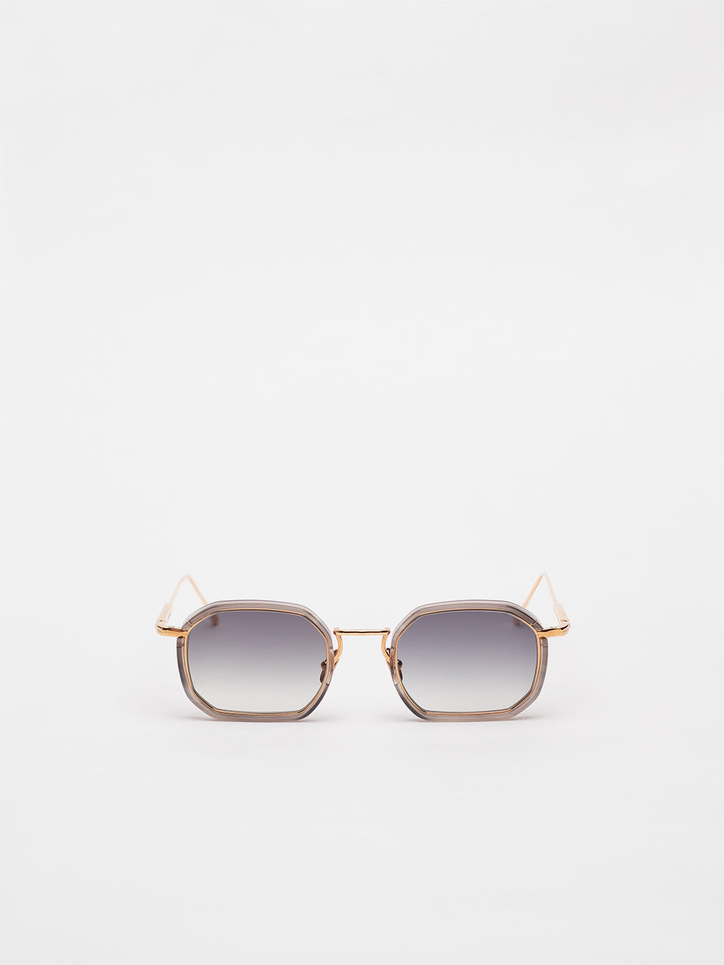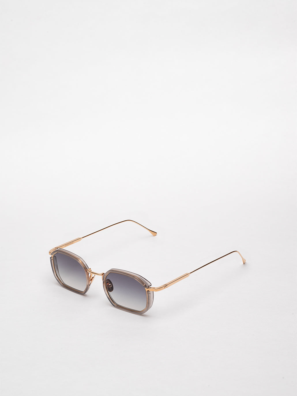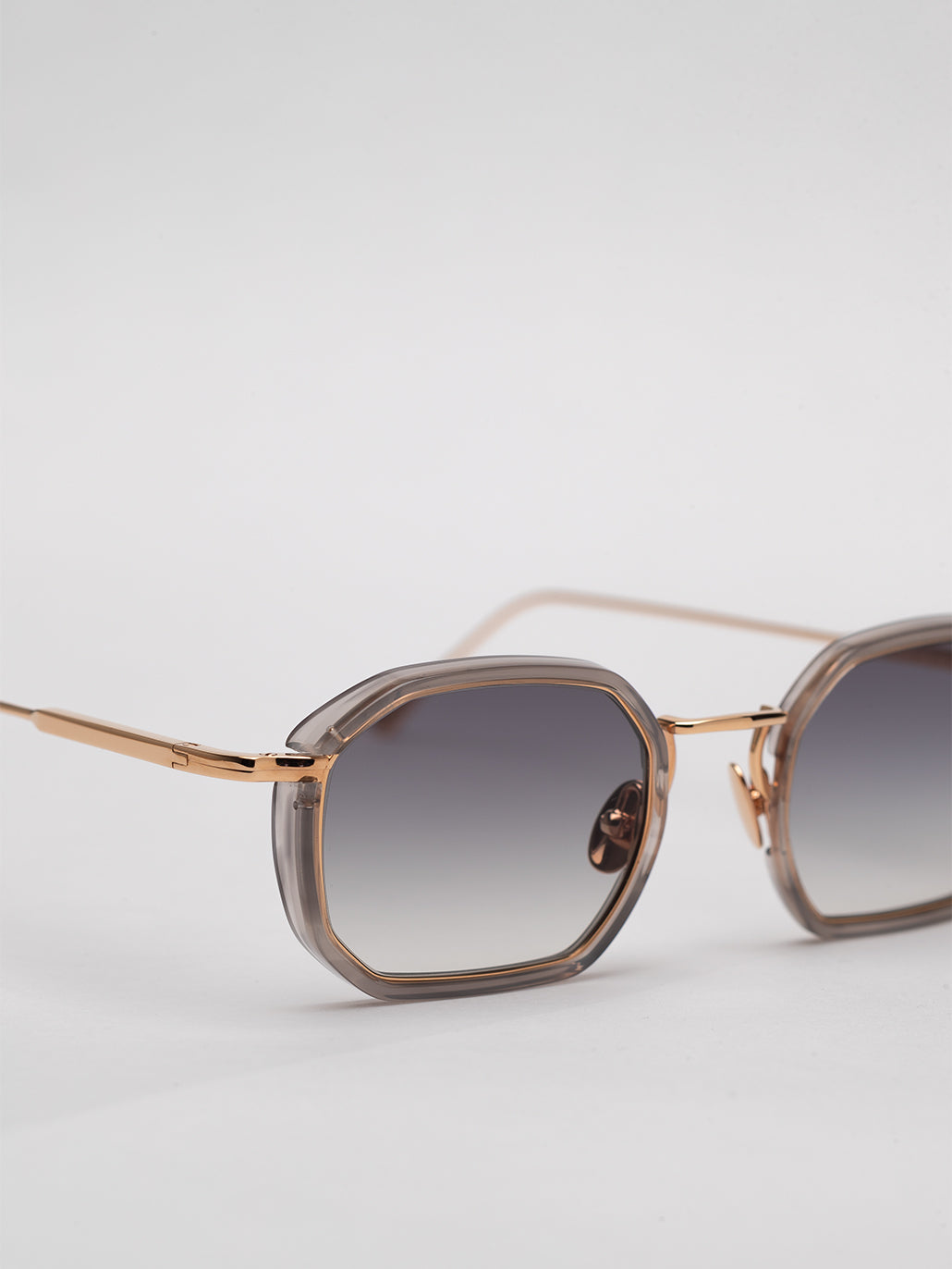 The metal corewire is made of stainless steel frame with a rose gold plating (5µ, with a jeweler’s stamp inside the temple). Temple tips and eye rims in workman grey acetate