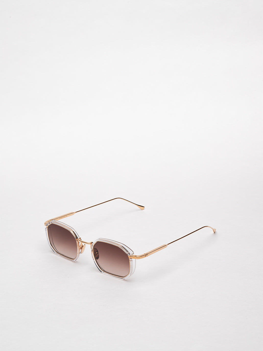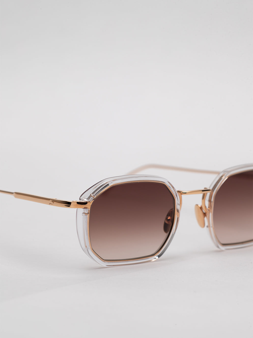 The metal corewire is made of stainless steel frame with a rose gold plating (5µ, with a jeweler’s stamp inside the temple). Temple tips and eye rims in crystal acetate