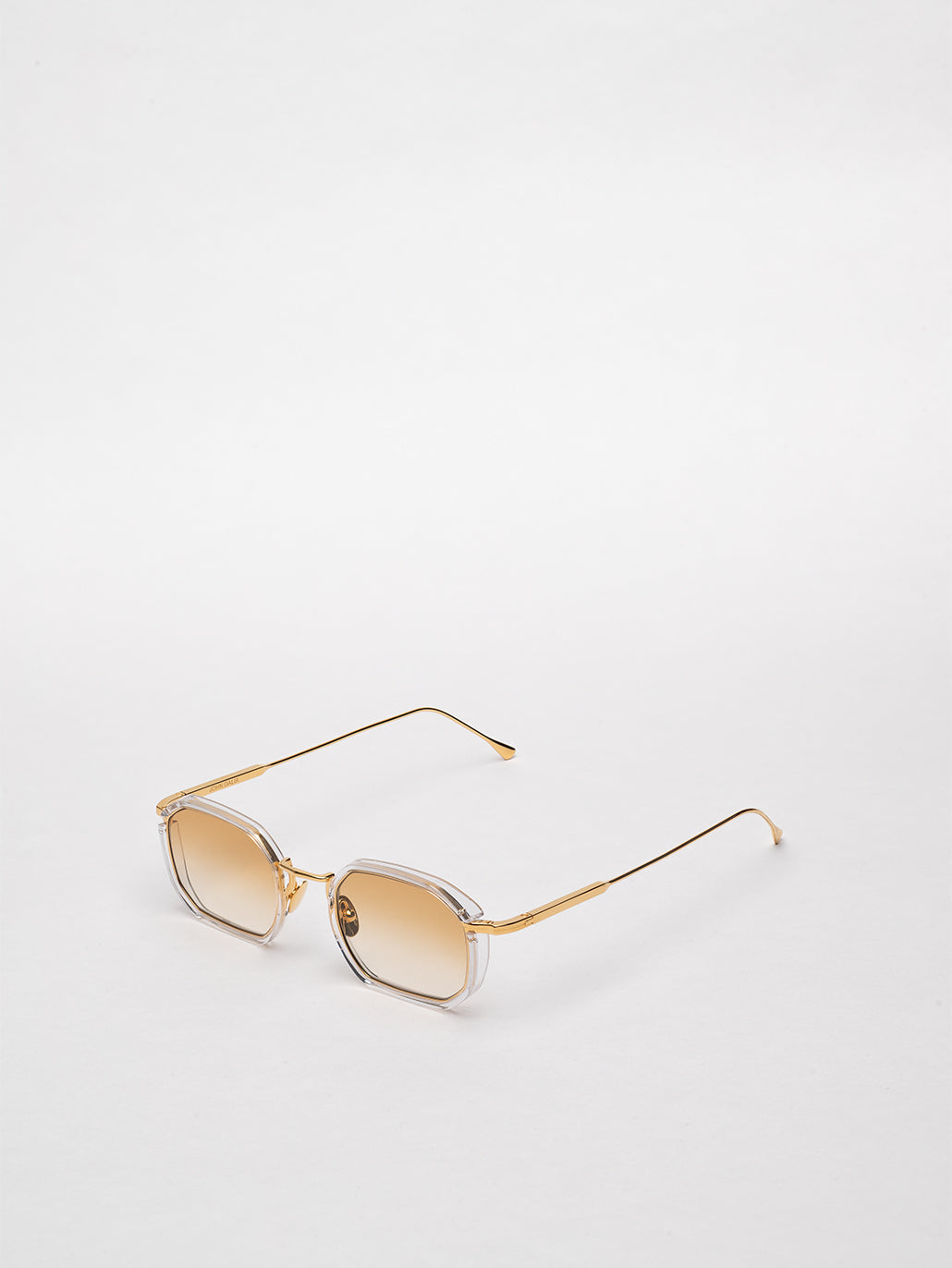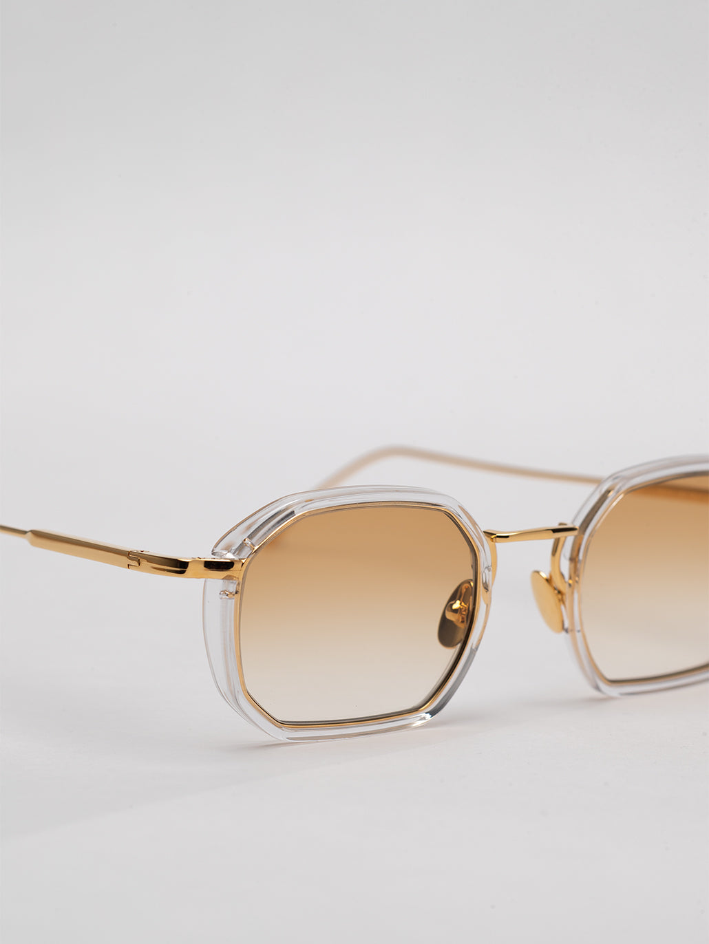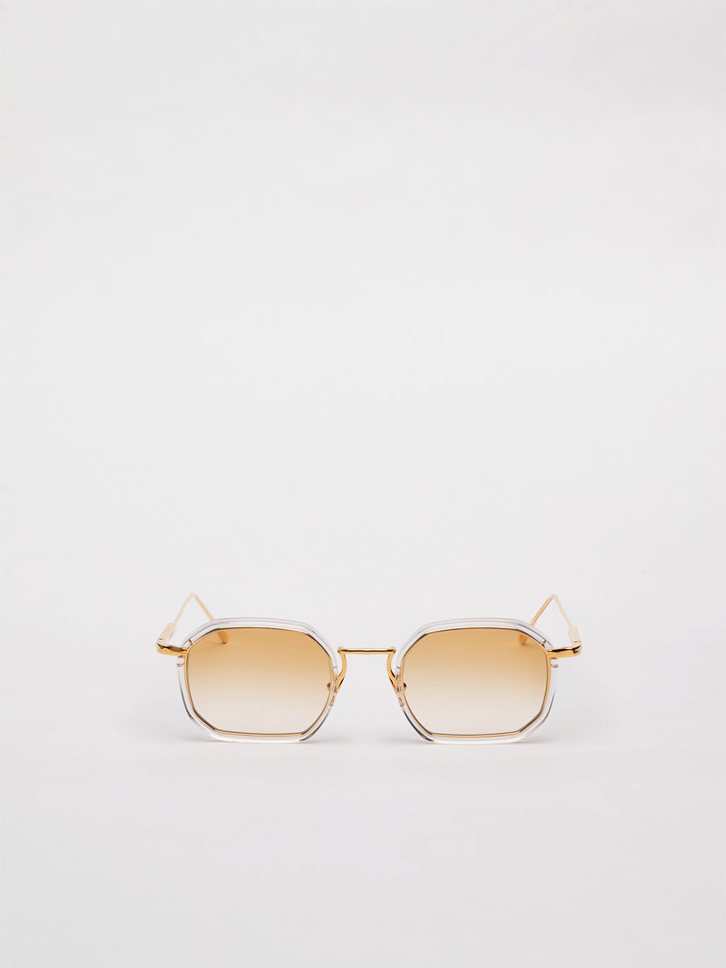 The metal corewire is made of stainless steel frame with a yellow gold plating (5µ, with a jeweler’s stamp inside the temple). Temple tips and eye rims in crystal acetate
