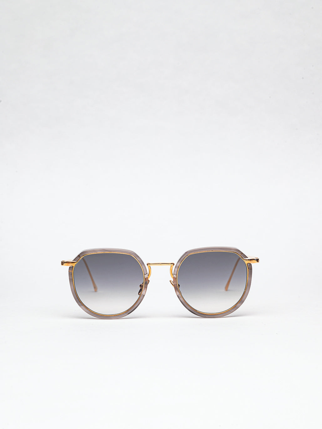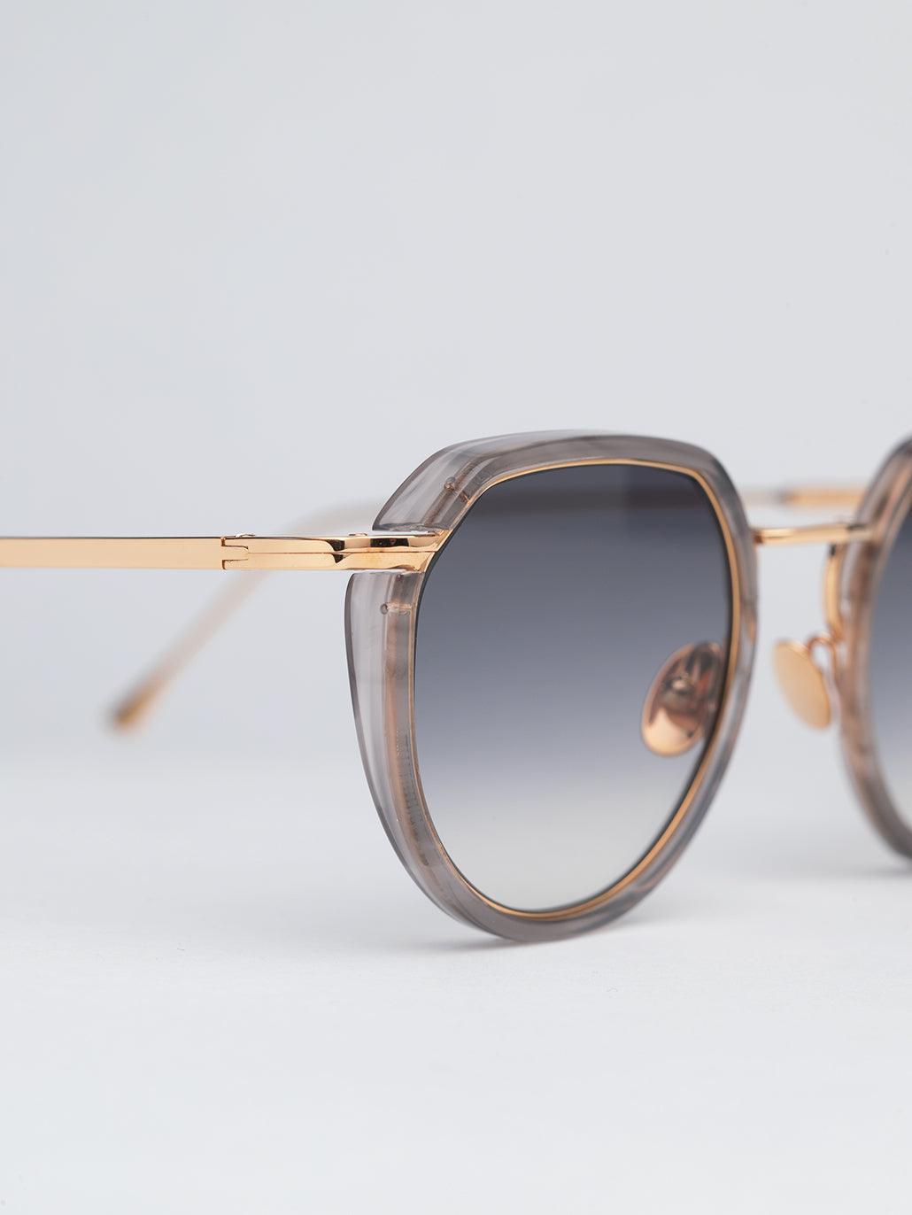 The metal corewire is made of stainless steel frame with a rose gold plating (5µ, with a jeweler’s stamp inside the temple). Temple tips and eye rims in workman grey acetate