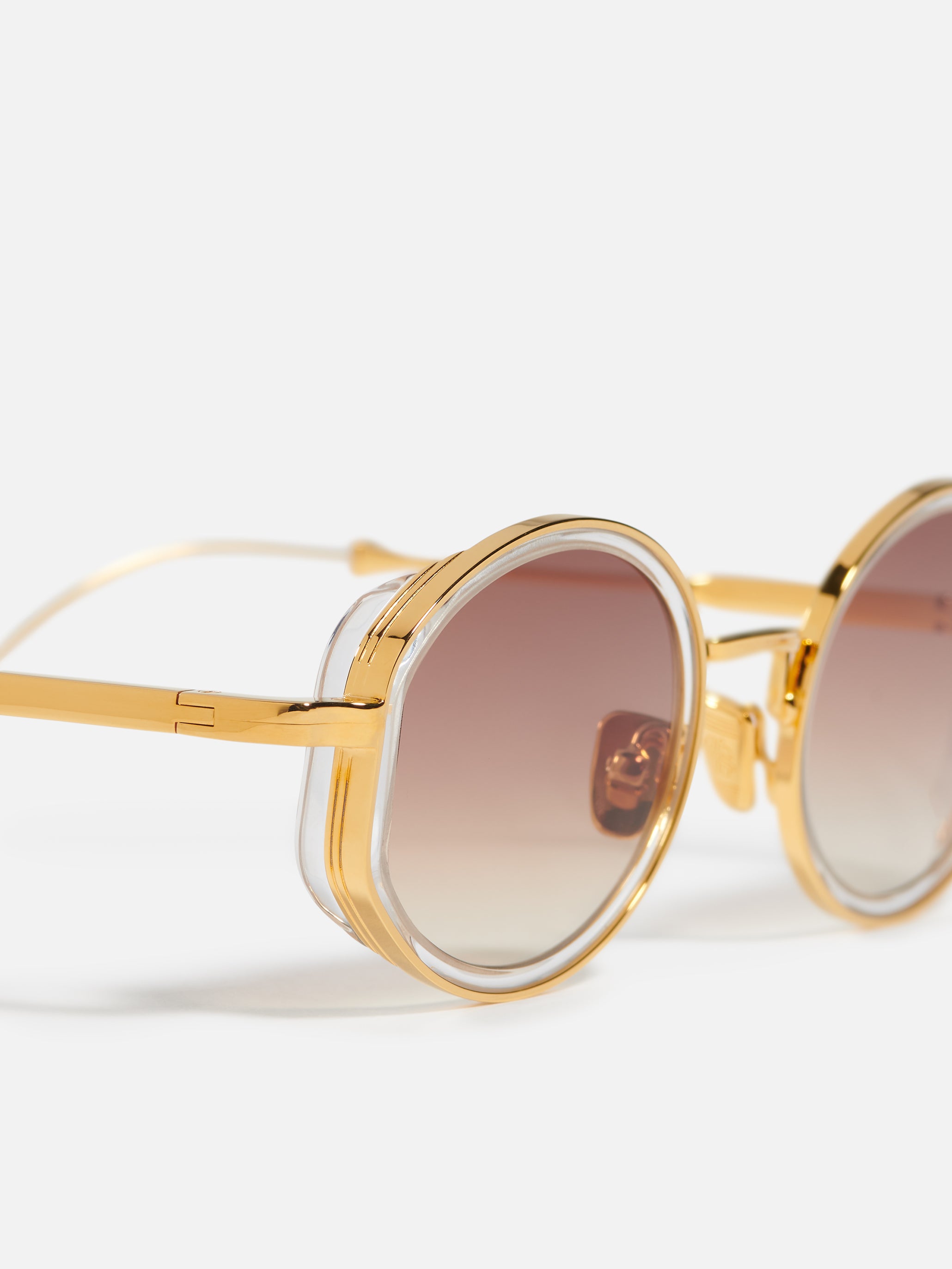 The metal corewire is made of stainless steel with rose gold plating (5µ and jeweler's stamp on the inner side of the temples). With engraved end pieces and custom crystal acetate rims. Signature temples enhance the design with intricate detailing.