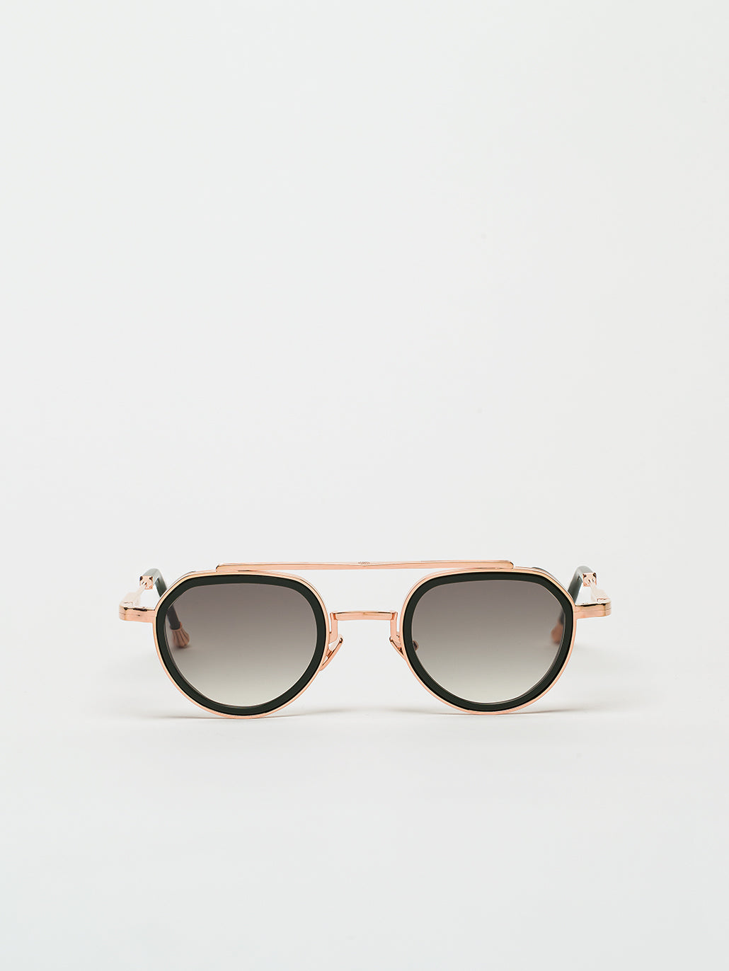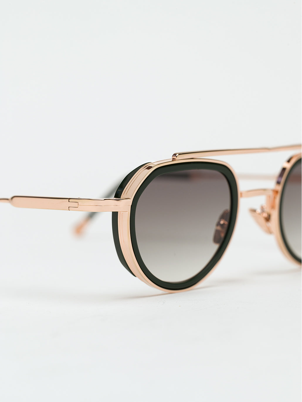 A unisex oval aviator shape with acetate rims cut that stands out from the 4mm streak-engraved metal. The frame is enlivened by our new signature temples featuring John Dalia’s engraved end pieces. Custom Green Racing acetate & 22-carat rose gold-plated alloy frame (c. 5µ layer and jewelry stamp inside the temple). G15 gradient CR39 lenses with AR treatment. Reference C-195. Case and cleaning cloth are included.