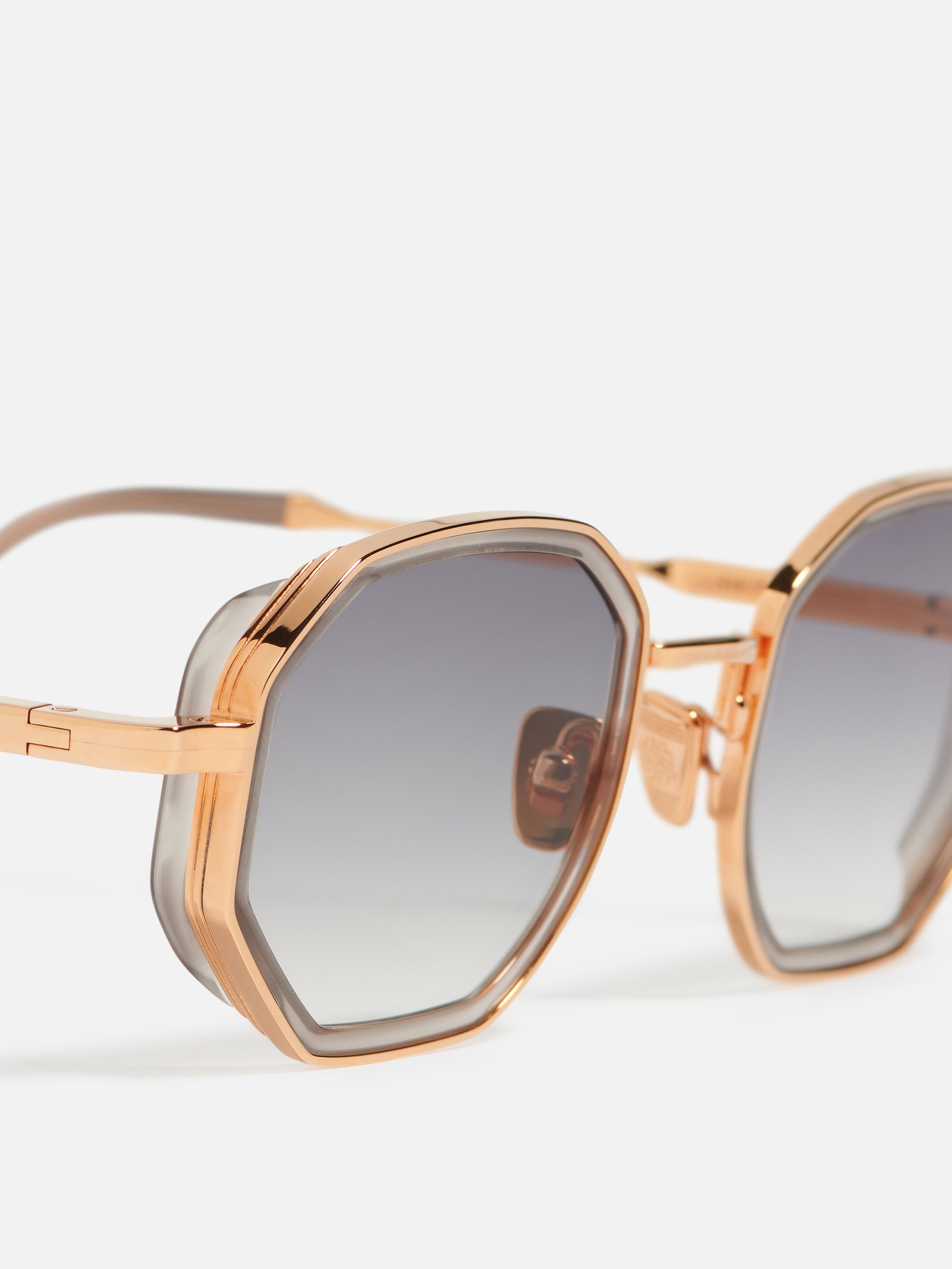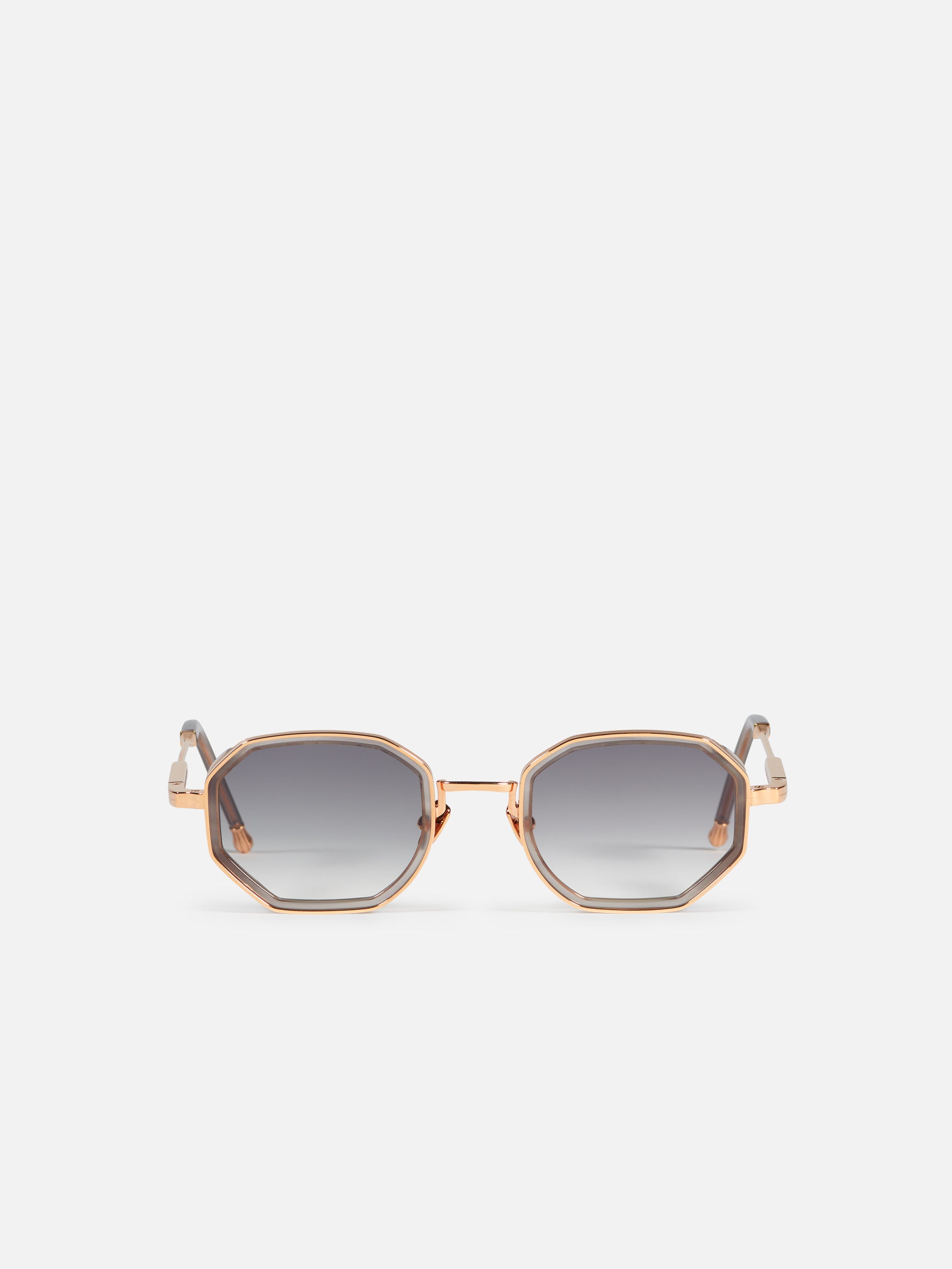 A unisex octagonal shape with acetate rims cut that stands out from the 4mm streak-engraved metal. The frame is enlivened by our new signature temples featuring John Dalia’s engraved end pieces. Custom workman grey acetate & 22-carat rose gold-plated alloy frame (c. 5µ layer and jewelry stamp inside the temple). Grey gradient CR39 lenses with AR treatment. Reference C-154. Case and cleaning cloth are included.