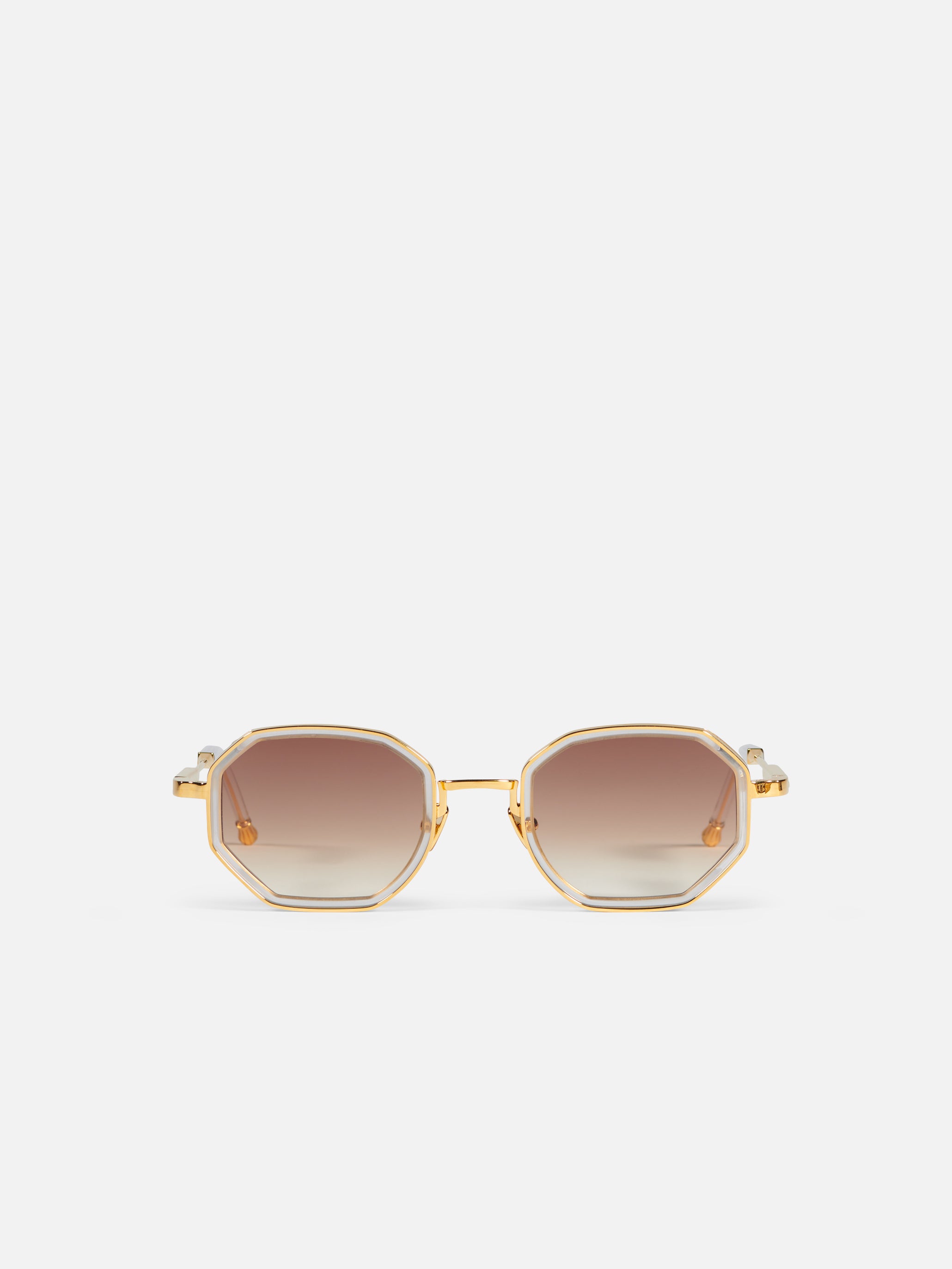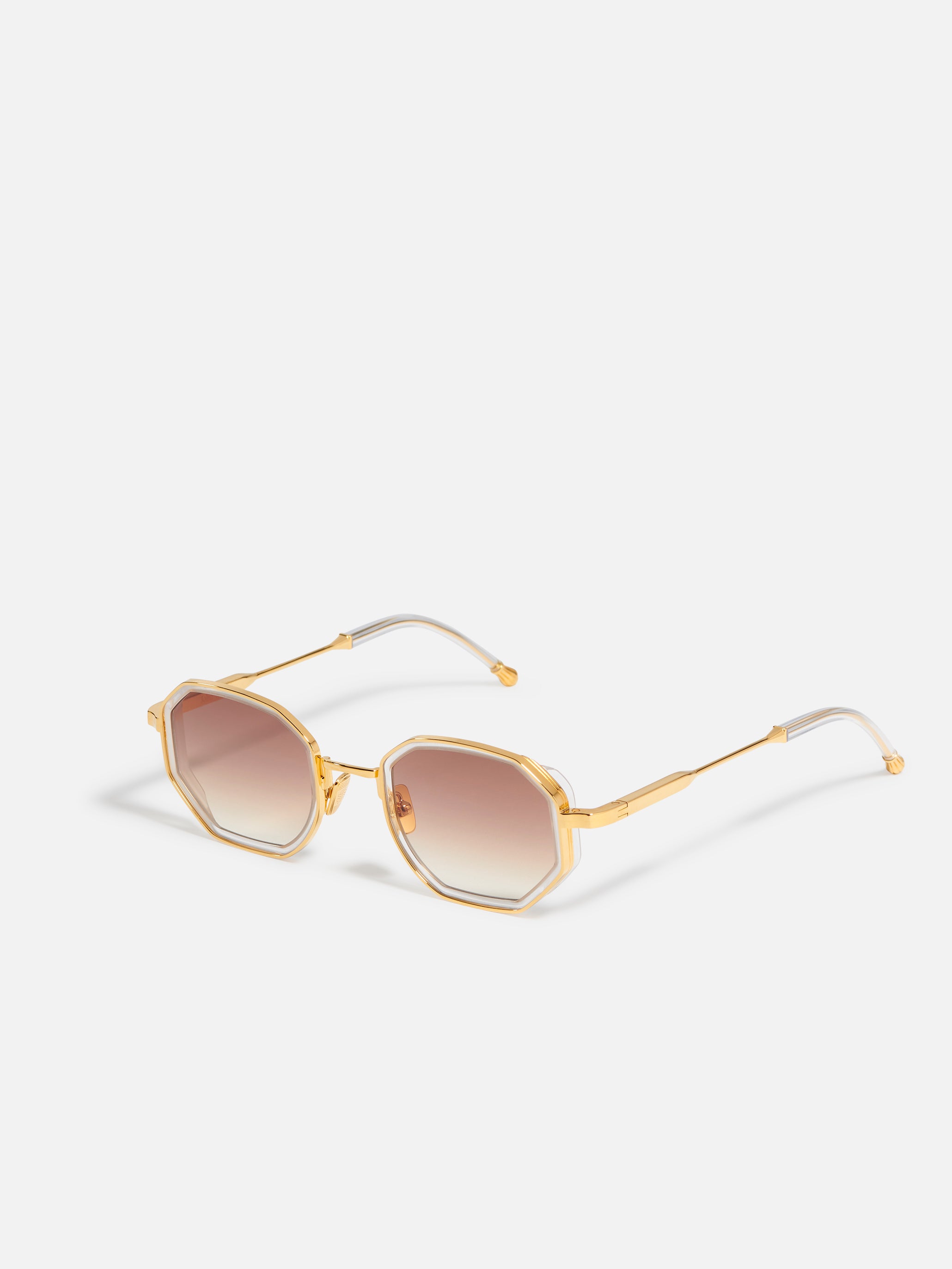A unisex octagonal shape with acetate rims cut that stands out from the 4mm streak-engraved metal. The frame is enlivened by our new signature temples featuring John Dalia’s engraved end pieces. Custom almond acetate & 22-carat yellow gold-plated alloy frame (c. 5µ layer and jewelry stamp inside the temple). Vintage yellow gradient CR39 lenses with AR treatment. Reference C-193. Case and cleaning cloth are included.