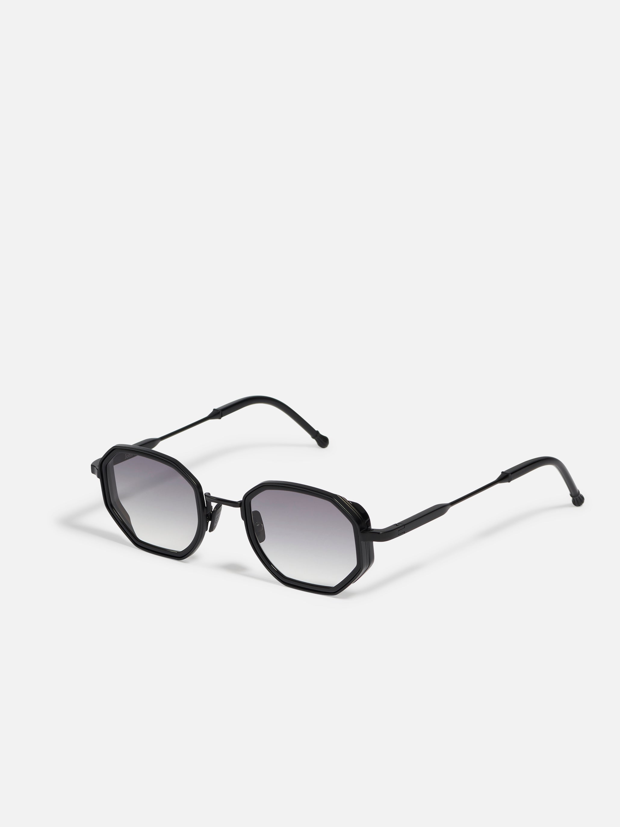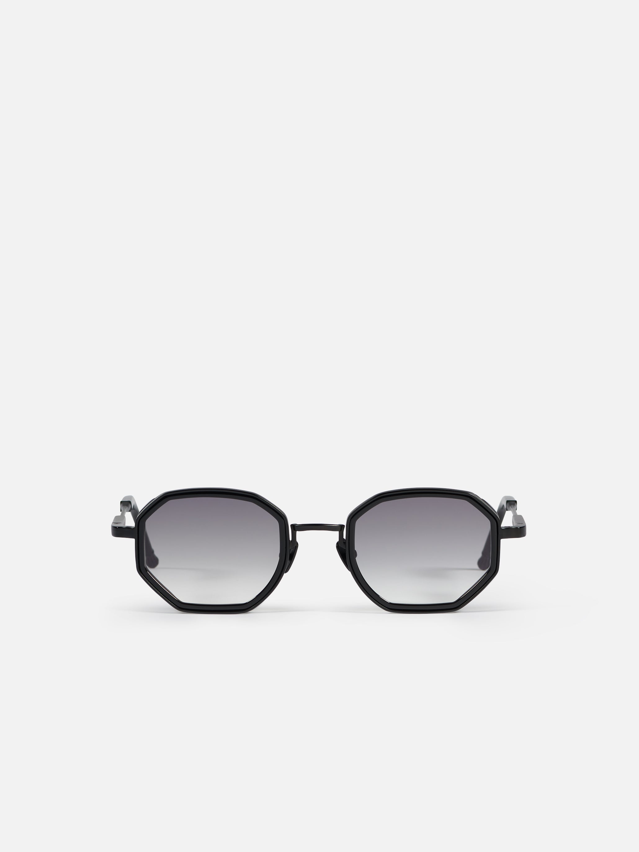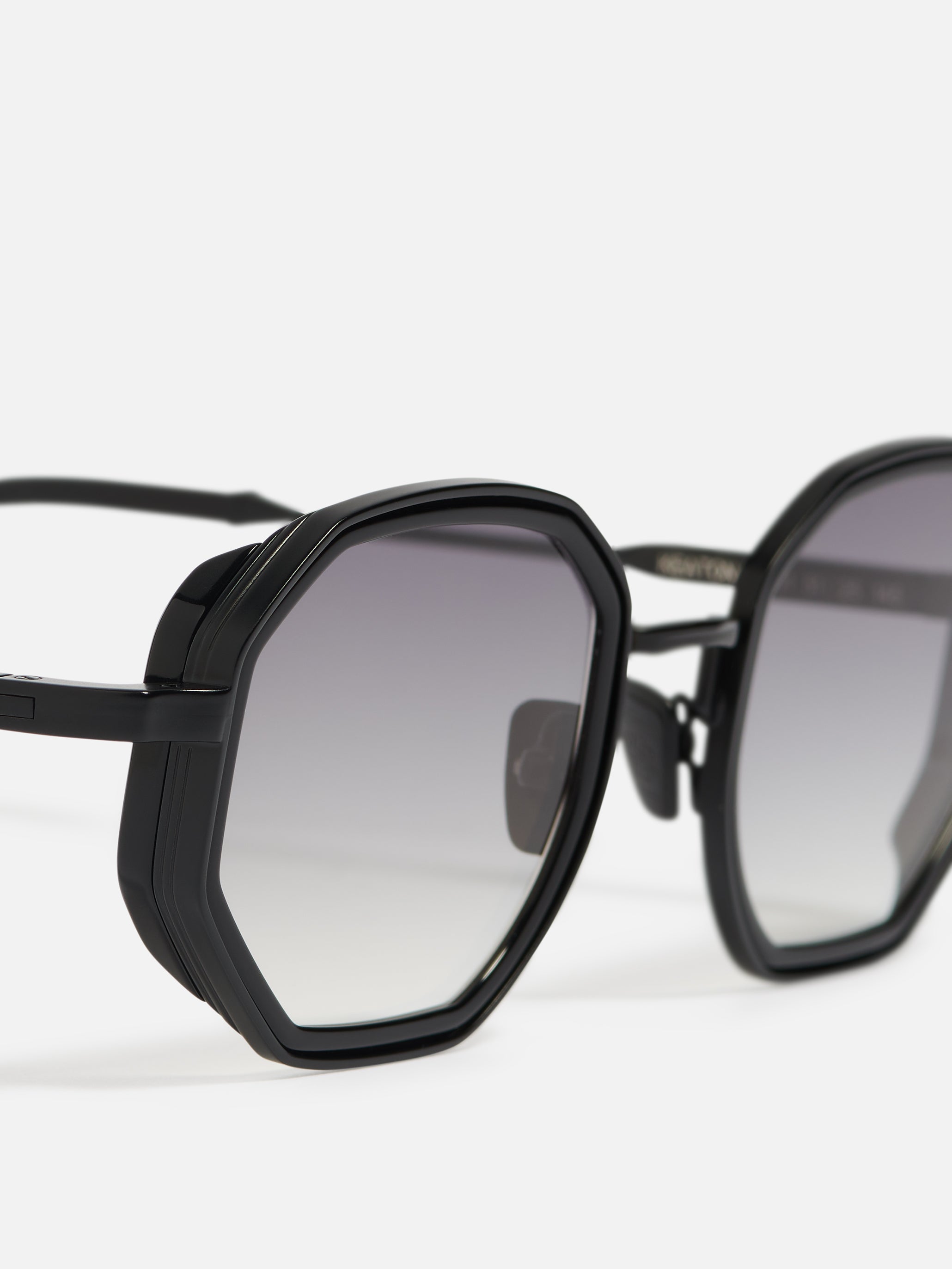 A unisex octagonal shape with acetate rims cut that stands out from the 4mm streak-engraved metal. The frame is enlivened by our new signature temples featuring John Dalia’s engraved end pieces. Custom infinite black acetate & carbon galvanized alloy frame. Grey gradient CR39 lenses with AR treatment. Reference C-301. Case and cleaning cloth are included.