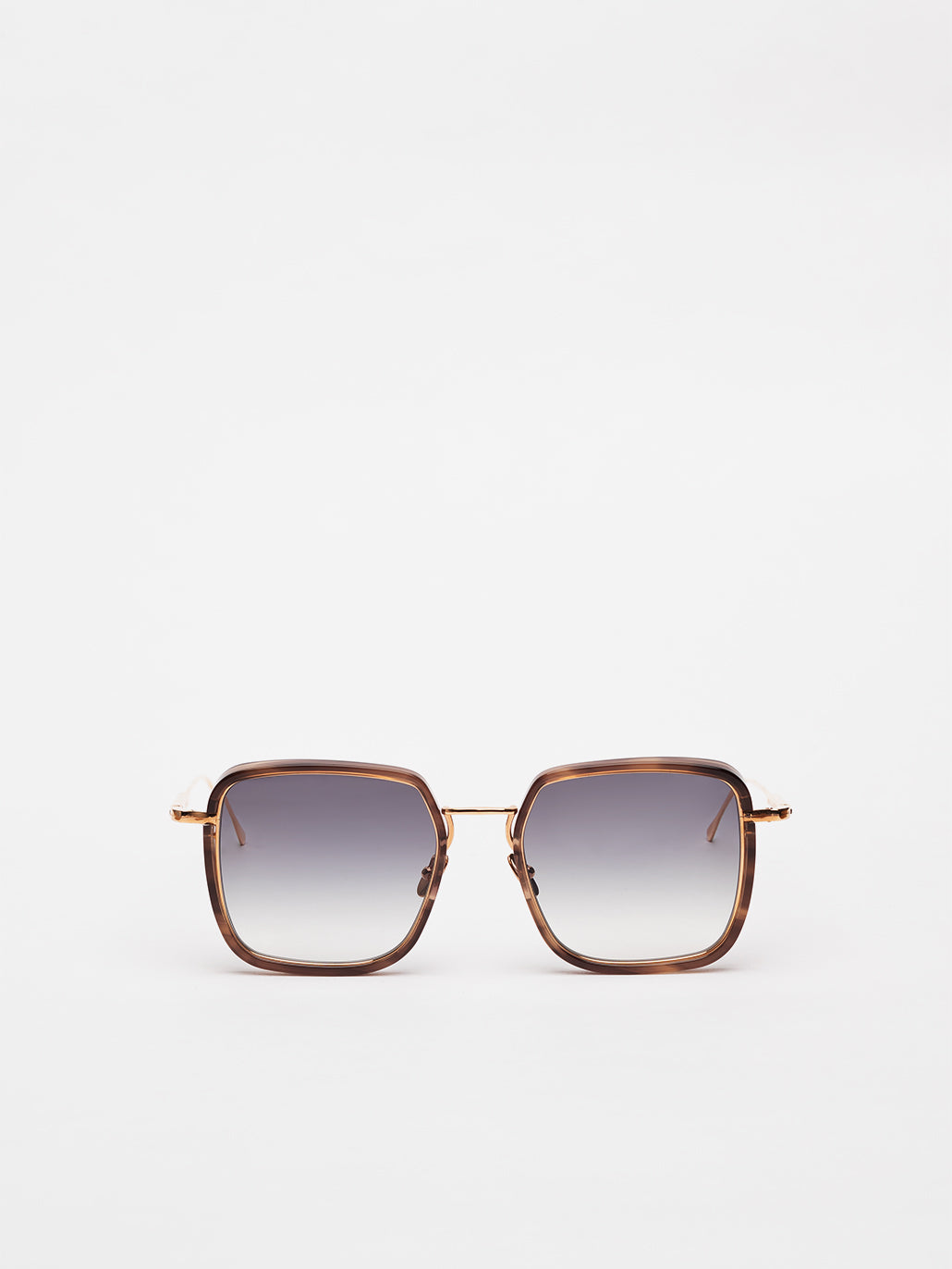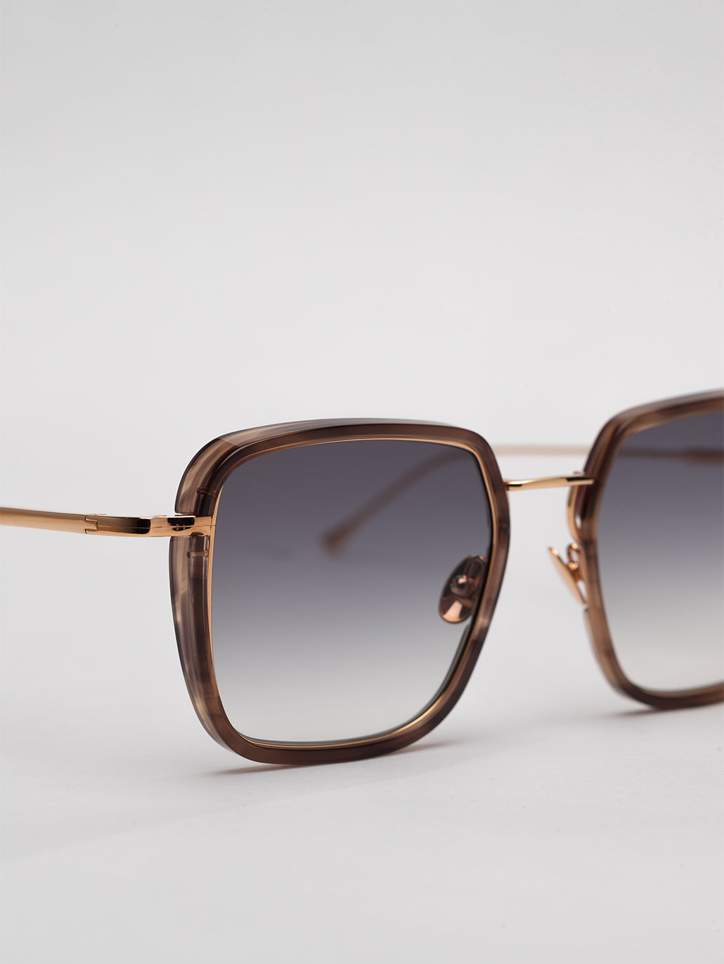 An oversized square frame for women enlivened by our new geometric bridge and featuring traditional end pieces. Mocha acetate & 22-carat rose gold plated alloy frame (c.5µ layer and jewelry stamp inside the temple). Grey gradient CR39 lenses with AR treatment. Reference C-126. Cases and cleaning cloth are included.