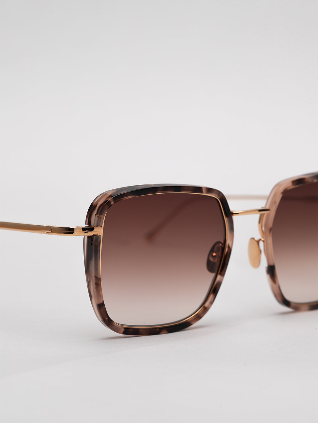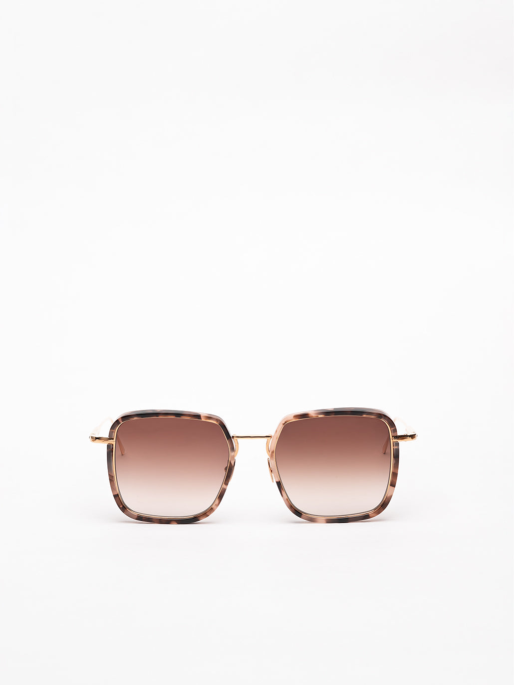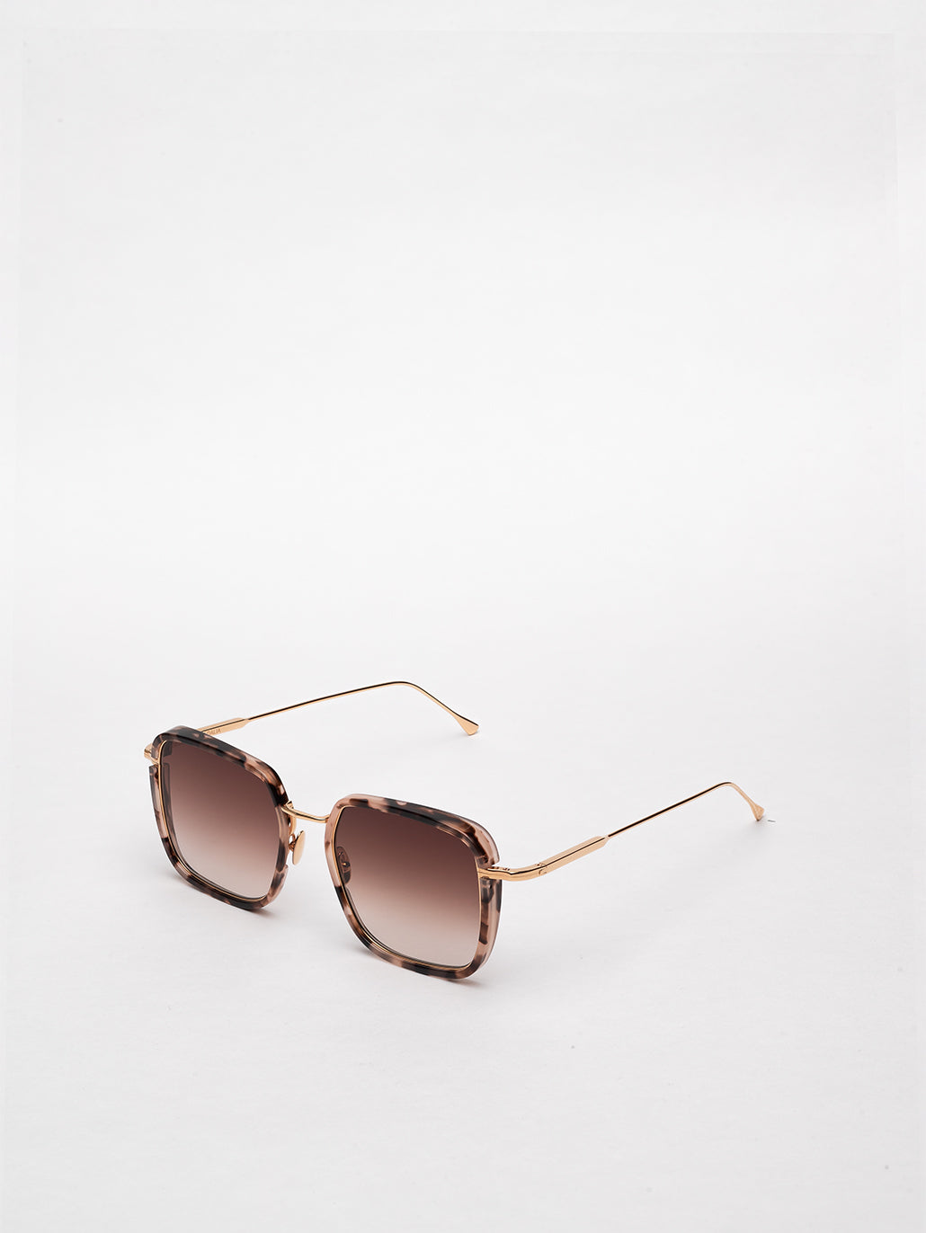 An oversized square frame for women enlivened by our new geometric bridge and featuring traditional end pieces. Rose Tortoise acetate & 22-carat rose gold plated alloy frame (c.5µ layer and jewelry stamp inside the temple). Brown gradient CR39 lenses with AR treatment. Reference C-140. Cases and cleaning cloth are included.