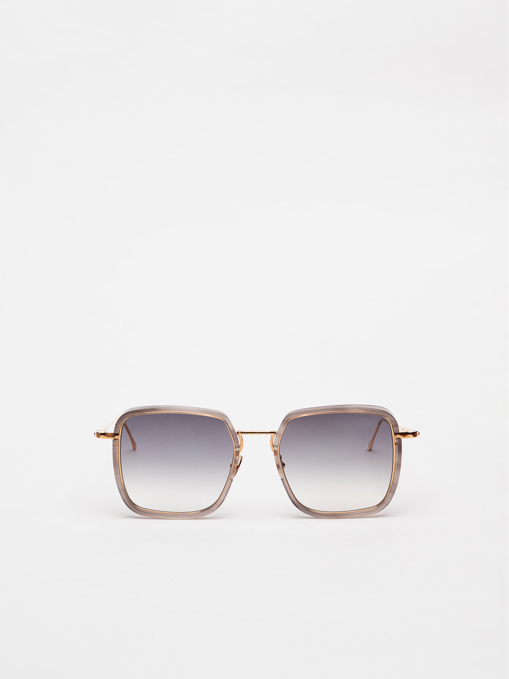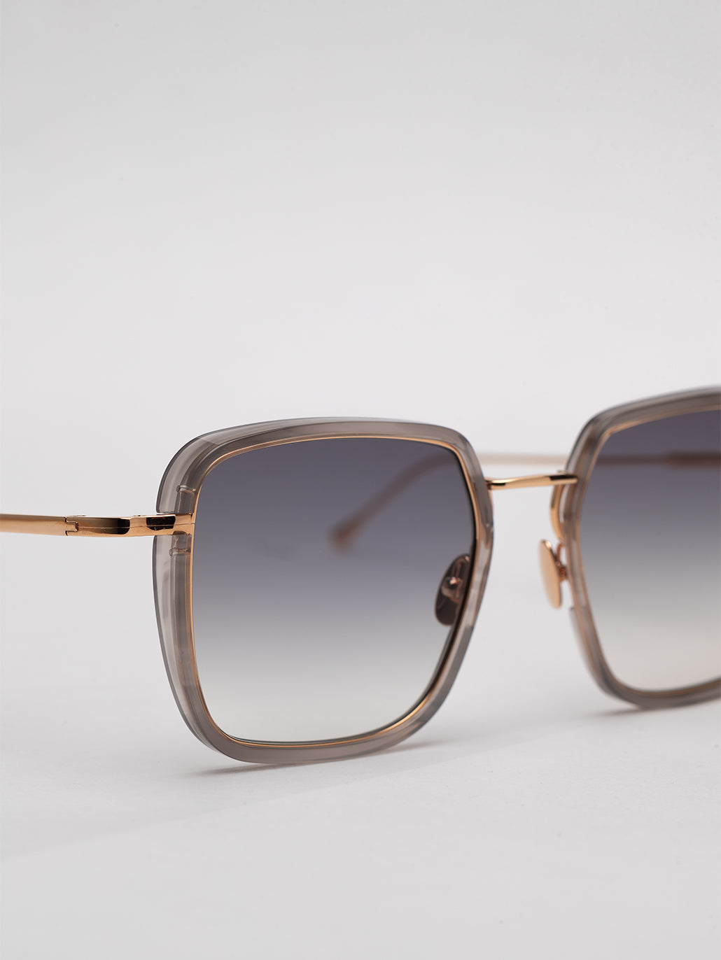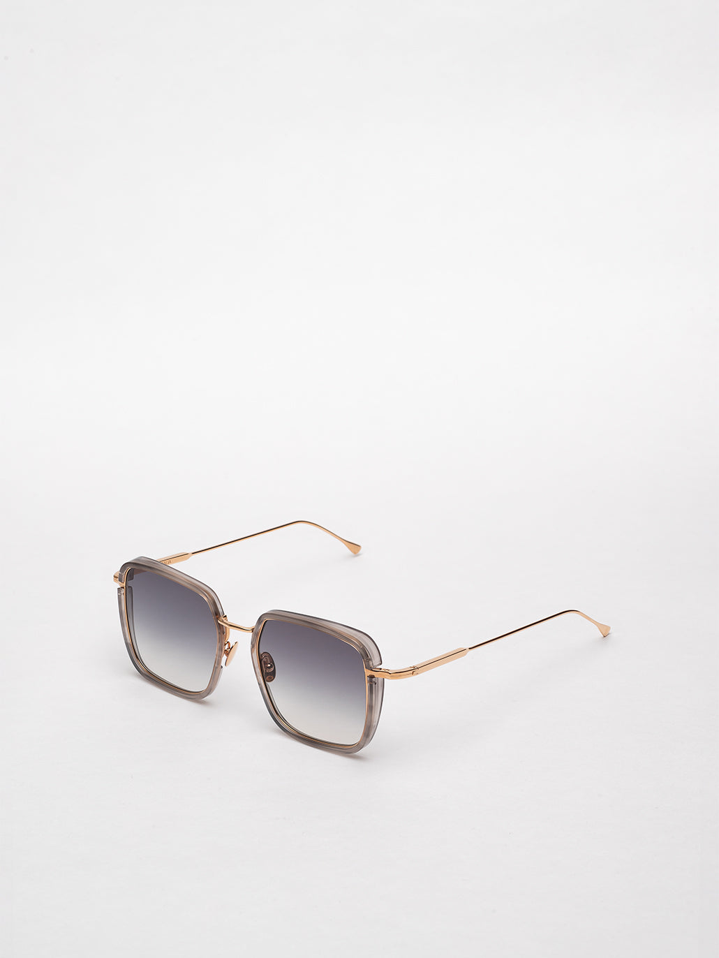 An oversized square frame for women enlivened by our new geometric bridge and featuring traditional end pieces. Workman Grey acetate & 22-carat rose gold plated alloy frame (c.5µ layer and jewelry stamp inside the temple). Grey gradient CR39 lenses with AR treatment. Reference C-154. Cases and cleaning cloth are included.