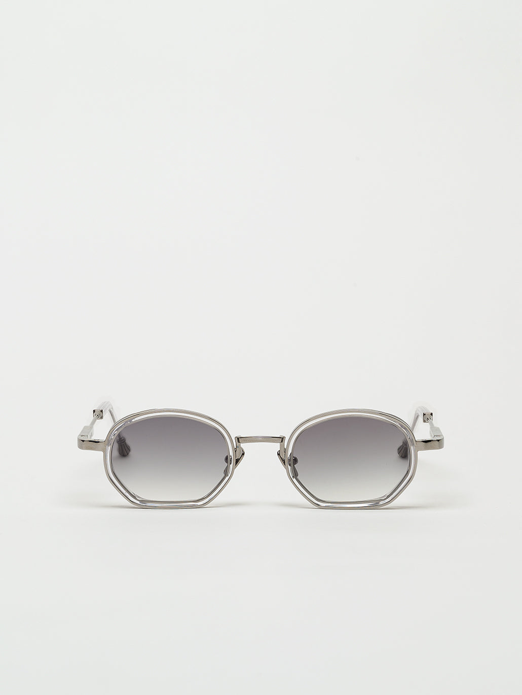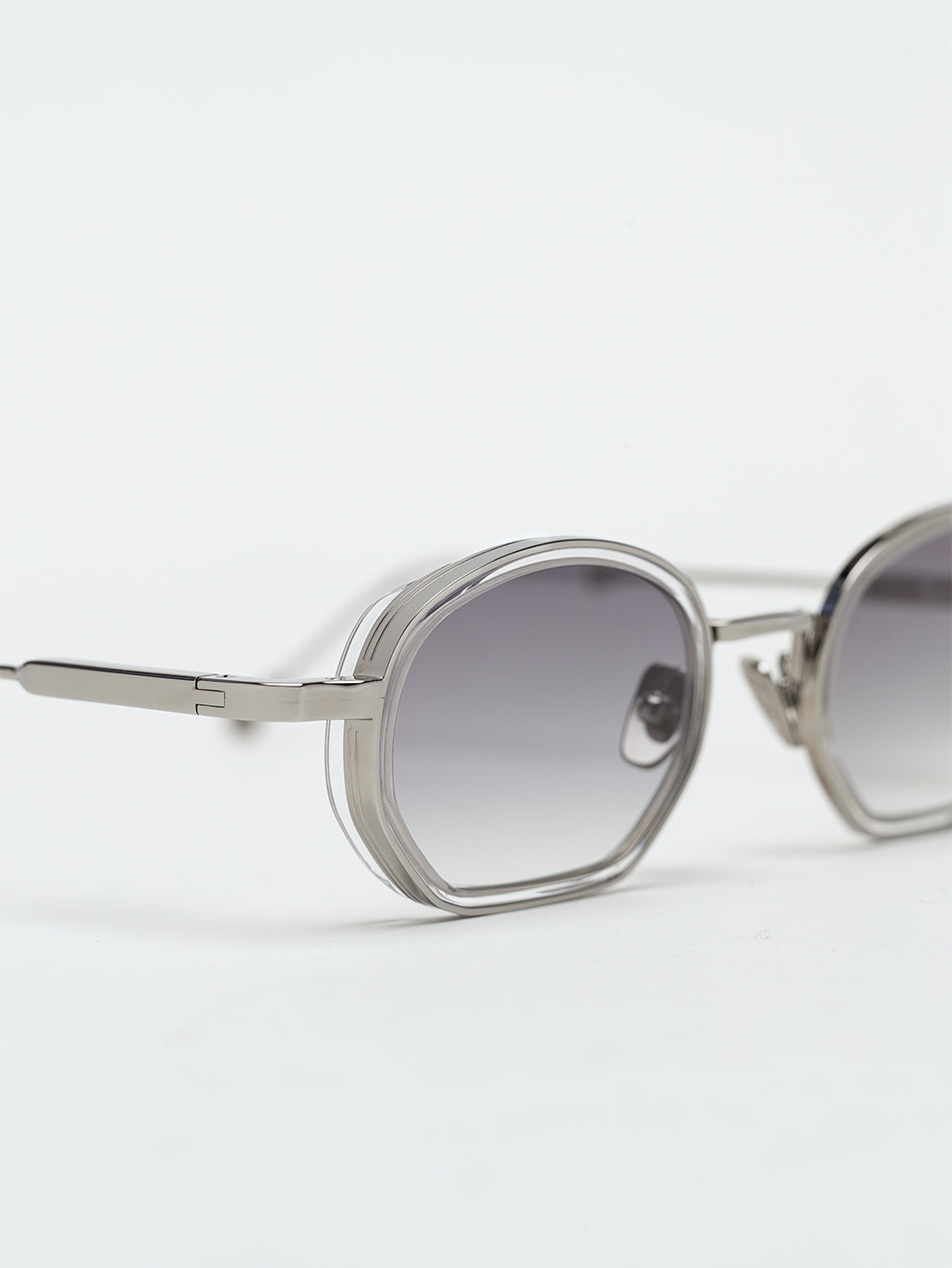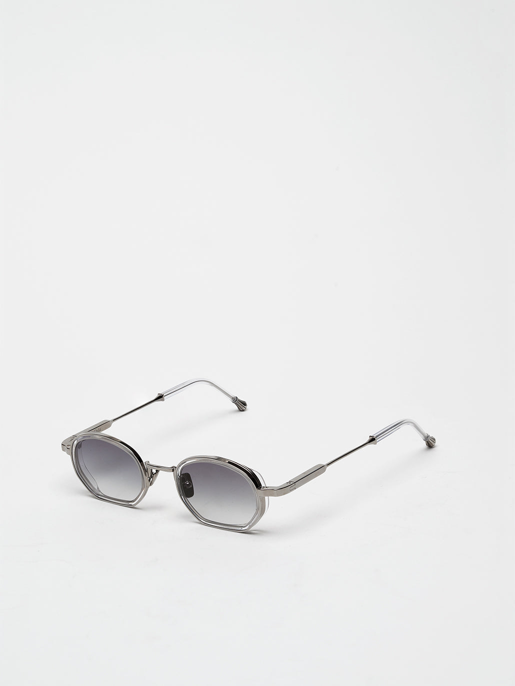 A unisex rectangular shape with acetate rims cut that stands out from the 4mm streak-engraved metal. The frame is enlivened by our new signature temples featuring John Dalia’s engraved end pieces. Custom crystal acetate & Ruthenium plated alloy frame. Grey gradient CR39 lenses with AR treatment. Reference C-183. Case and cleaning cloth are included.