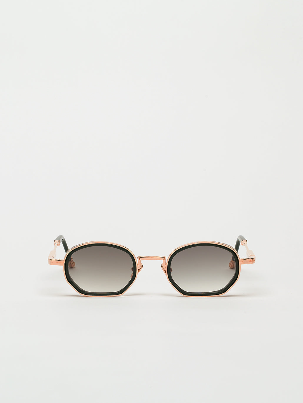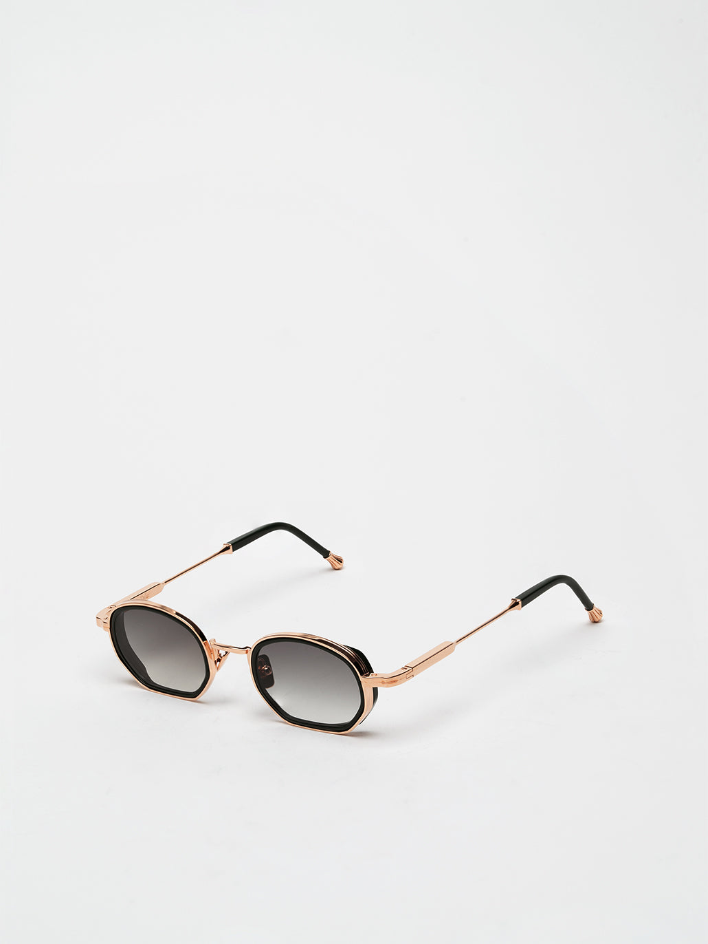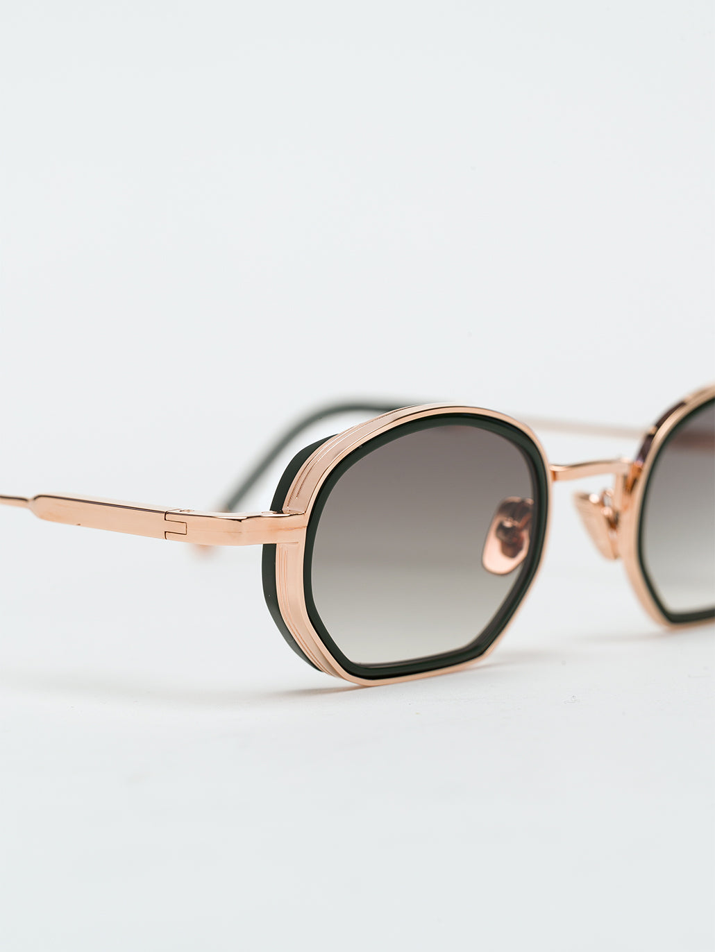 A unisex rectangular shape with acetate rims cut that stands out from the 4mm streak-engraved metal. The frame is enlivened by our new signature temples featuring John Dalia’s engraved end pieces. Custom Green Racing acetate & 22-carat rose gold-plated alloy frame (c. 5µ layer and jewelry stamp inside the temple). G15 gradient CR39 lenses with AR treatment. Reference C-195. Case and cleaning cloth are included.