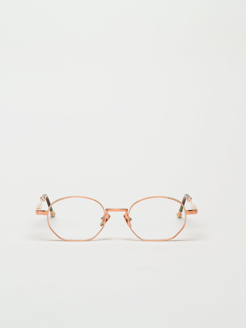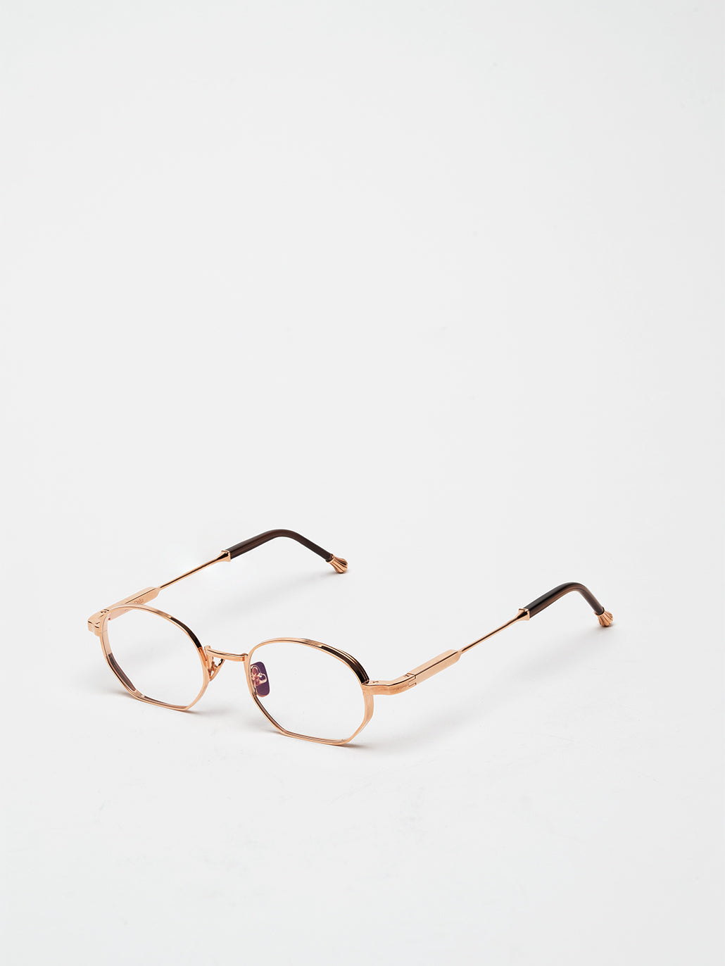 A unisex rectangular shape with 4mm streak-engraved metal. The frame is enlivened by our new signature temples featuring John Dalia’s engraved end pieces. Custom mocha acetate on temples & 22-carat rose gold-plated alloy frame (c. 5µ layer and jewelry stamp inside the temple). Demonstration CR39 lenses. Reference O-511. Case and cleaning cloth are included.