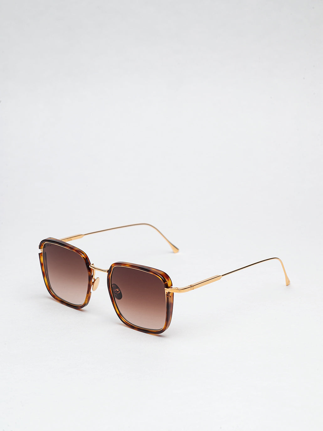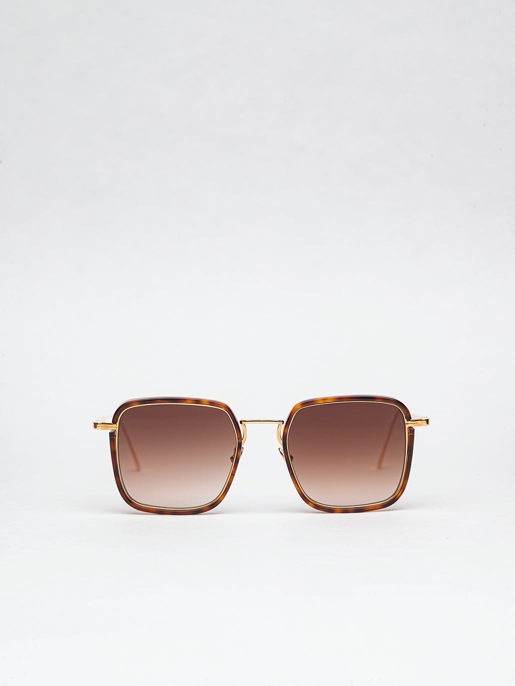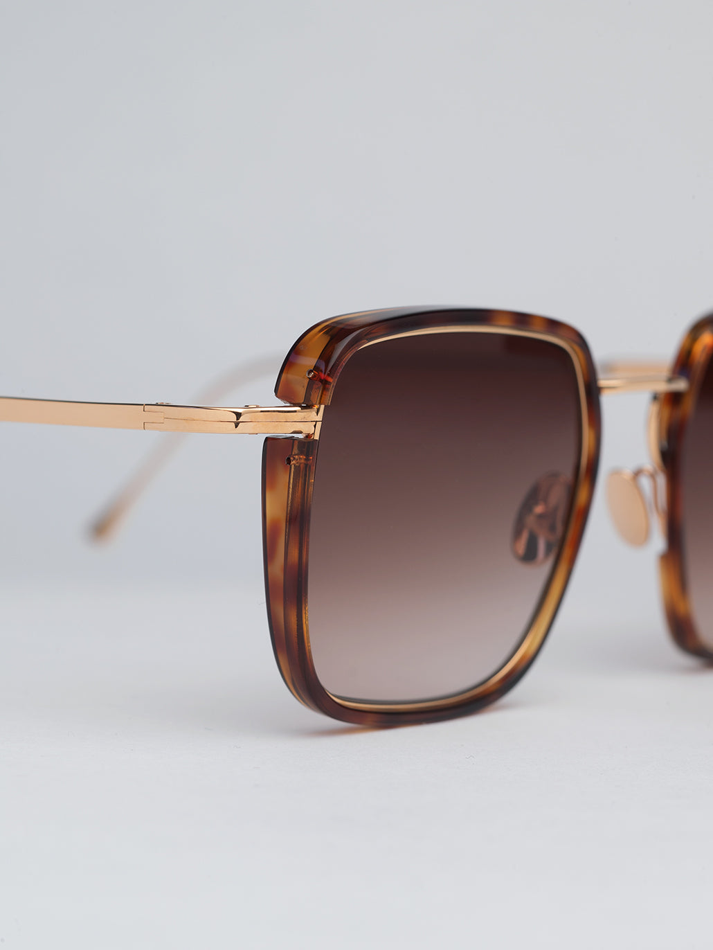 An oversized square frame for women enlivened by our new geometric bridge and featuring traditional end pieces. Dark Brown acetate & 22-carat rose gold plated alloy frame (c.5µ layer and jewelry stamp inside the temple). Brown gradient CR39 lenses with AR treatment. Reference C-121. Cases and cleaning cloth are included.