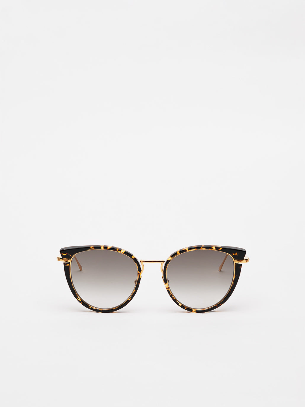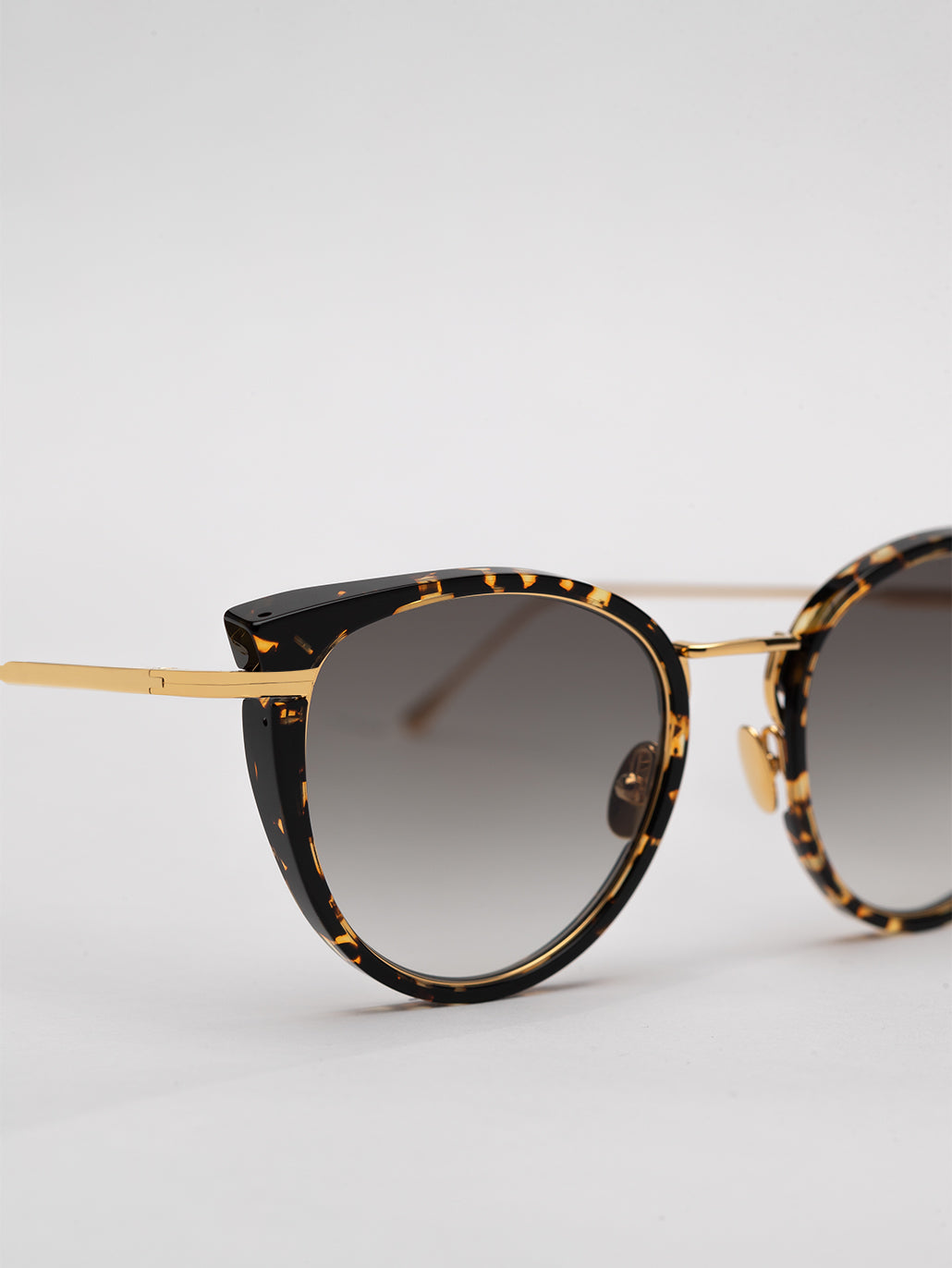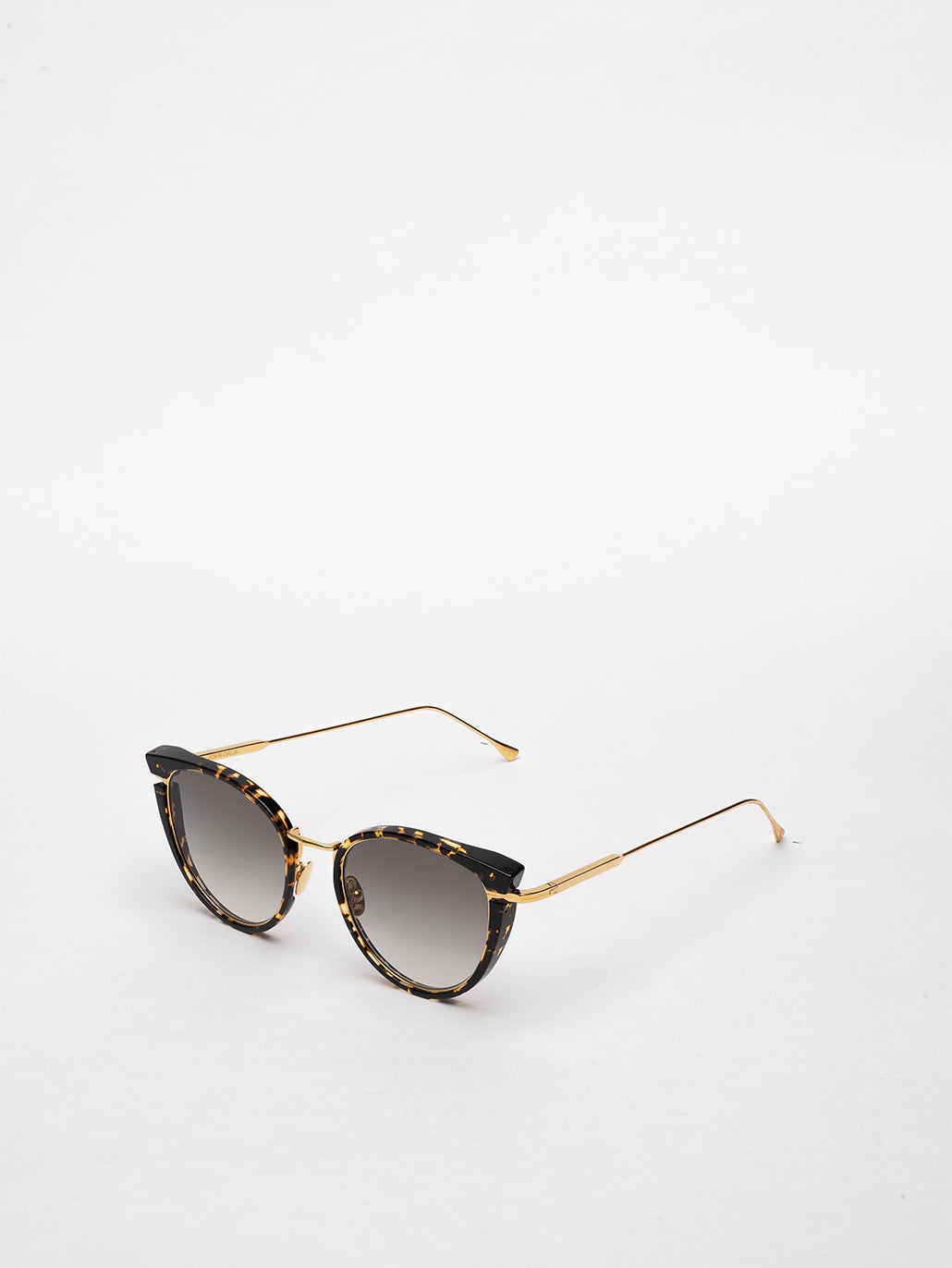 The metal corewire is made of stainless steel frame with yellow gold plating (5µ, with a jeweler’s stamp inside the temple). Temple tips and eye rims in Havana nerves acetate.