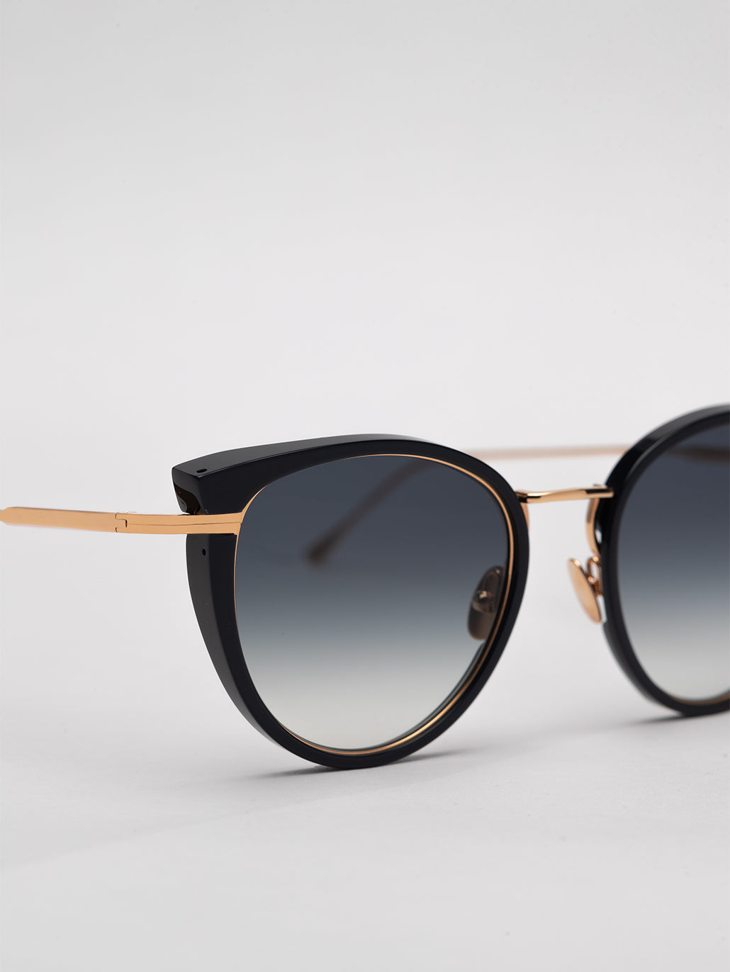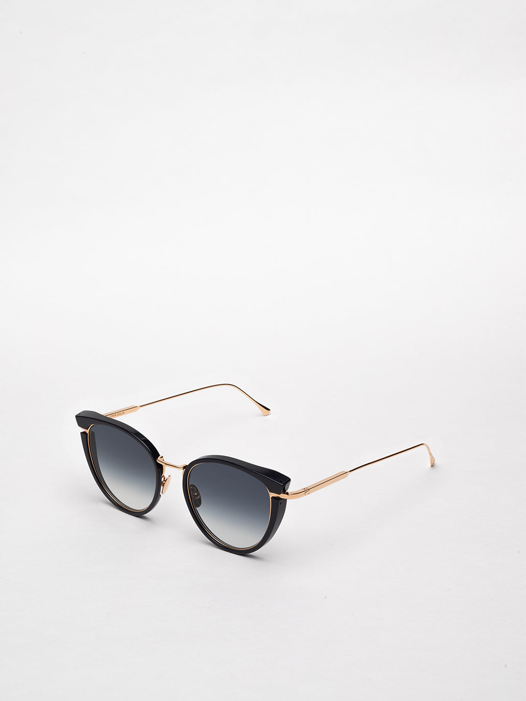 Unisex frame in a cat-eye shape, subtly retro-inspired. It features a distinctive geometric bridge and classic end pieces, combining acetate eye rims with a 4mm streak-engraved metal structure.