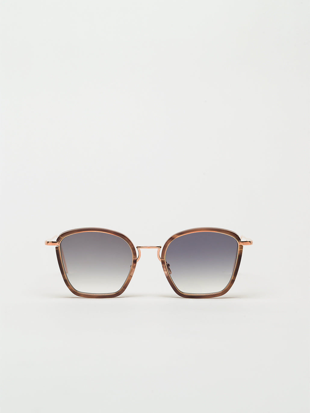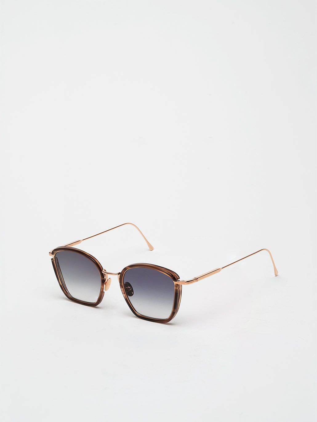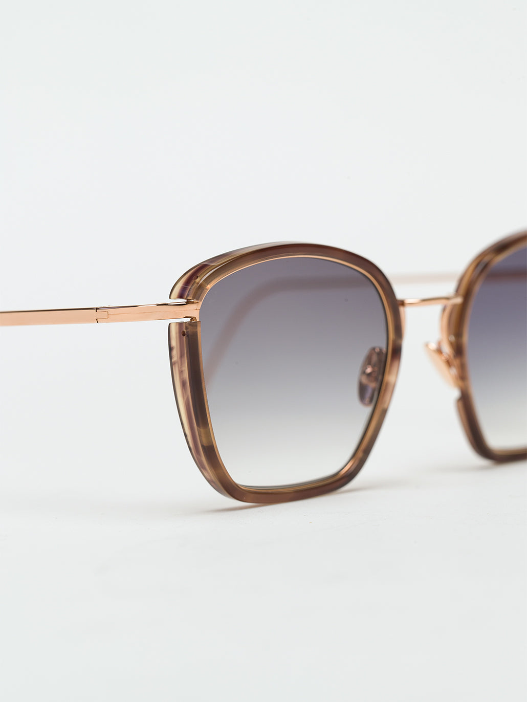 A medium sized cat eye shape for women enlivened by our new geometric bridge and featuring traditional end pieces. Custom mocha acetate & 22-carat rose gold plated alloy frame (c. 5µ layer and jewelry stamp inside the temple). Grey gradient CR39 lenses with AR treatment. Reference C-126. Case and cleaning cloth are included.
