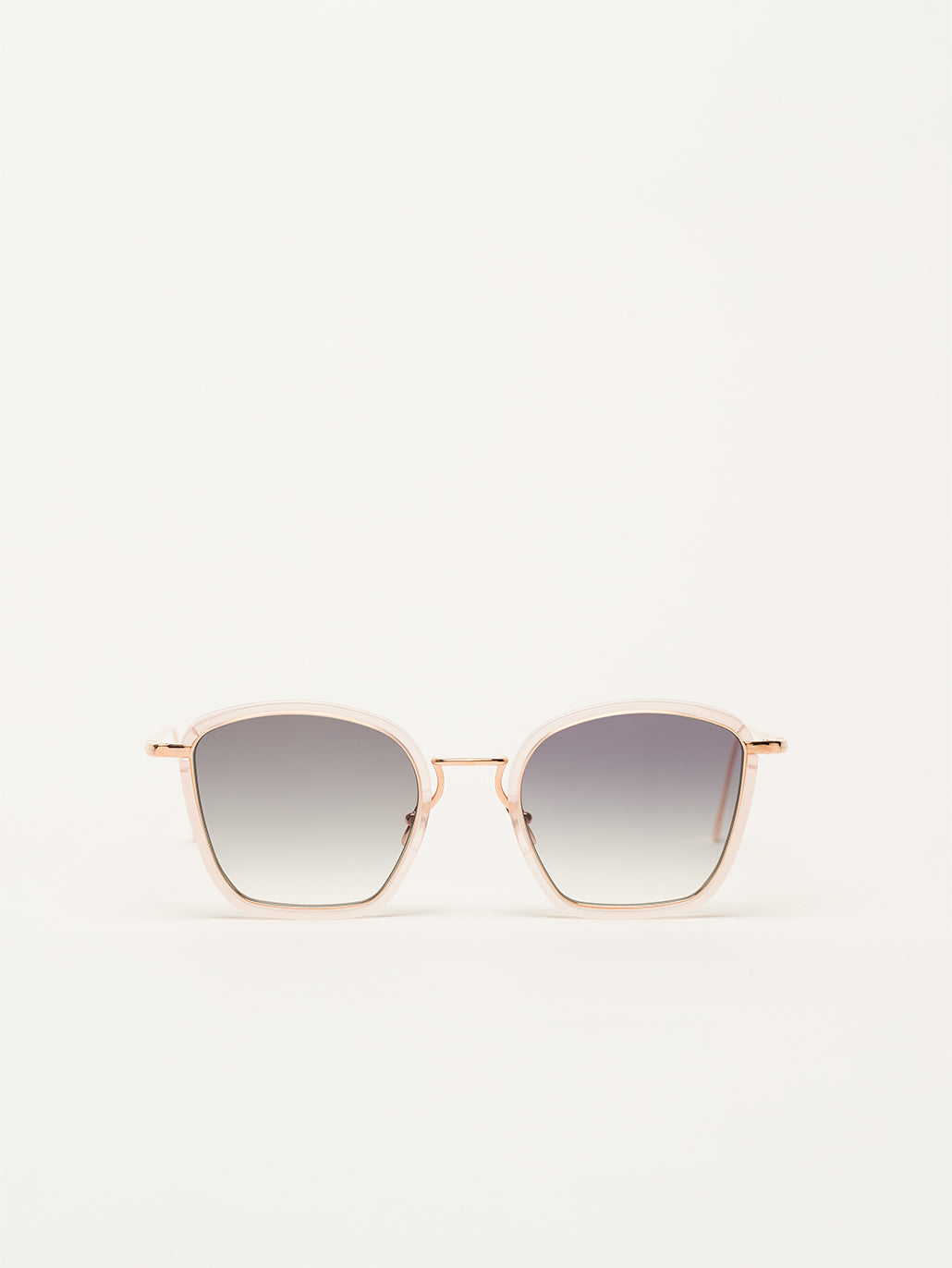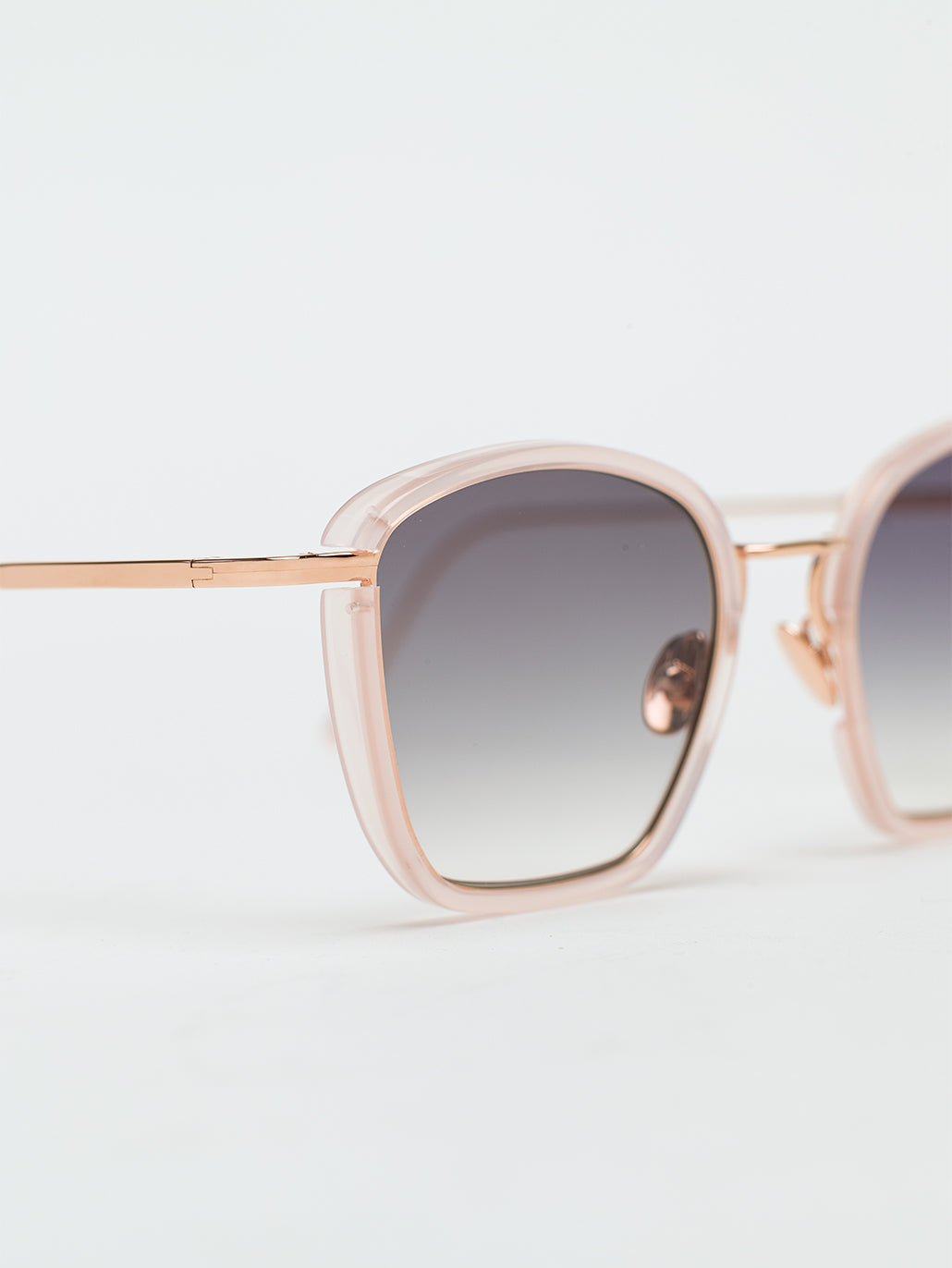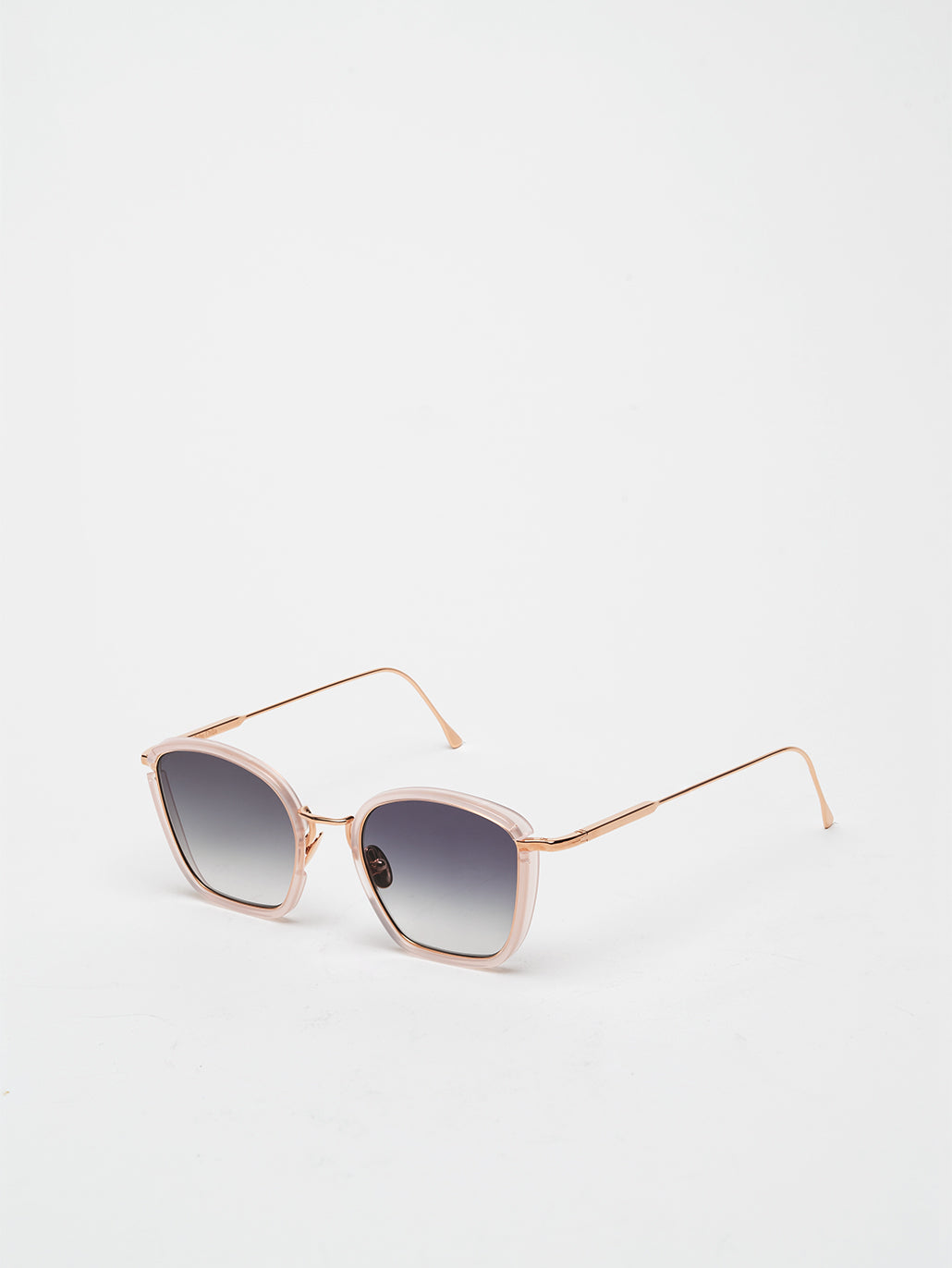 A medium sized cat eye shape for women enlivened by our new geometric bridge and featuring traditional end pieces. Custom pink lemonade acetate & 22-carat rose gold plated alloy frame (c. 5µ layer and jewelry stamp inside the temple). Grey gradient CR39 lenses with AR treatment. Reference C-198. Case and cleaning cloth are included.