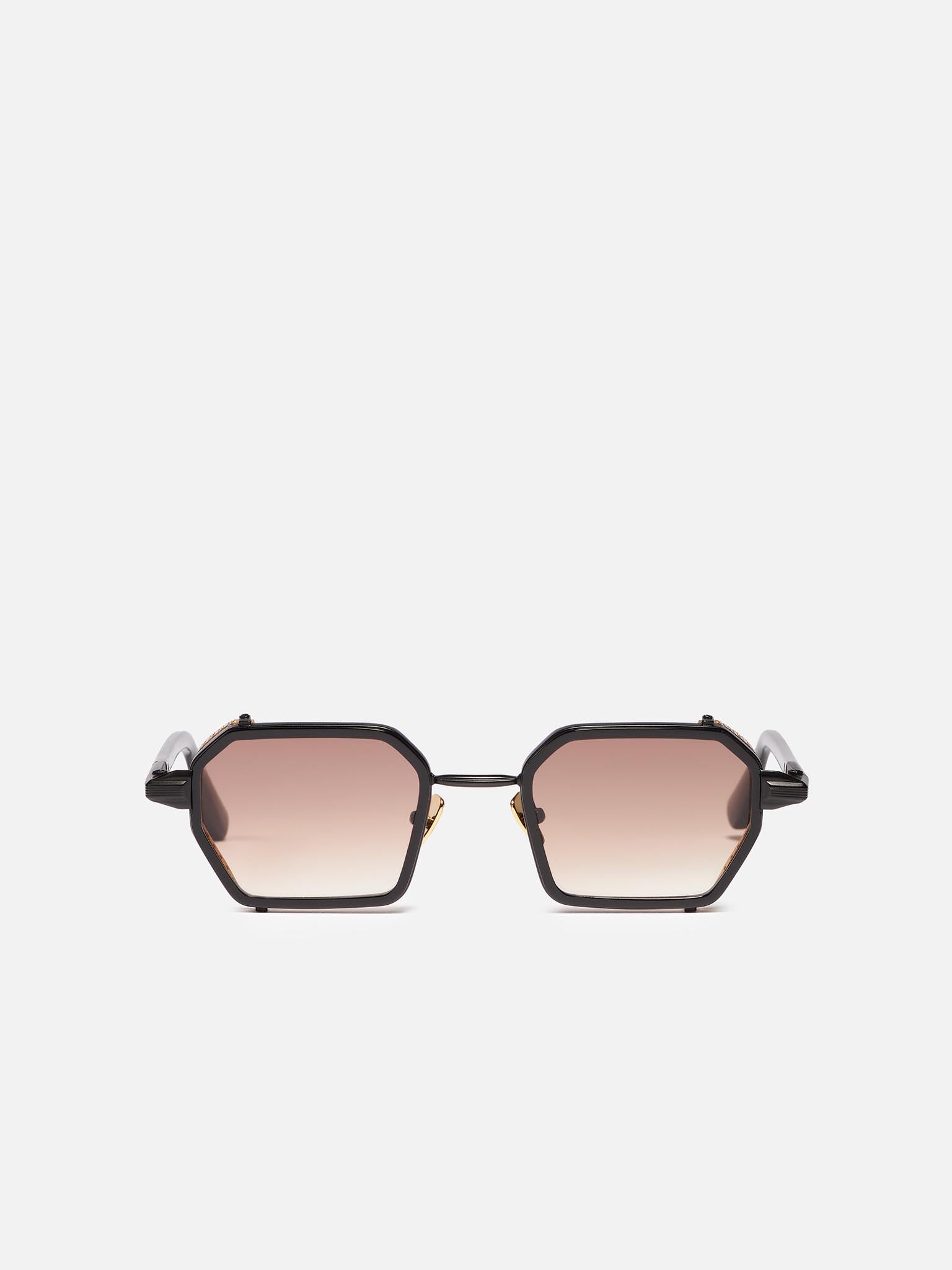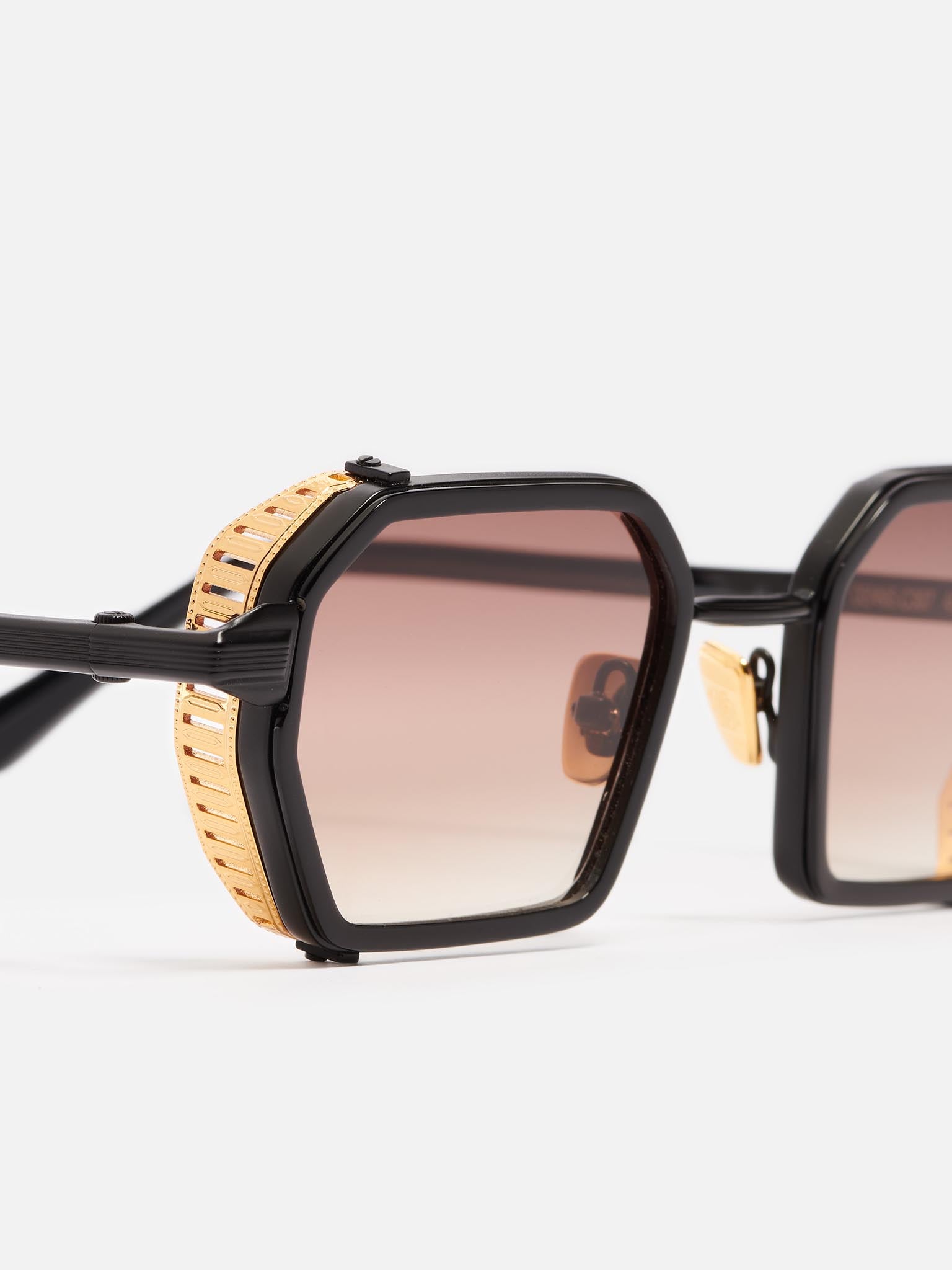 The metal corewire is made of stainless steel frame with a carbon black finish. Side shields and nose in yellow gold. Temple tips in black acetate.