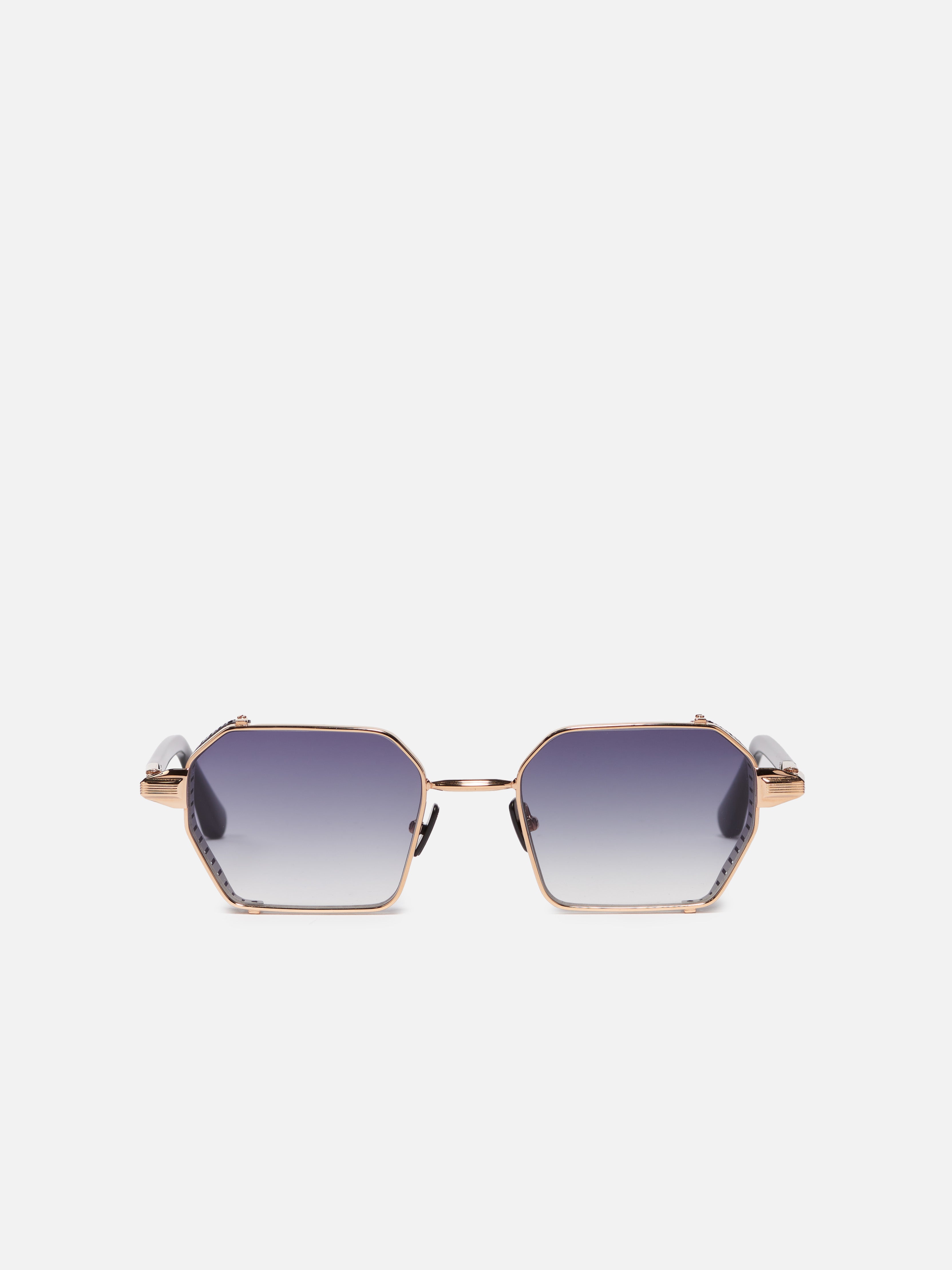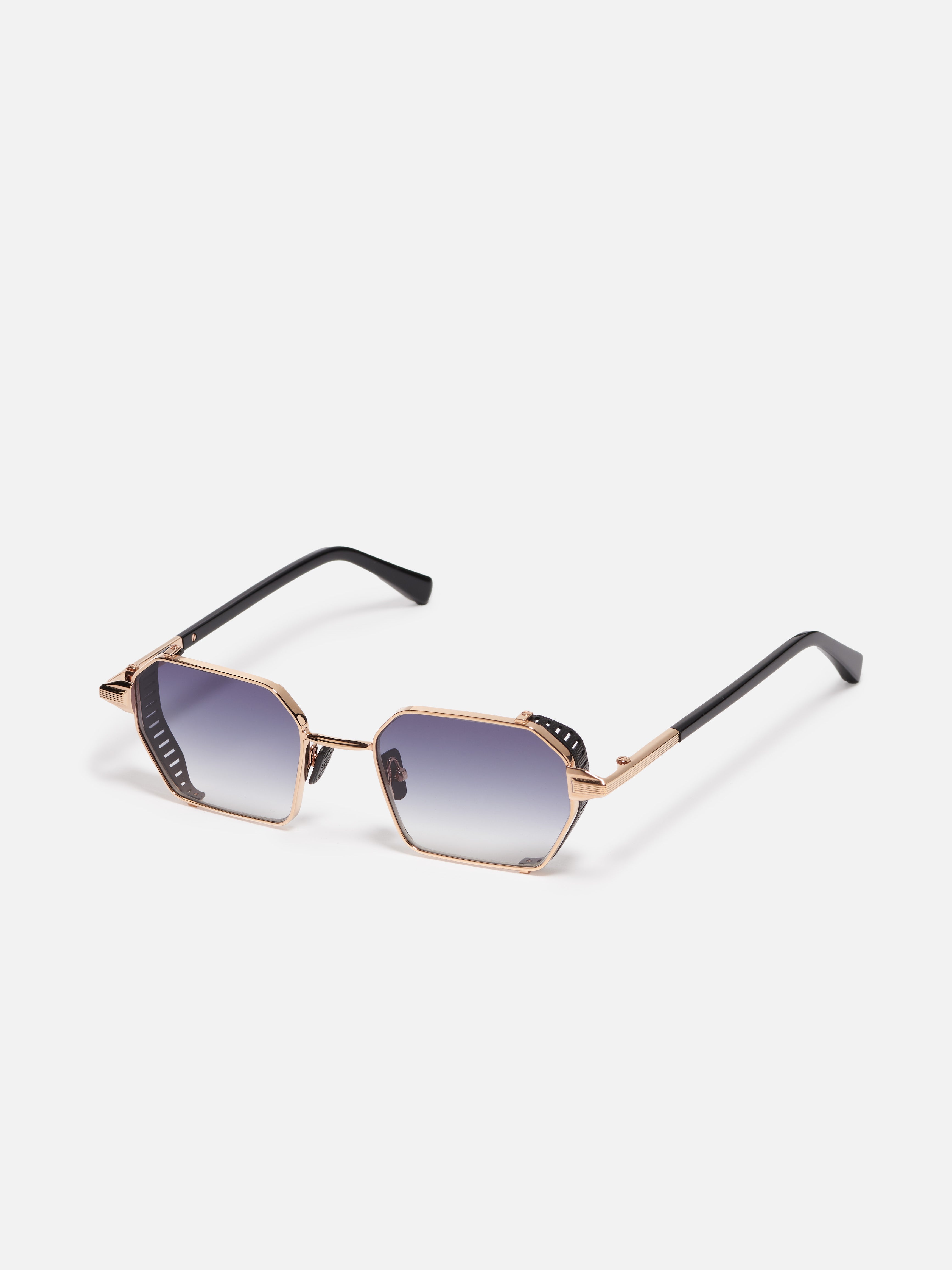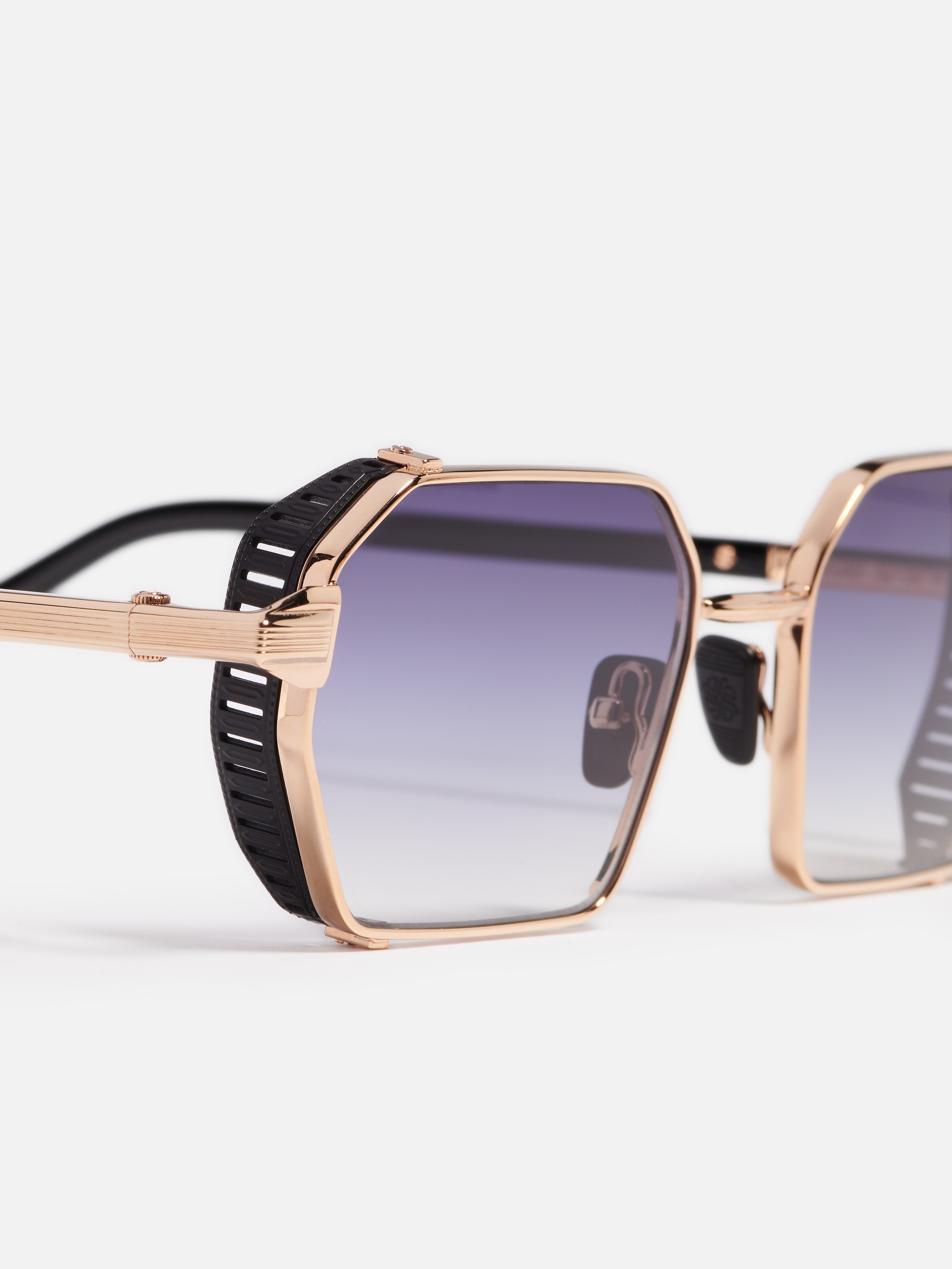 The metal corewire is made of stainless steel frame with rose gold plating (5µ, with a jeweler’s hallmark on the inner temple). Side shields and nose pads in carbon-effect black. Temple tips in black acetate.