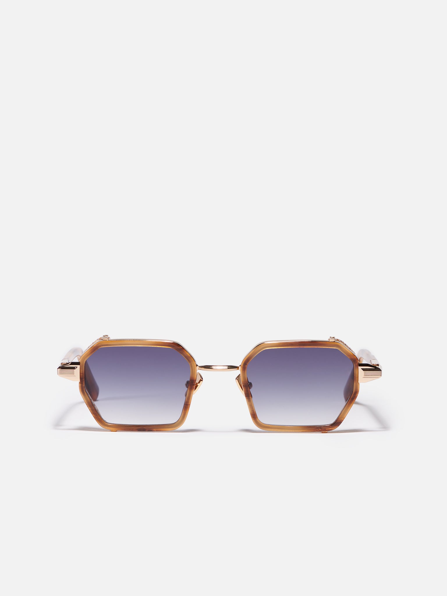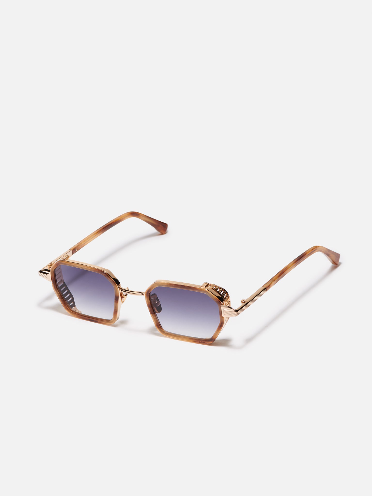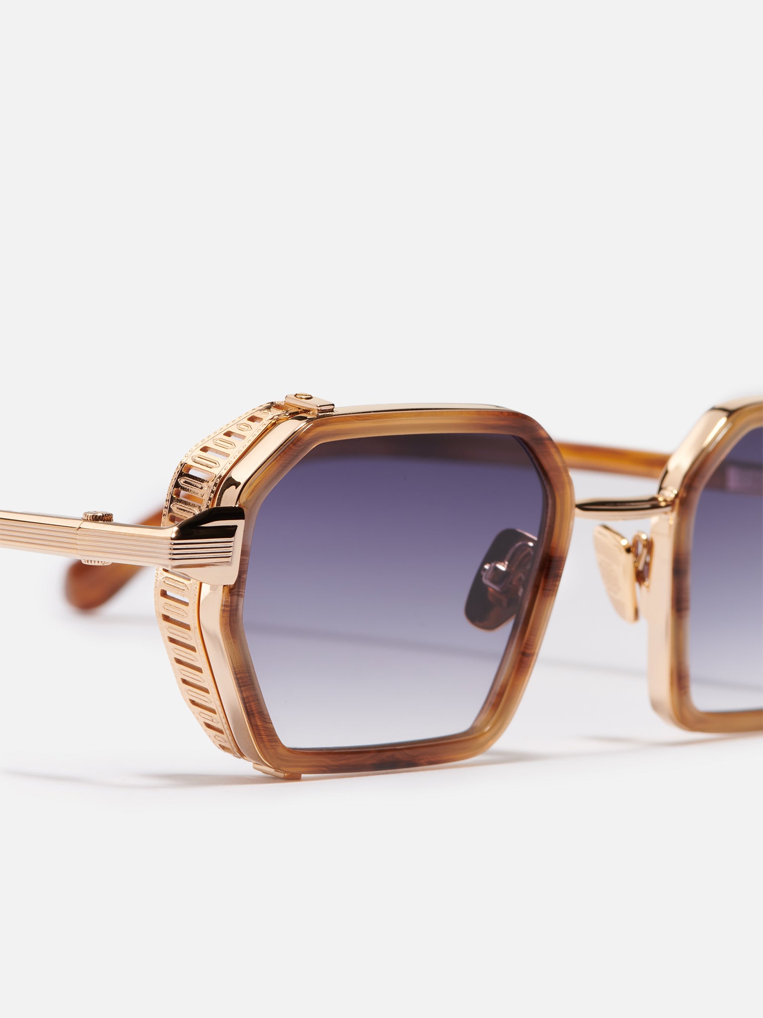 The metal corewire is made of stainless steel frame with a yellow gold plating (5µ, with a jeweler's stamp on the inner temple). Side shields and nose pads in yellow gold color. Temple tips and rims in cognac tortoise acetate.