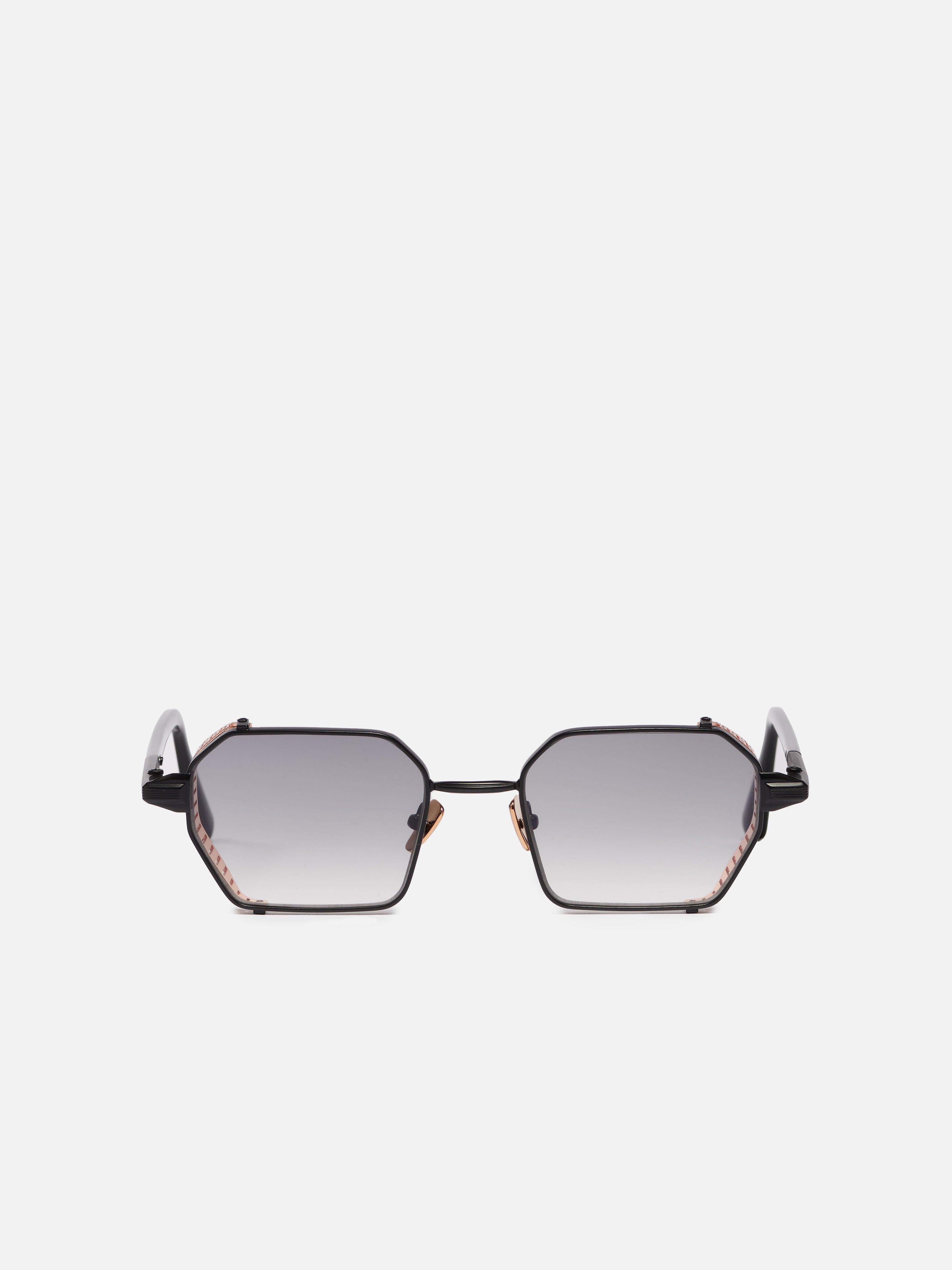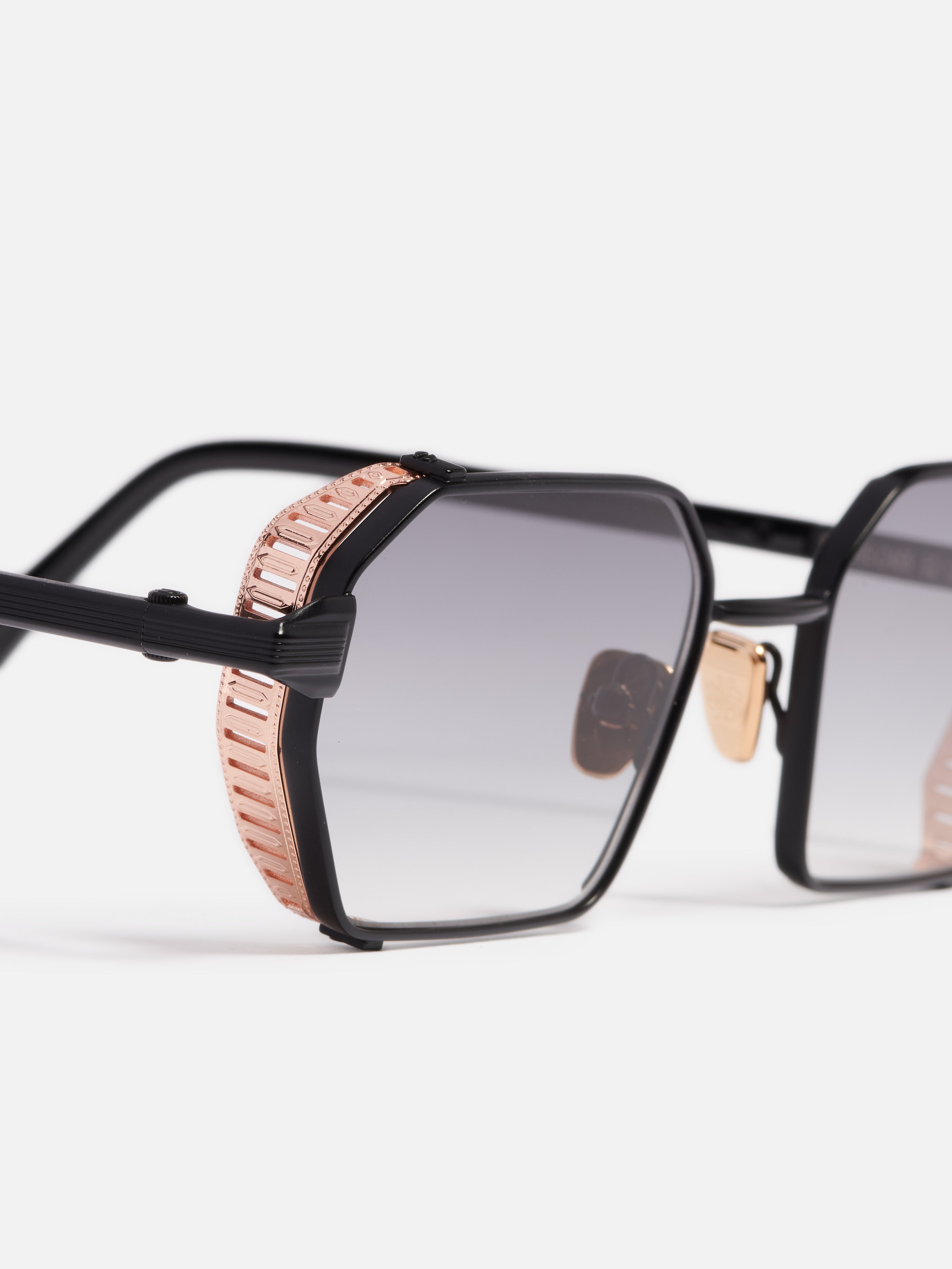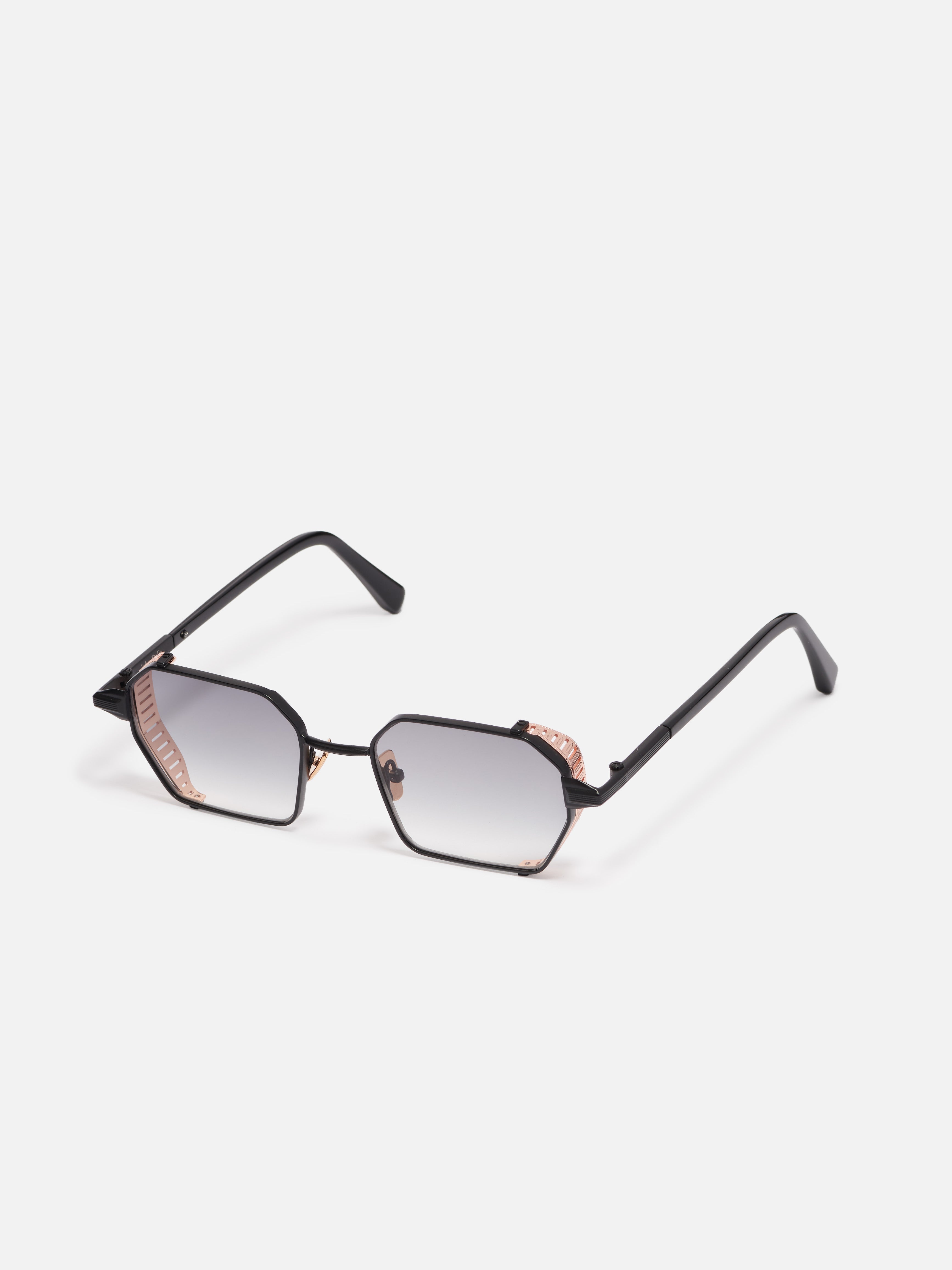 The metal corewire is made of stainless steel frame with a carbon black finish. Side shields and nose pads in rose gold. Temple tips in black acetate.