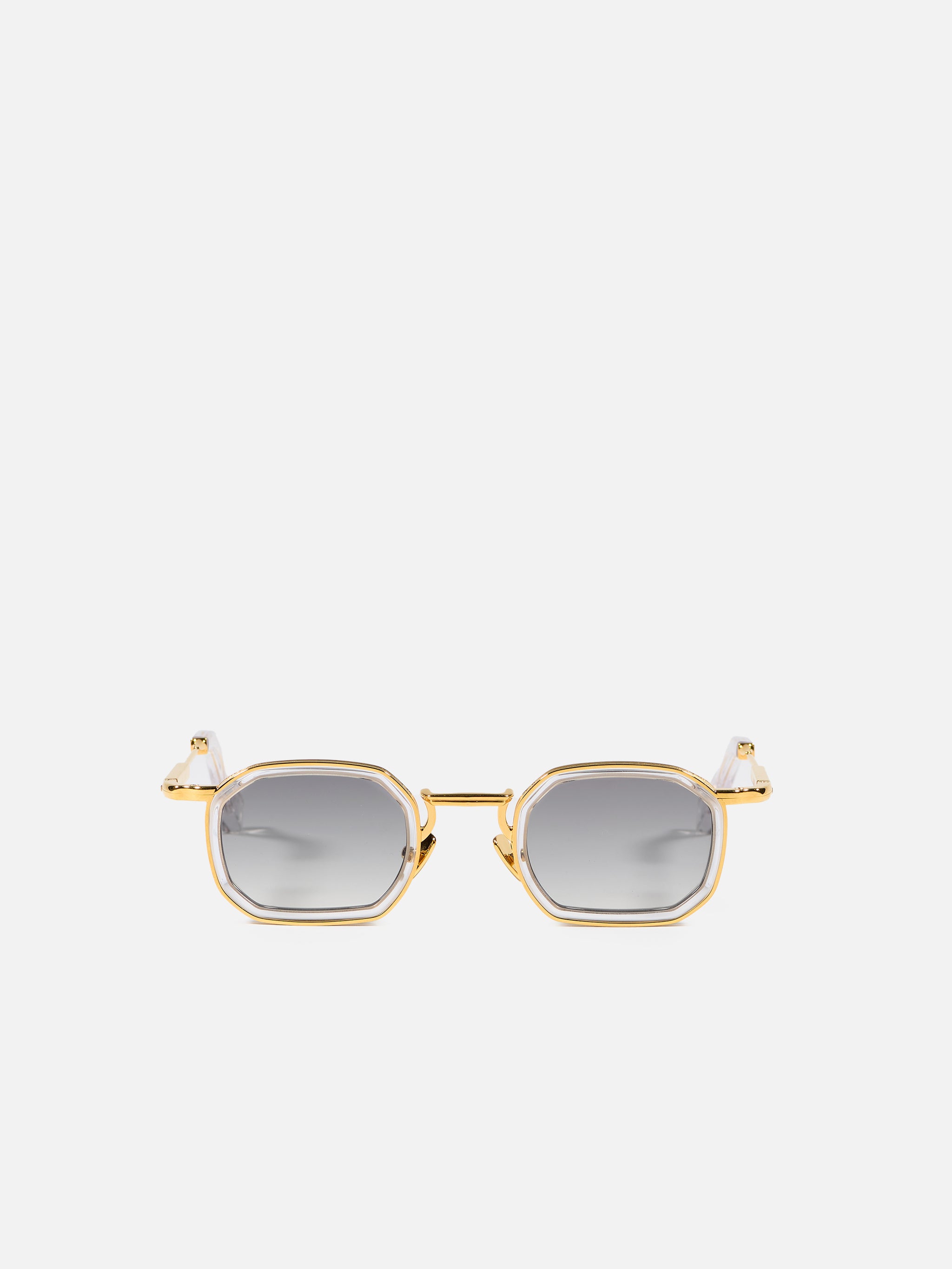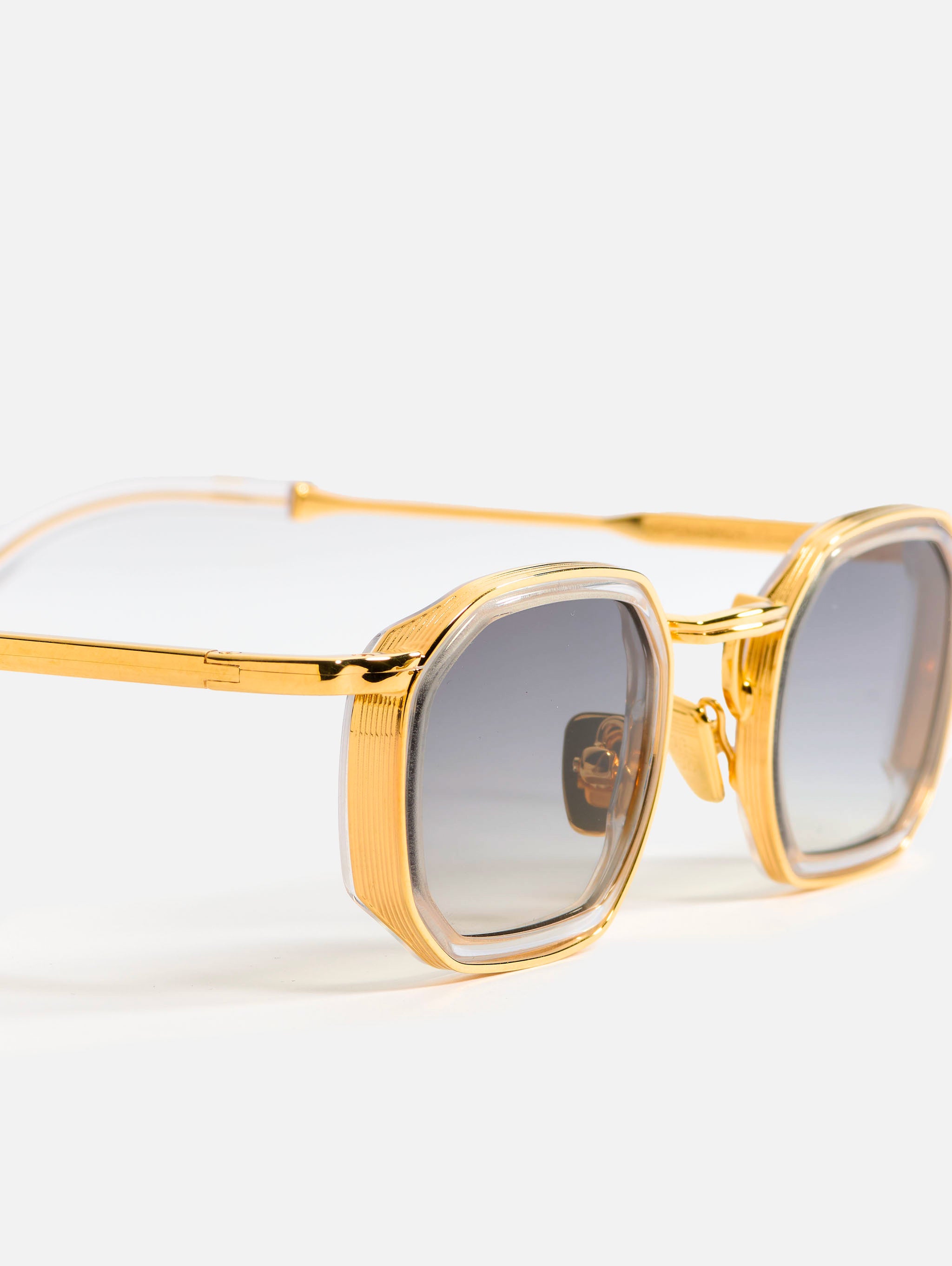 The metal corewire is made of stainless steel frame with a yellow gold plating (5µ, with a jeweler’s stamp inside the temple). Temple tips and eye rims in crystal acetate