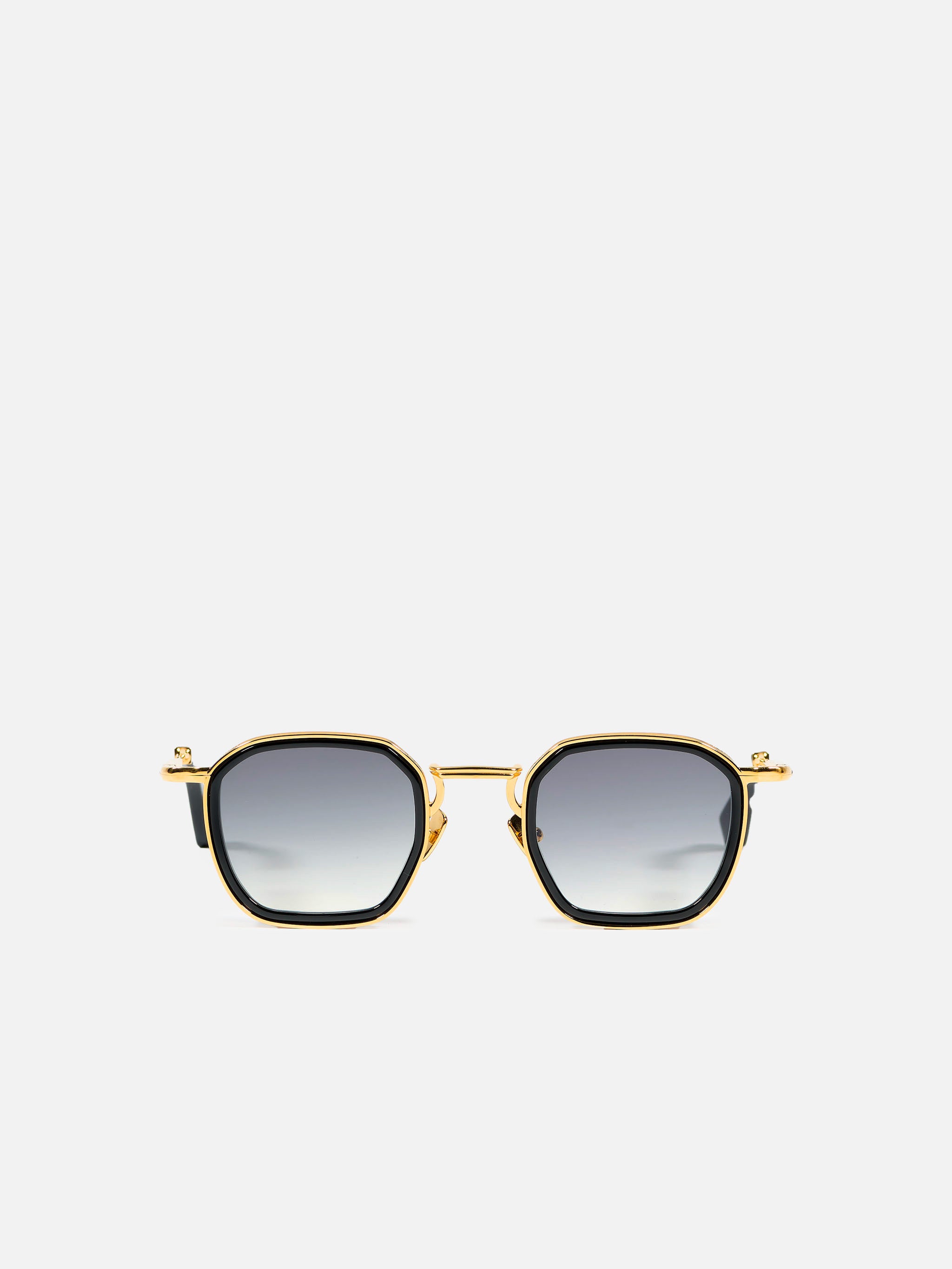 A unisex graphic shape with rims carved out of a 4mm engraved metal strip. The frame is enlivened by our new geometric bridge and features traditional end pieces. Custom Infinite Black acetate & 22-carat yellow gold plated alloy frame (c. 5µ layer and jewelry stamp inside the temple). Grey gradient CR39 lenses with AR treatment. Reference C-100. Case and cleaning cloth are included.