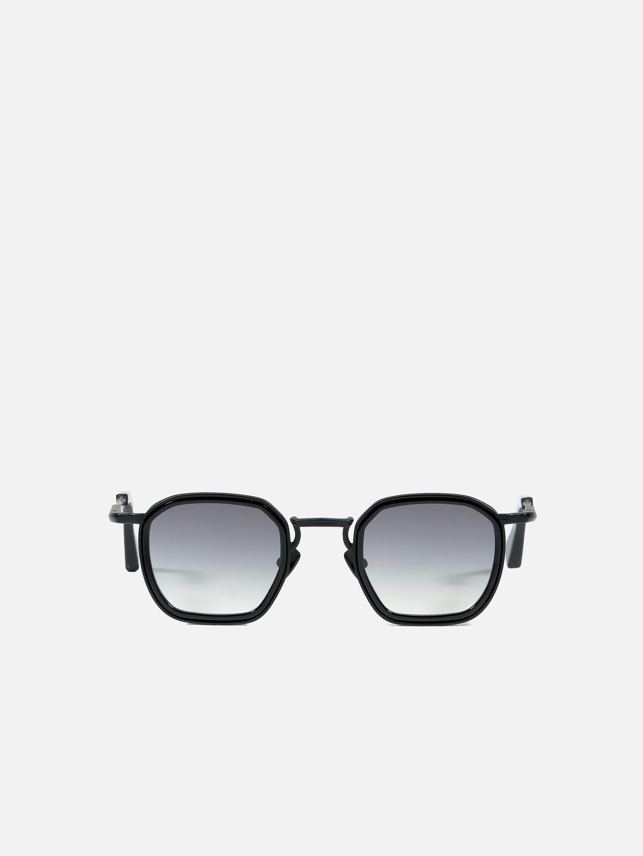 A unisex graphic shape with rims carved out of a 4mm engraved metal strip. The frame is enlivened by our new geometric bridge and features traditional end pieces. Shiny black acetate & alloy frame treated with a carbon black layer. Grey gradient lenses CR39 lenses with AR treatment. Reference C-301. Cases and cleaning cloth are included.