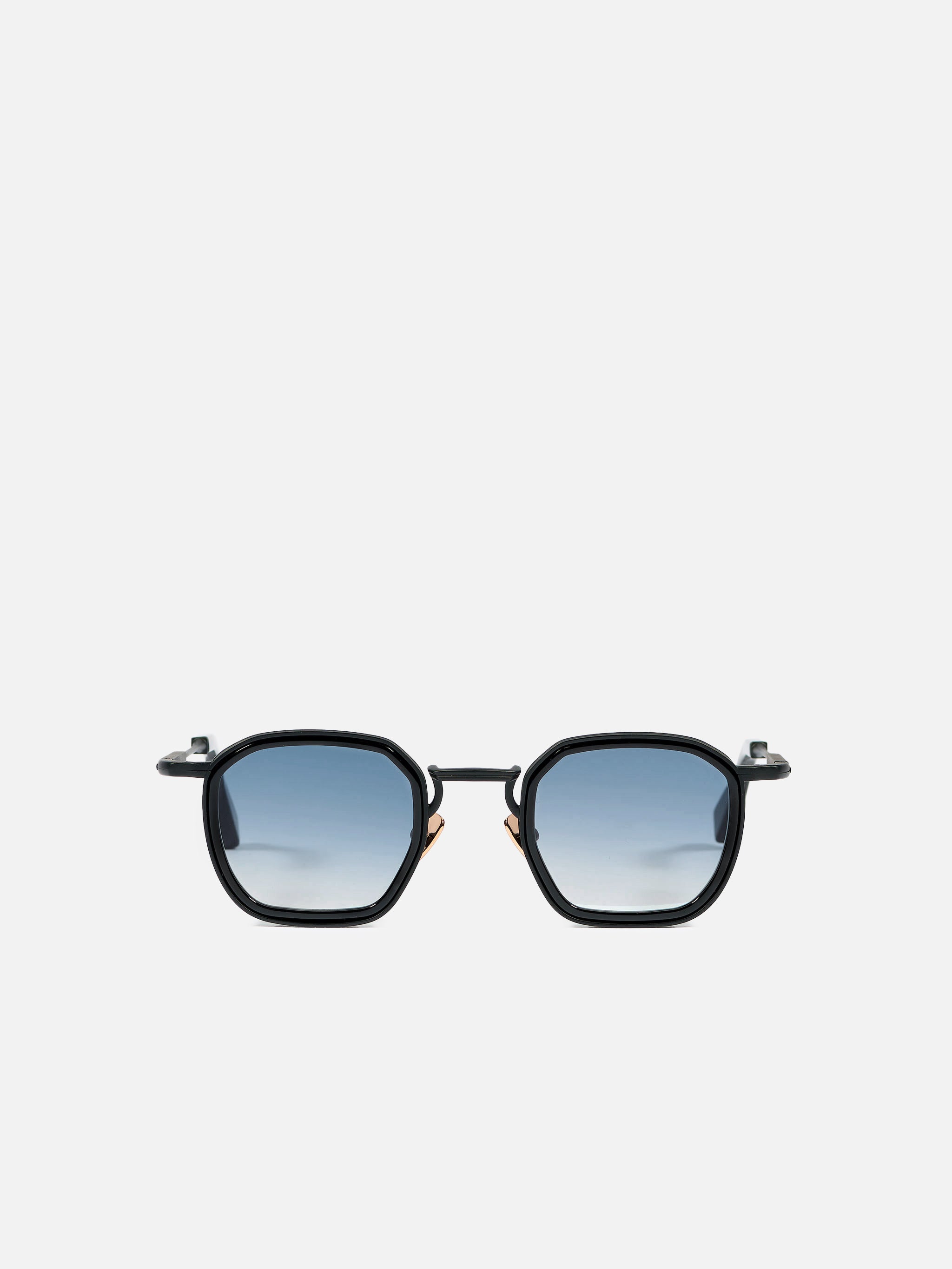 A unisex graphic shape with rims carved out of a 4mm engraved metal strip. The frame is enlivened by our new geometric bridge and features traditional end pieces. Shiny black acetate. Alloy frame treated with a carbon black layer & Rose gold plated nose pads (c. 5µ layer and jewelry stamp inside the temple). Clear blue gradient lenses CR39 lenses with AR treatment. Reference C-303. Cases and cleaning cloth are included.