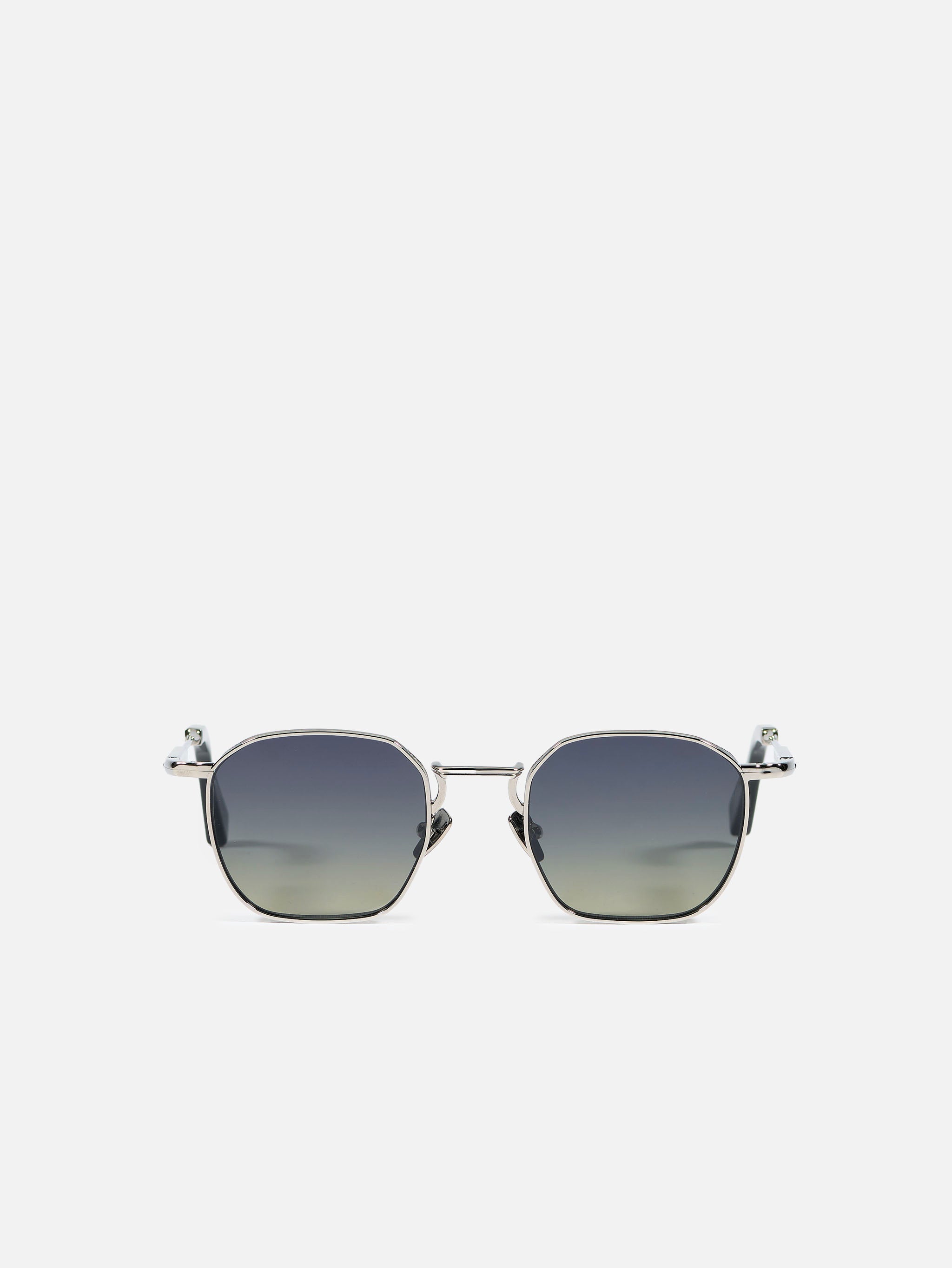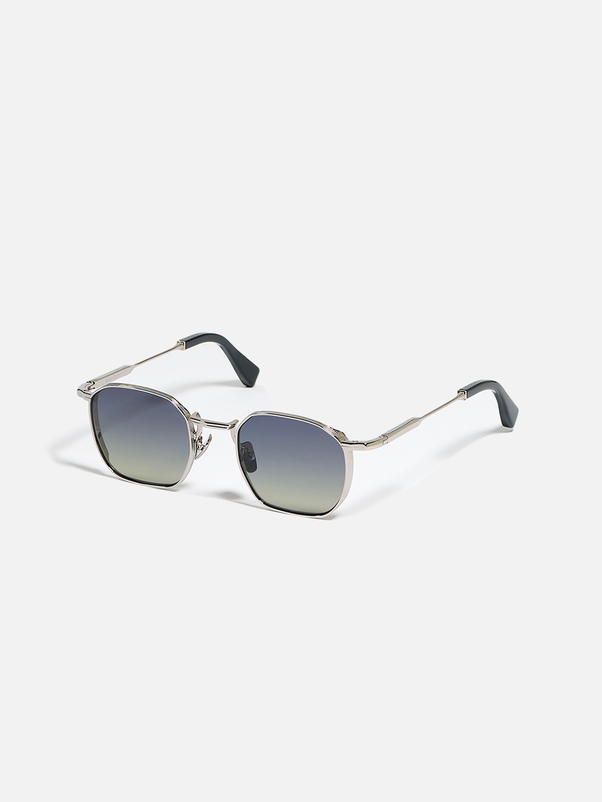 A unisex graphic shape with rims carved out of a 4mm engraved metal strip. The frame is enlivened by our new geometric bridge and features traditional end pieces. Ruthenium plated alloy frame (c. 3µ layer). Night Blue polarized gradient CR39 lenses with AR treatment. Reference C-526. Case and cleaning cloth are included.