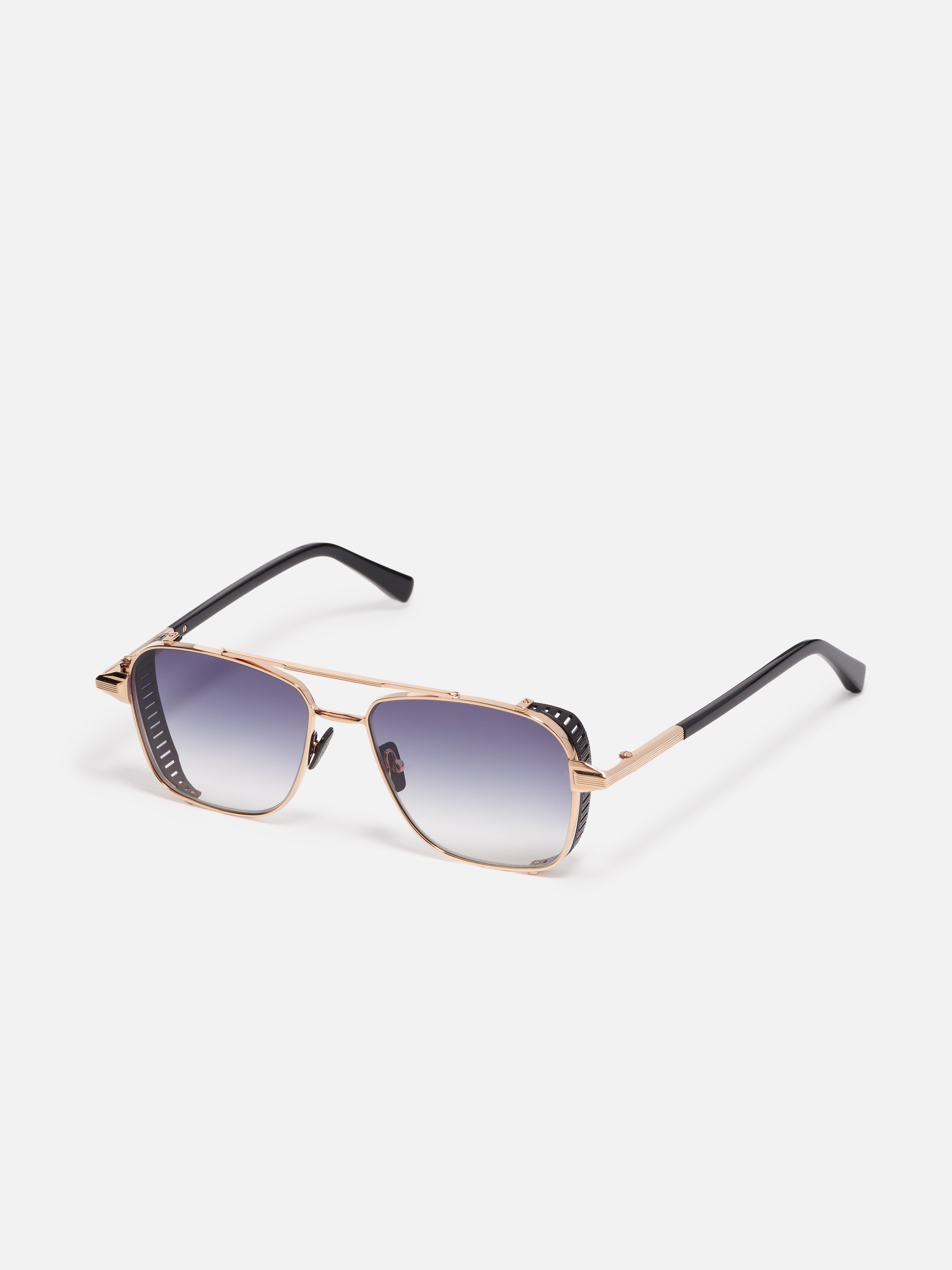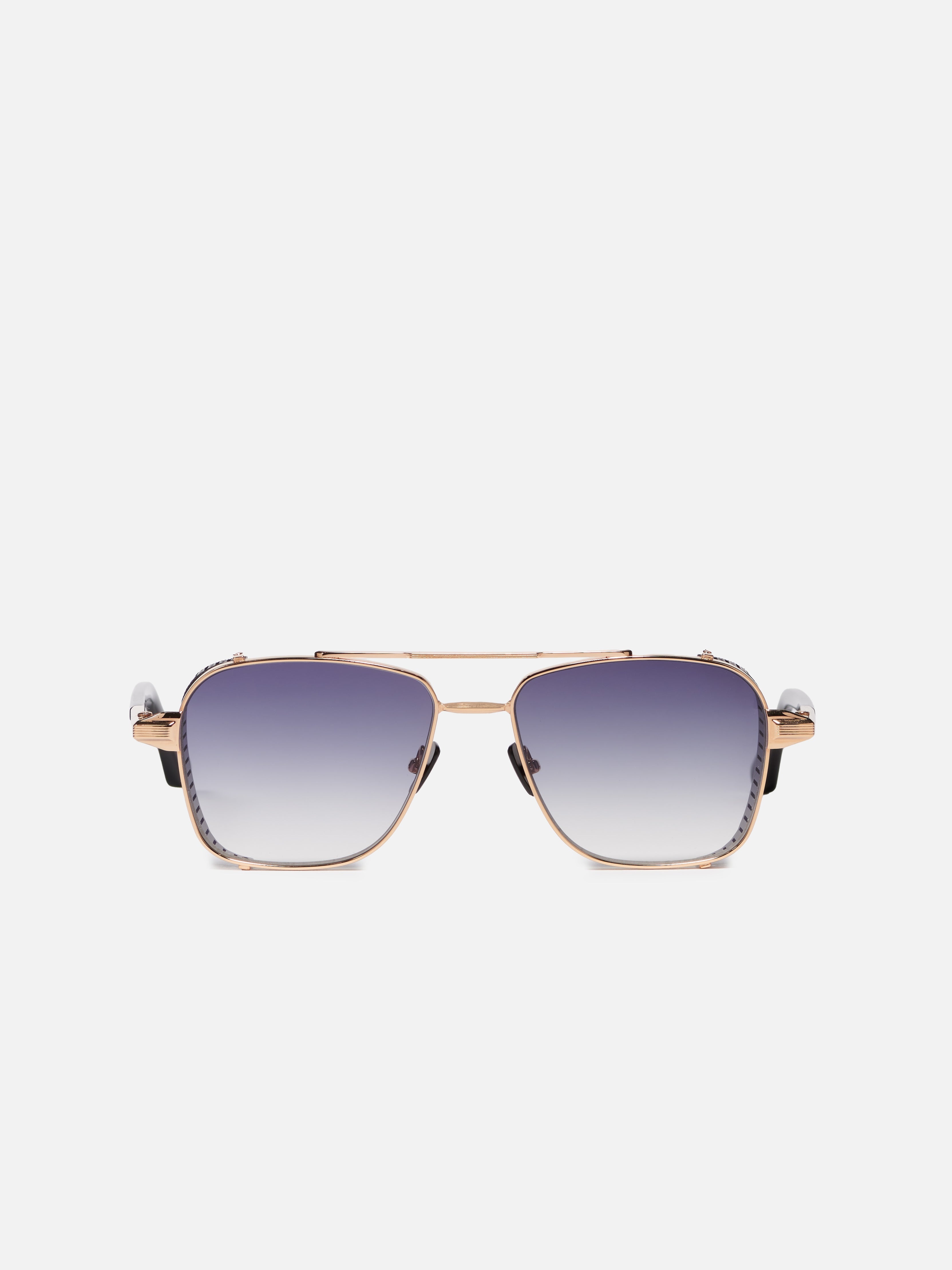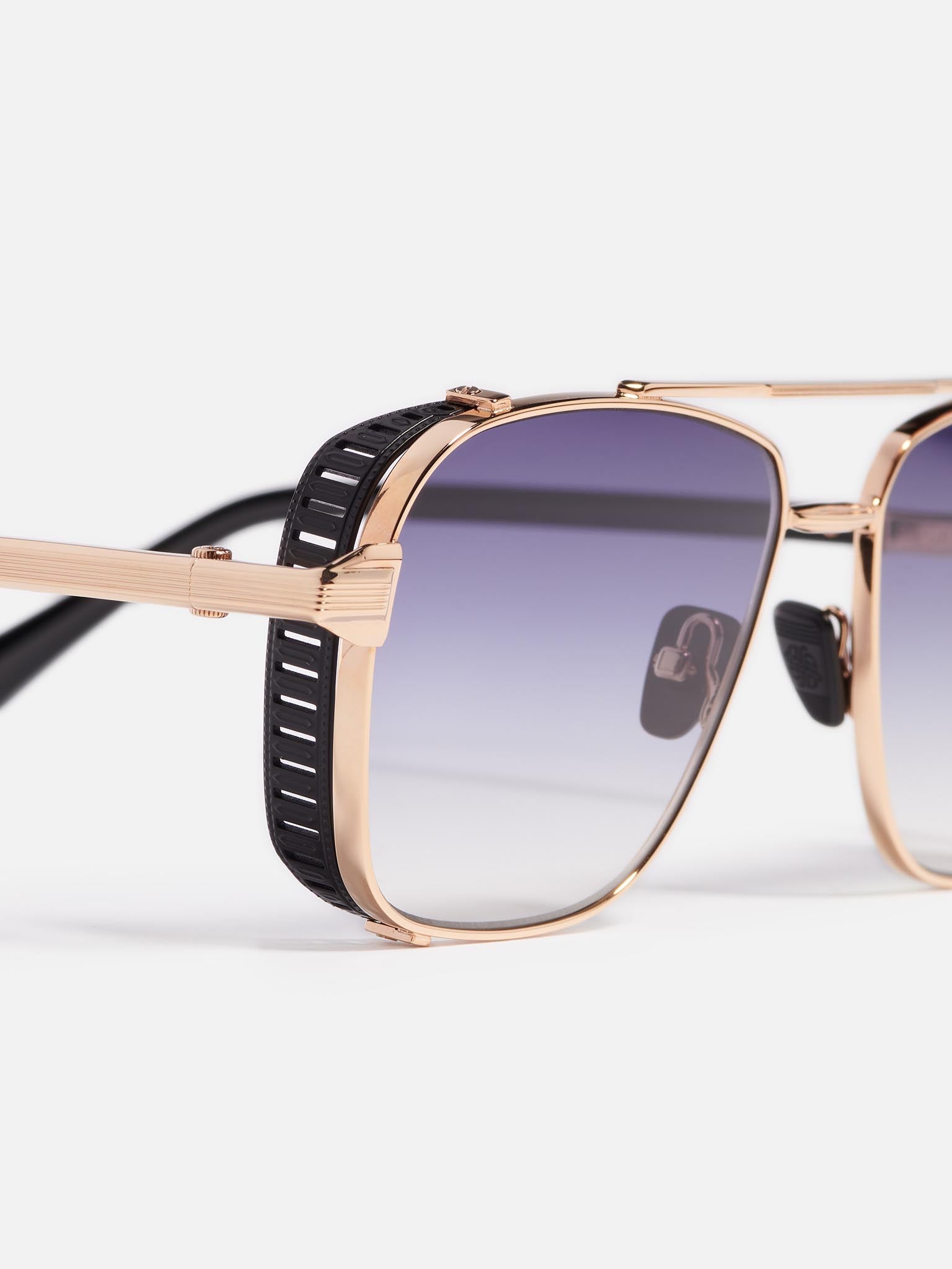 The metal corewire is made of stainless steel frame with a rose gold plating (5µ, with a jeweler's stamp on the inner temple) Side shields and nose pads in carbon-effect black. Temple tips in black acetate.