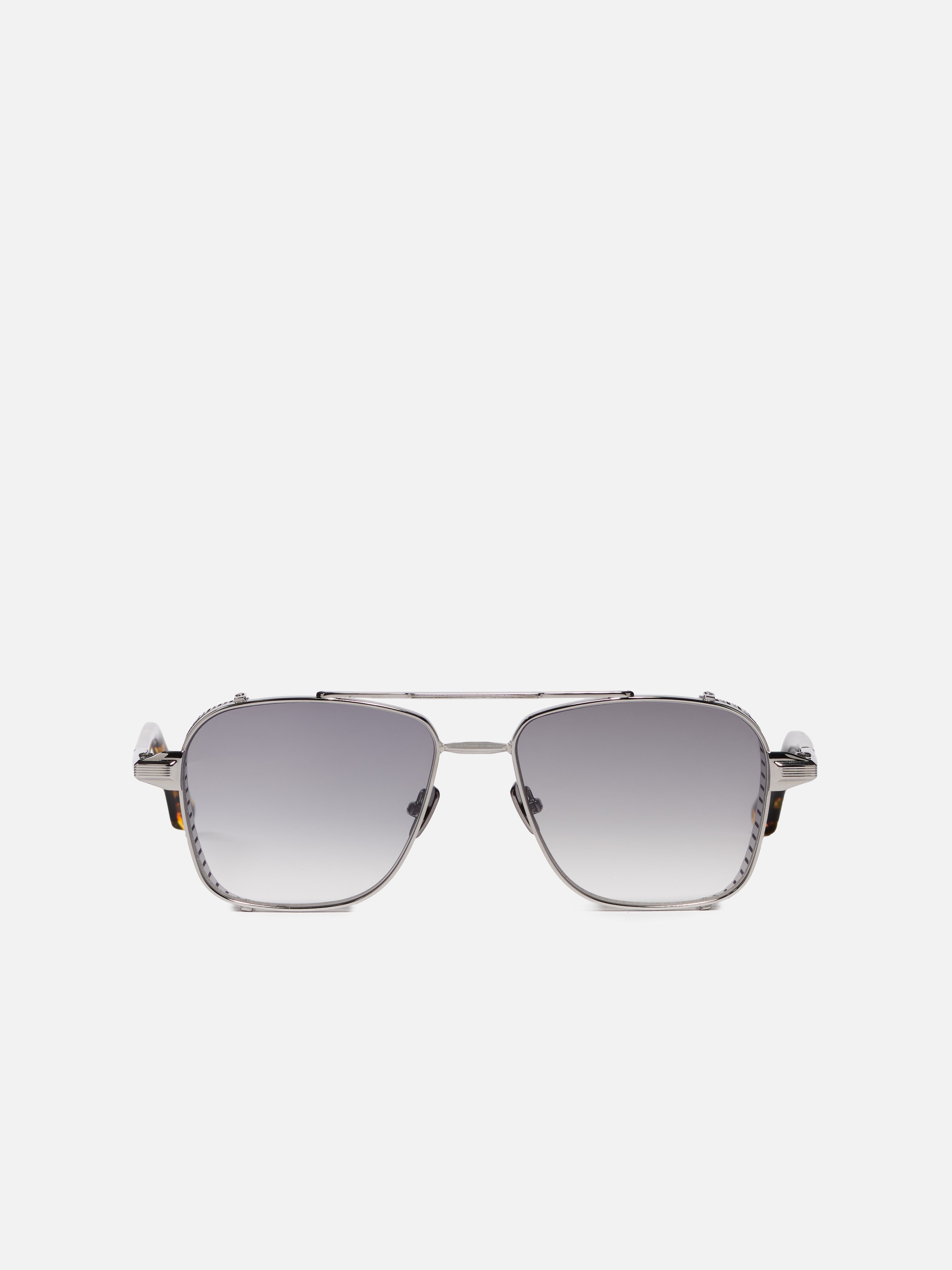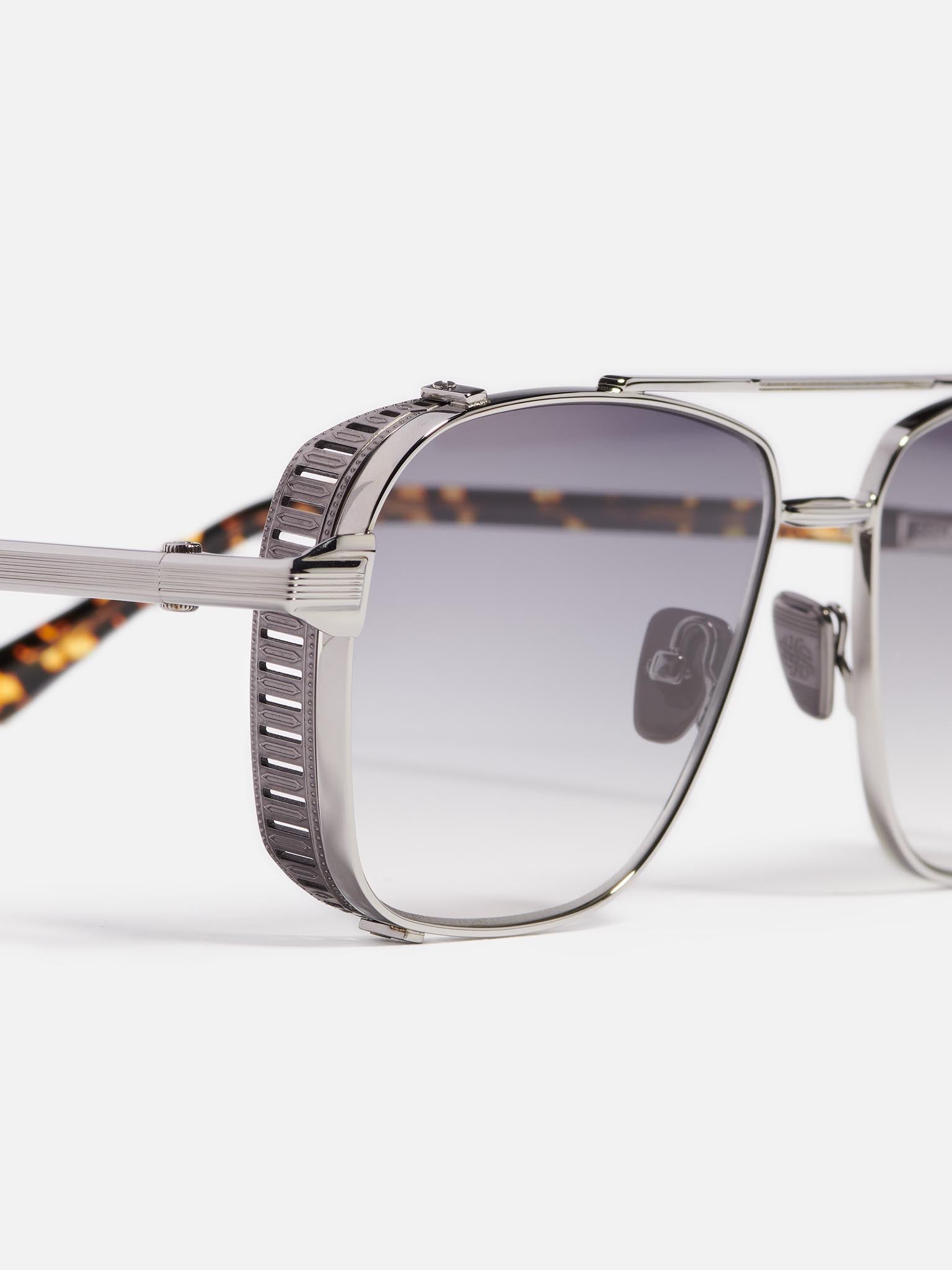 Masculine aviator frame with a double bridge and wide, grooved end pieces. Features protective titanium glacier side shields. Titanium nose pads and extended acetate temple tips for optimal comfort.