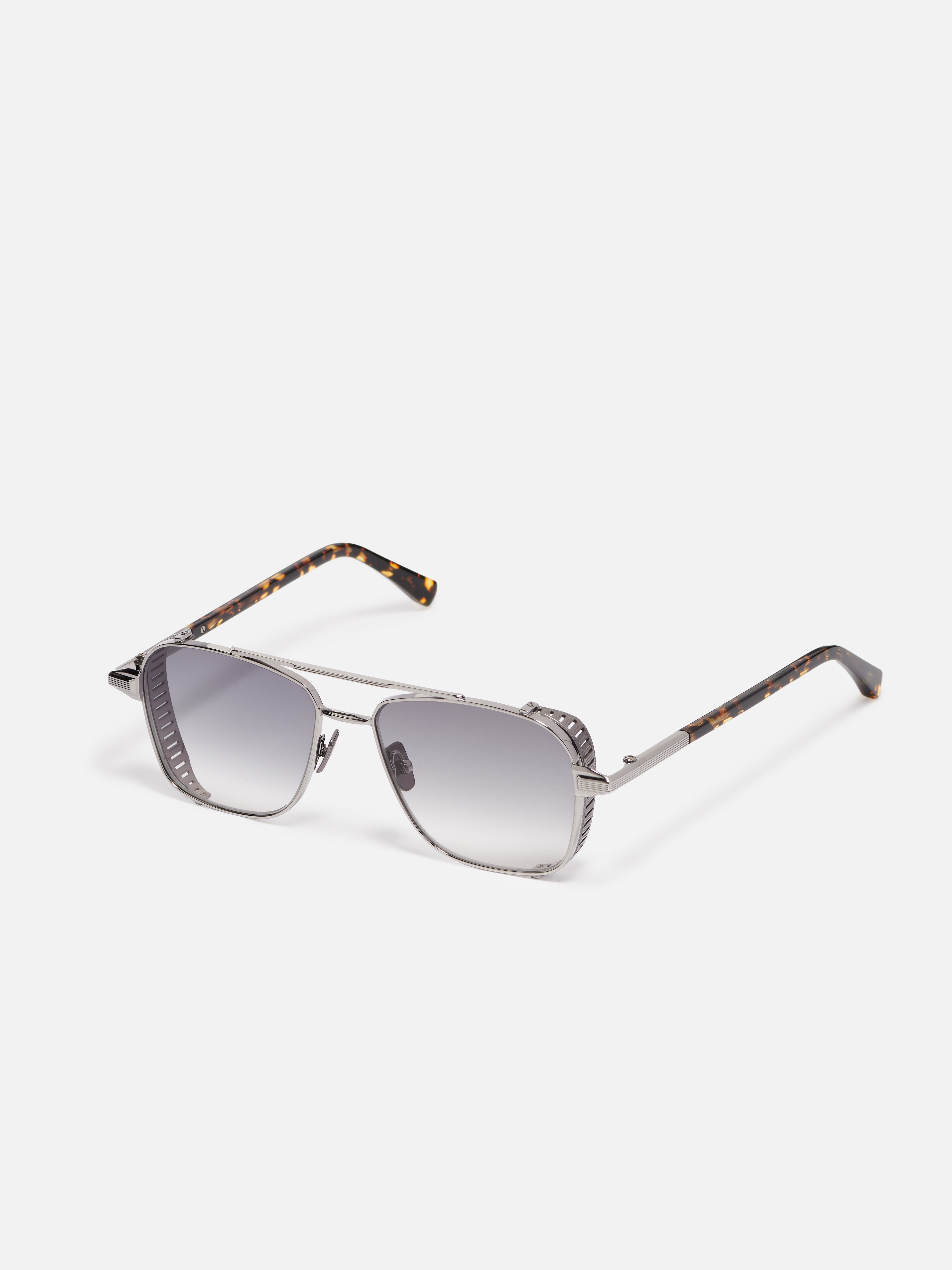 Eye : 48 - Bridge : 22 - Temple : 145. Masculine aviator frame with a double bridge and wide, grooved end pieces.. Best on medium to large faces.