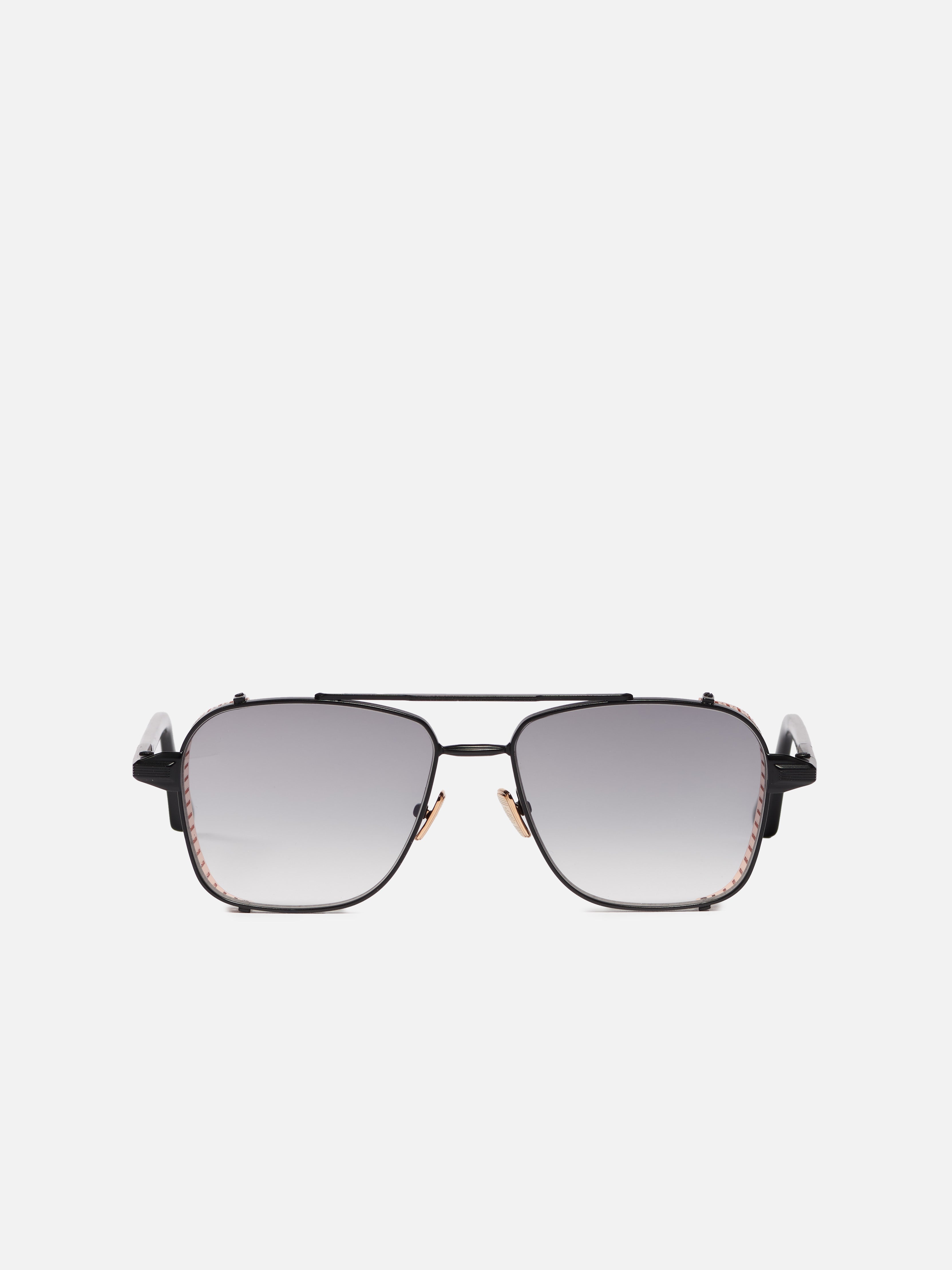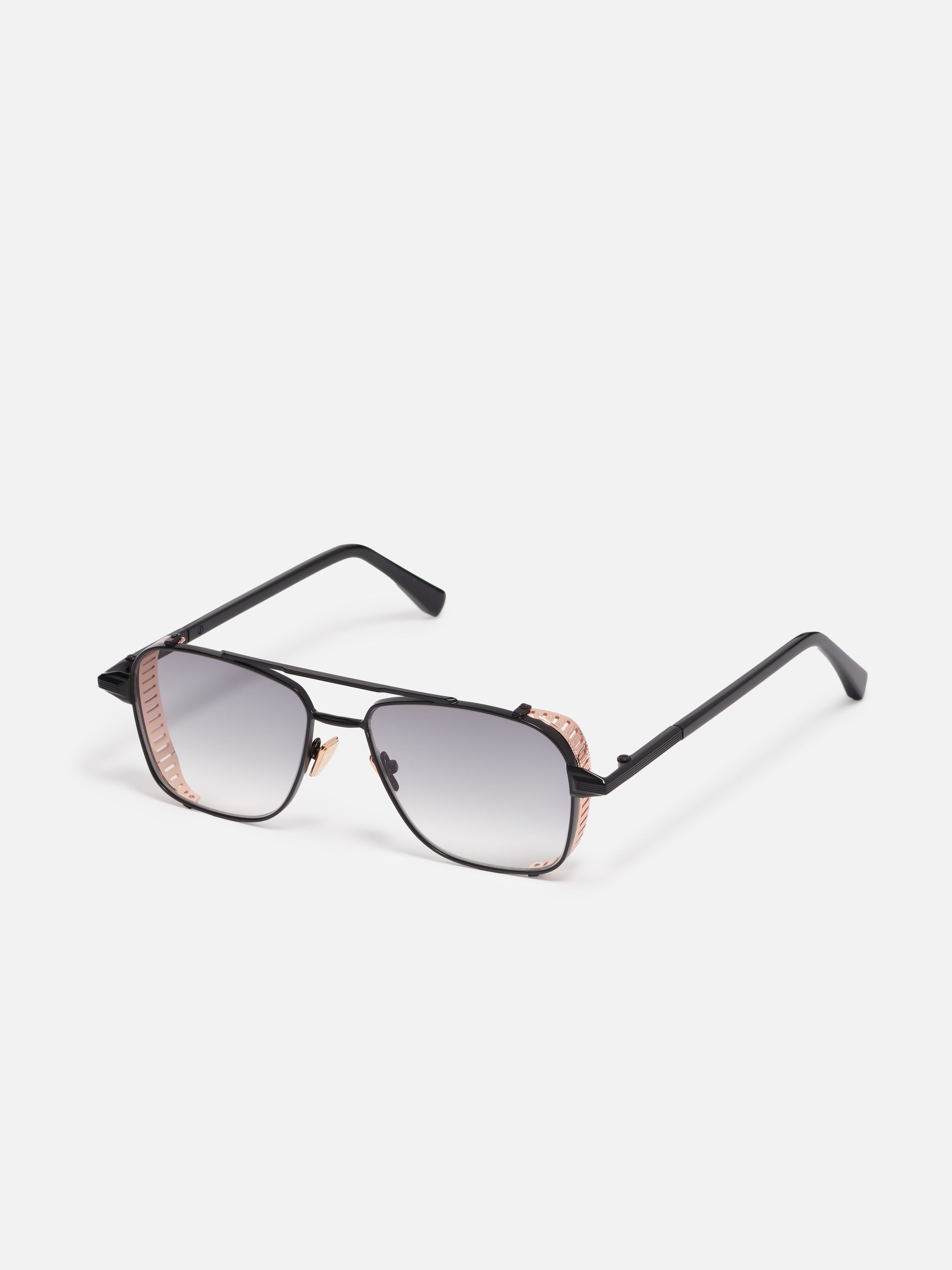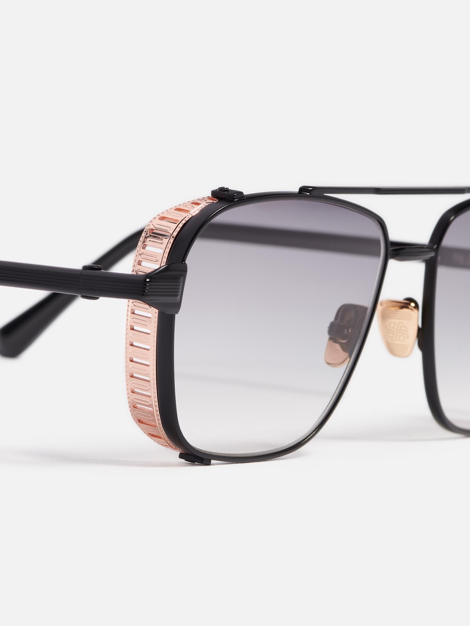 The metal corewire is made of stainless steel frame with a carbon black finish. Side shields and nose pads in rose gold color. Temple tips in black acetate.