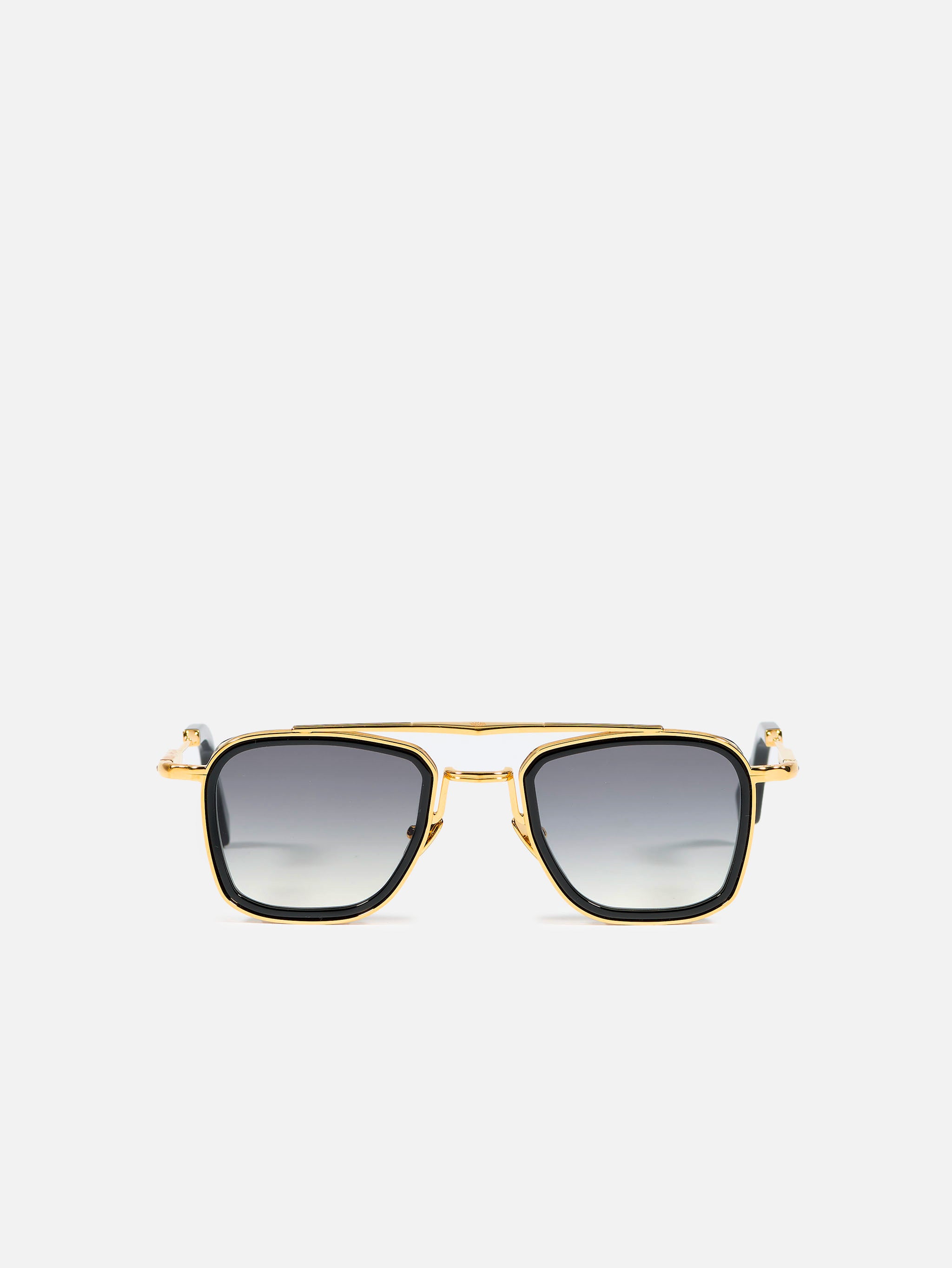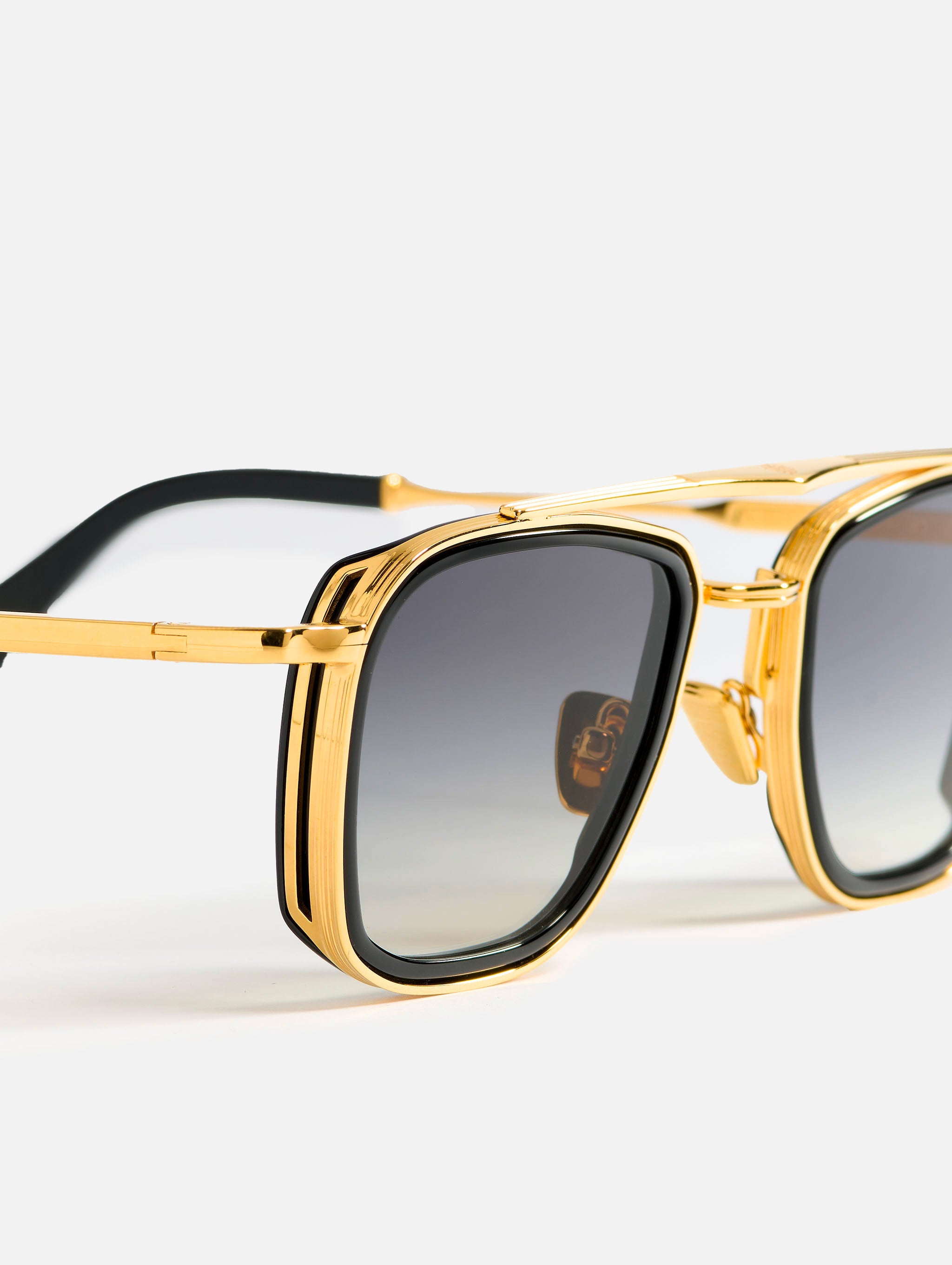 A unisex tailored rectangular shape with rims carved out of a 4mm engraved metal strip. The frame is enlivened by our new signature double bridge and features traditional end pieces. Infinite Black acetate with yellow gold-plated framework and temple tips. Grey gradient CR39 lenses with AR treatment. Reference C-100. Case and cleaning cloth are included.
