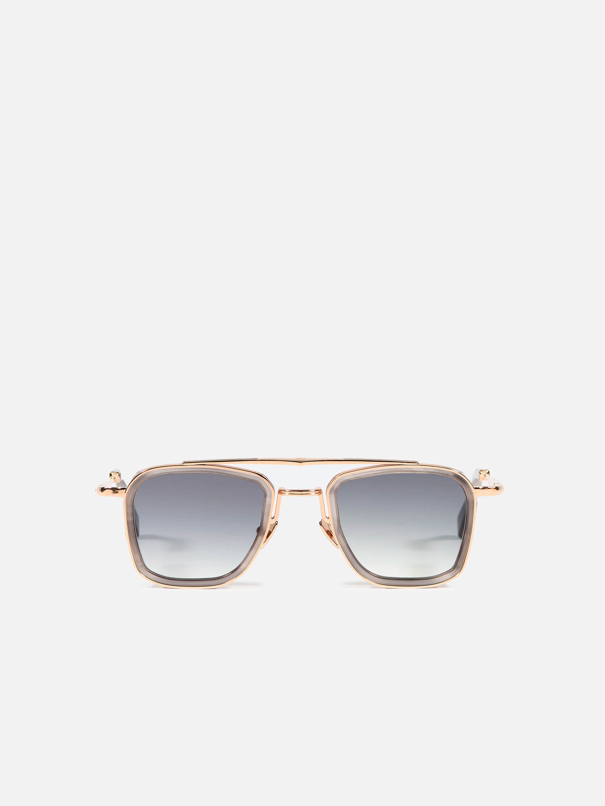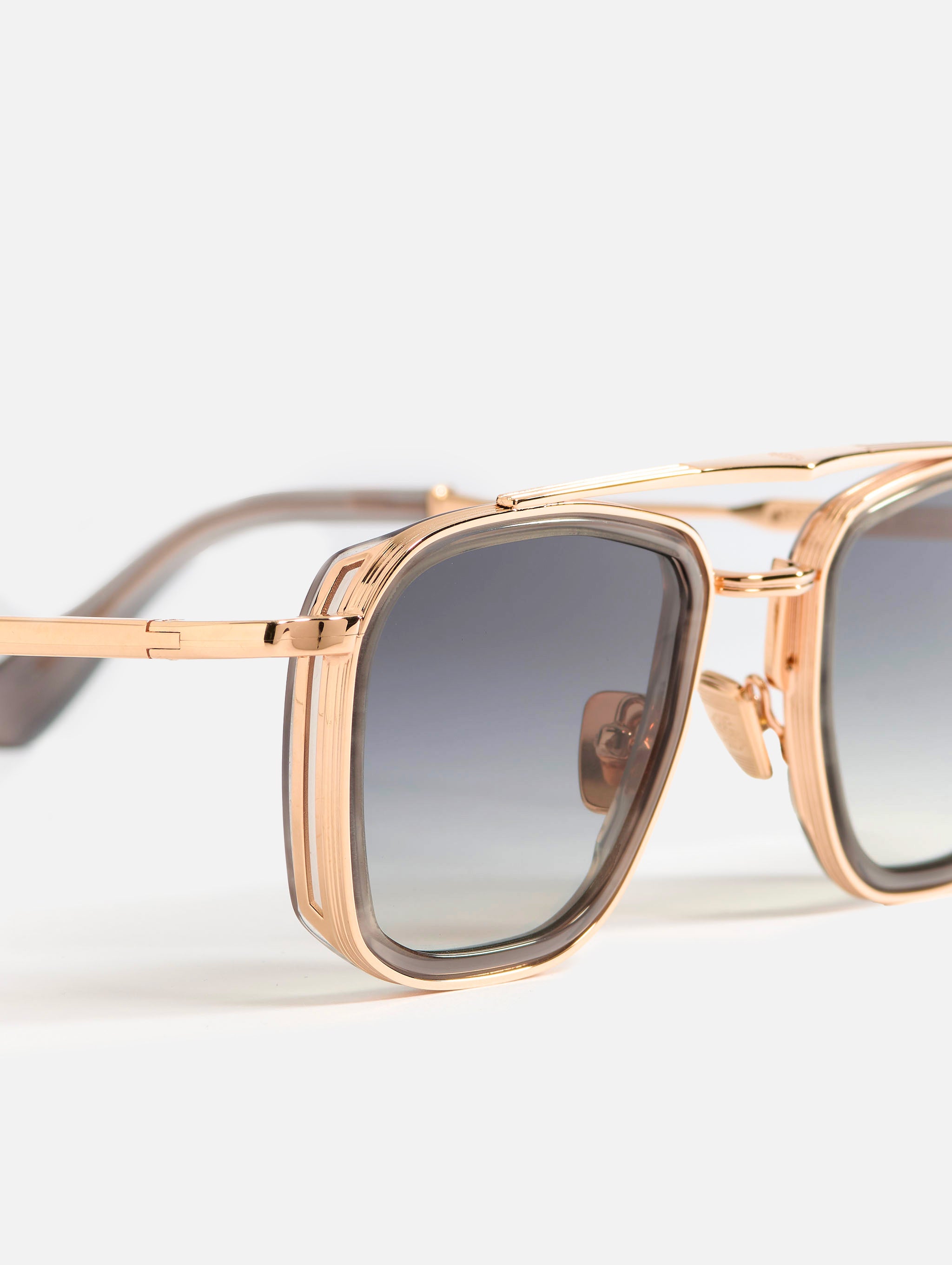 A unisex tailored rectangular shape with rims carved out of a 4mm engraved metal strip. The frame is enlivened by our new signature double bridge and features traditional end pieces. Workman grey acetate with rose gold-plated framework and temple tips. Grey gradient CR39 lenses with AR treatment. Reference C-154. Case and cleaning cloth are included.