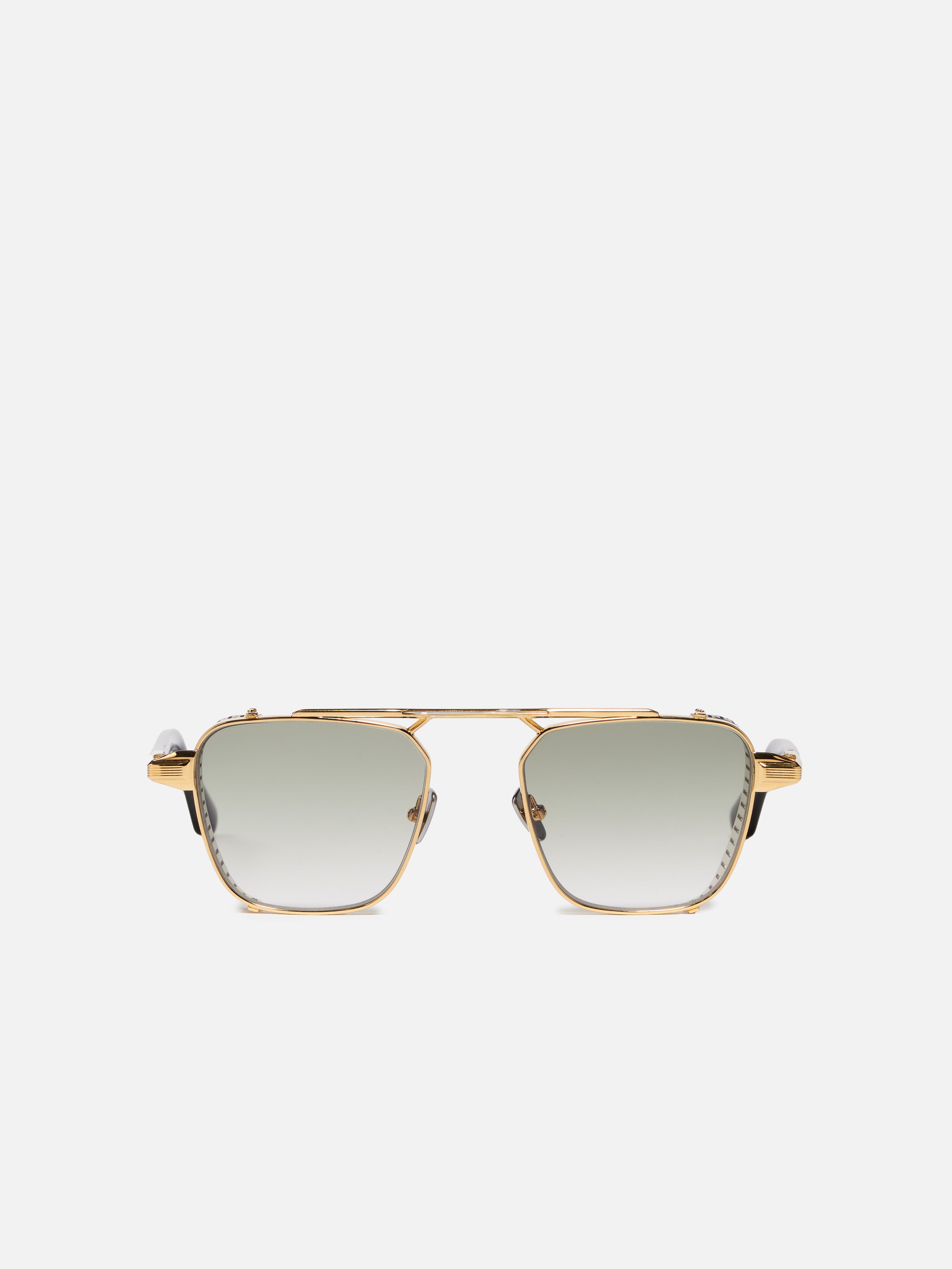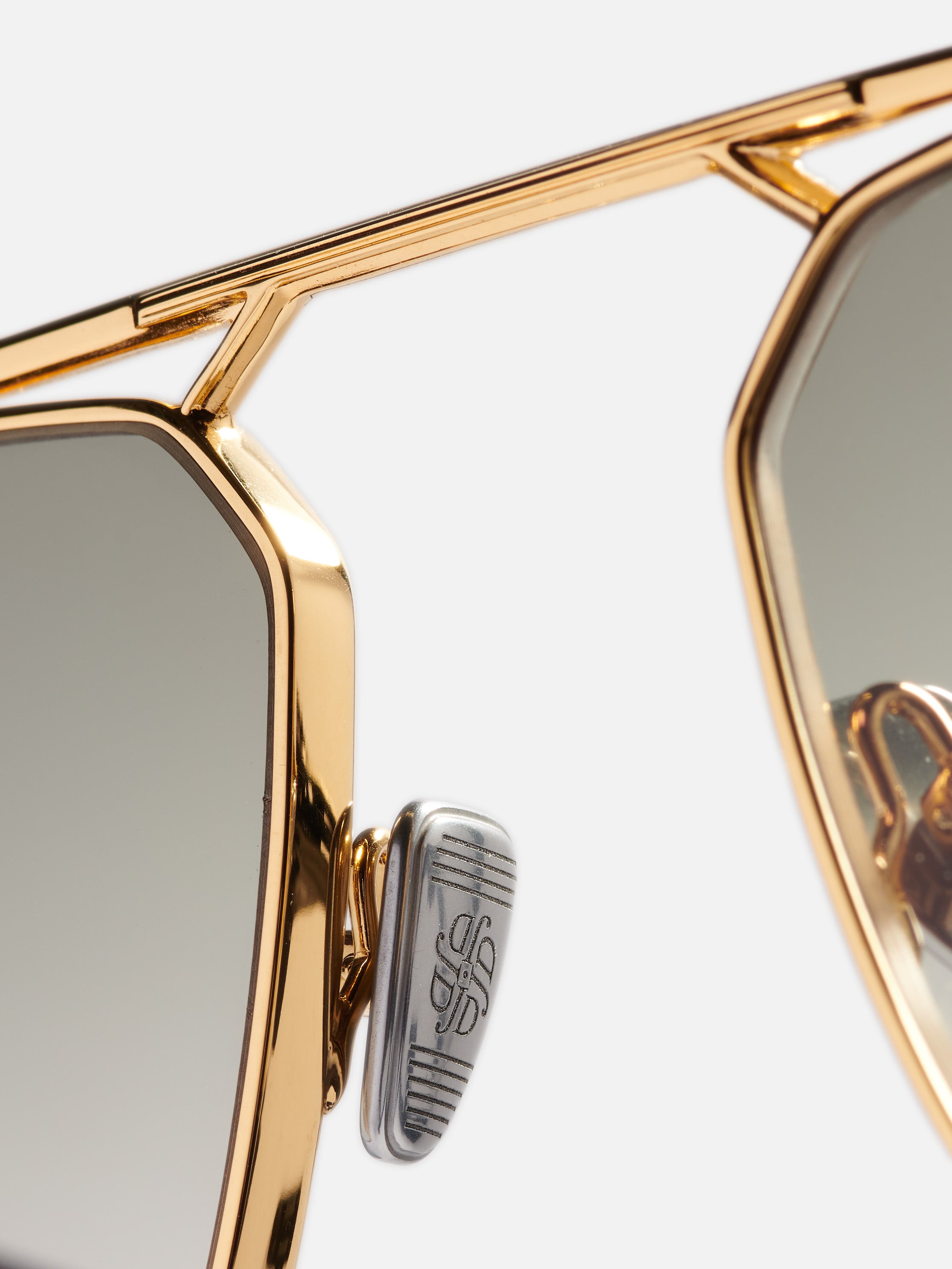 The metal corewire is made of stainless steel frame with a yellow gold plating (5µ, with a jeweler's stamp on the inner temple). Side shields and nose pads in silver color. Temple tips in black acetate.