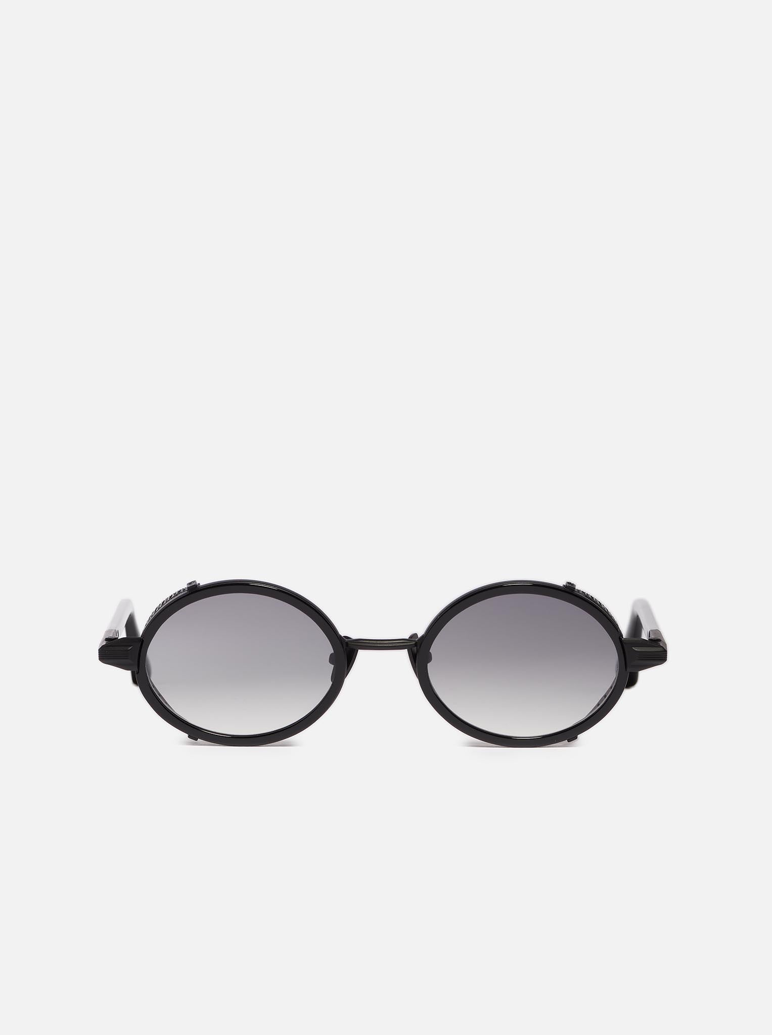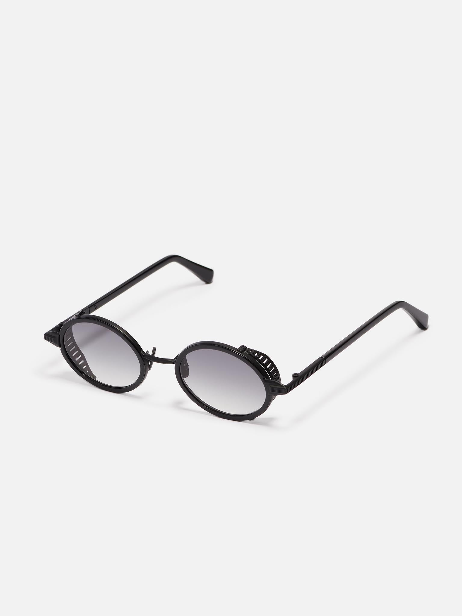 The structure is made of black stainless steel with a carbon-effect finish. The side shields and nose pads are also carbon-effect black, while the temple tips and rims are crafted from black acetate.