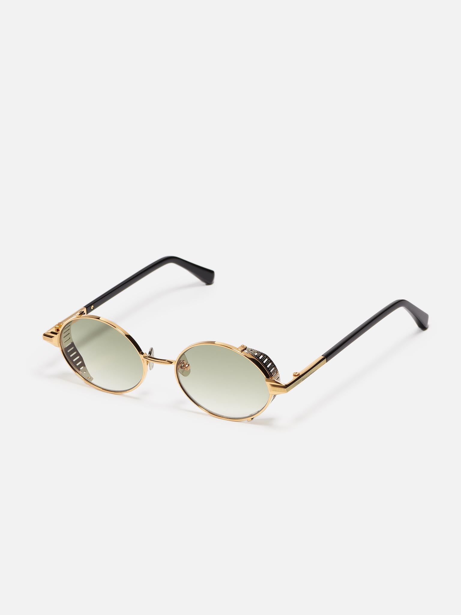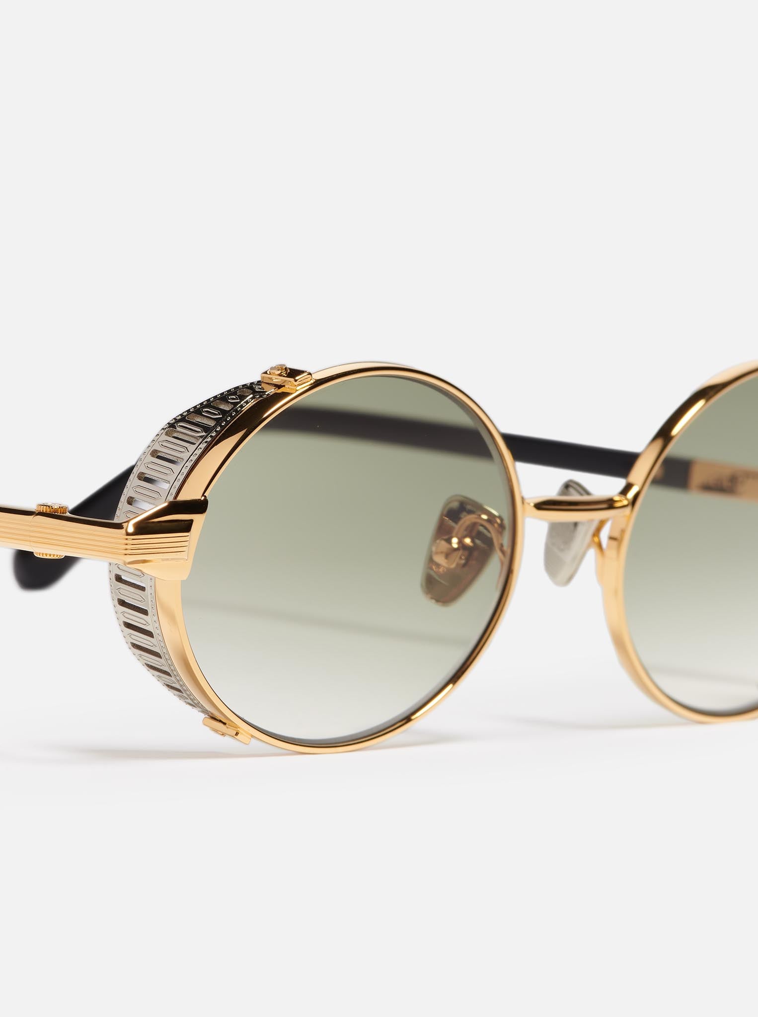 The structure is made of yellow gold-plated stainless steel (5µ) with a jeweler’s hallmark on the inside of the temple. The side shields and nose pads are ruthenium-colored, while the temple tips are crafted from black acetate.