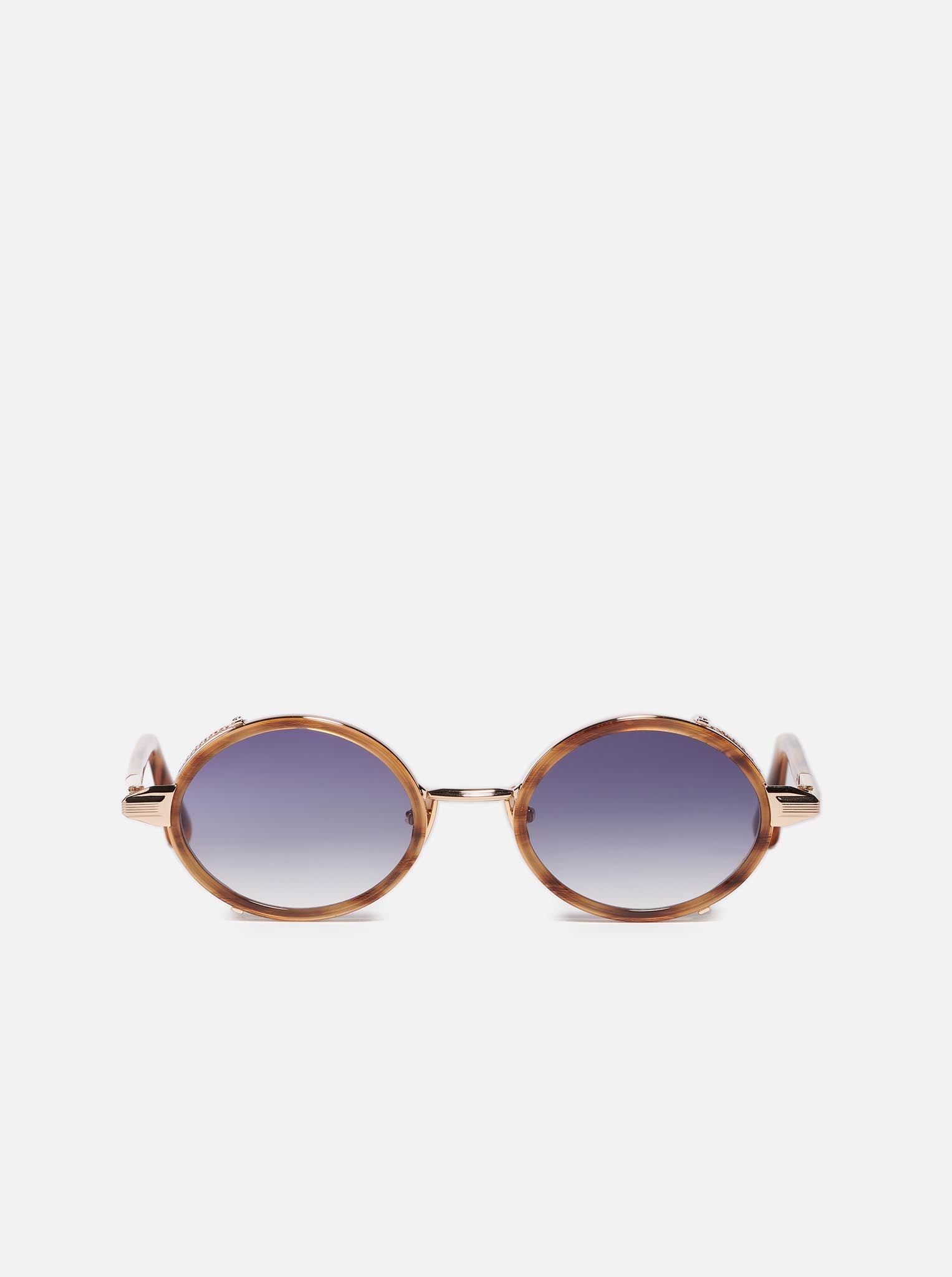 Oval-shaped frame combining metal and acetate. Featuring a reinforced simple bridge, wide textured temples.