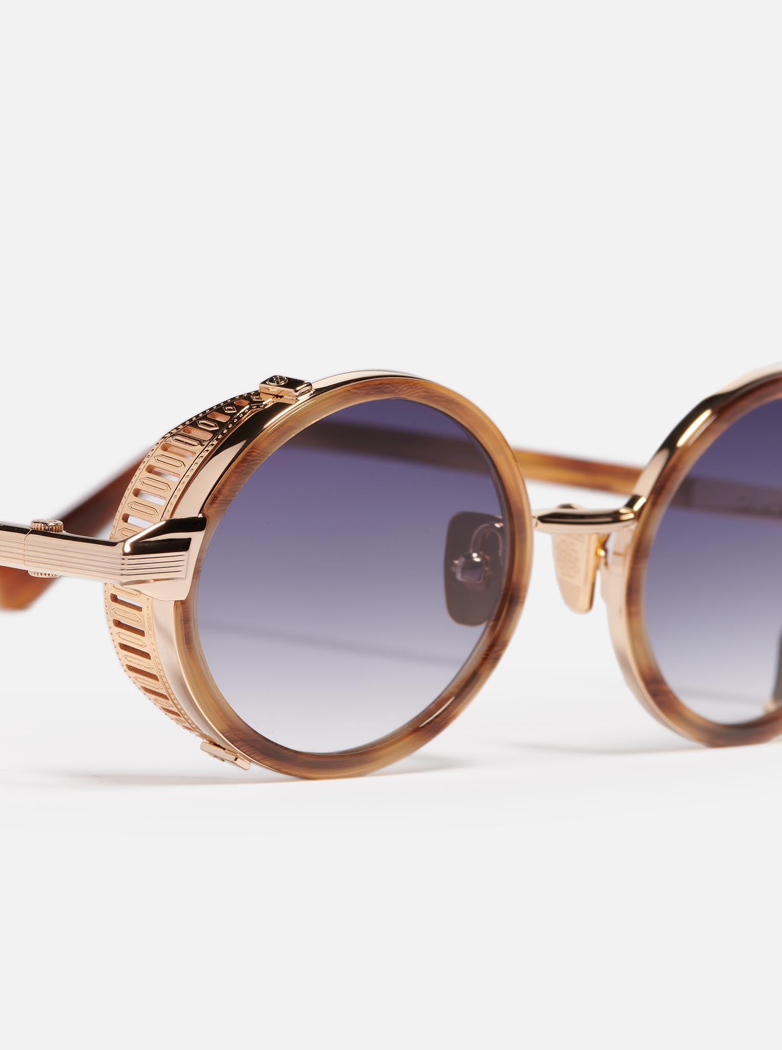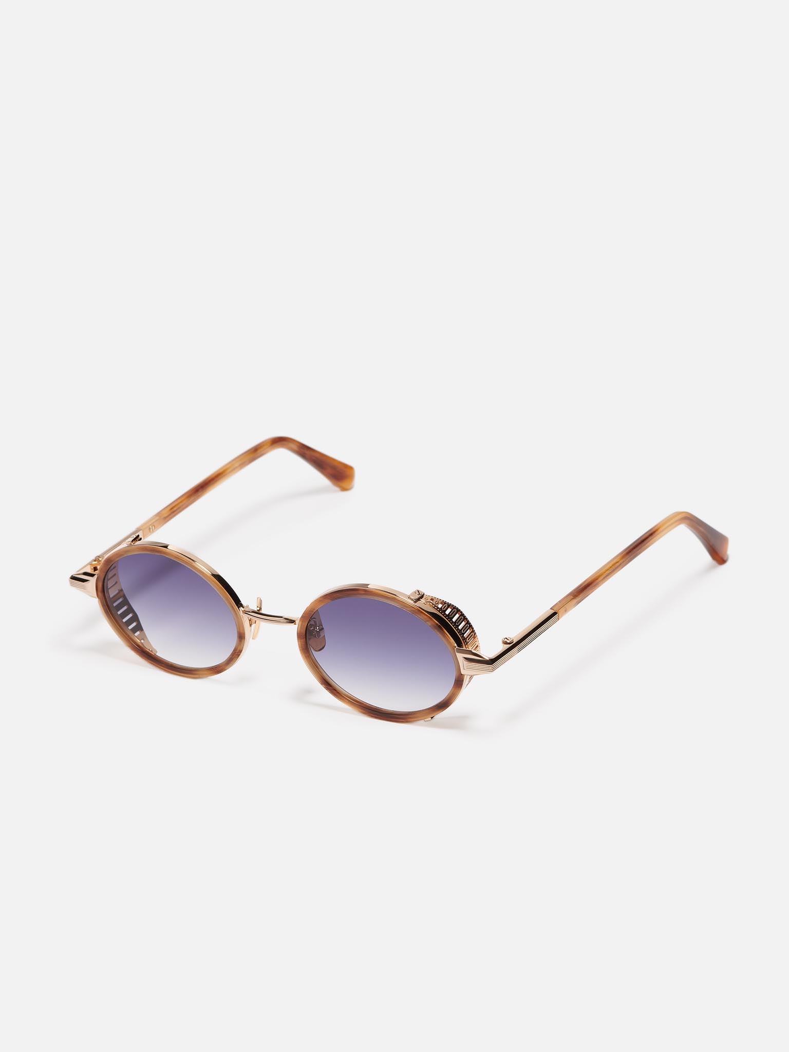 The structure is made of antique gold-plated stainless steel (5µ, with a jeweler’s hallmark inside the temple). The side shields and nose pads are colored in antique gold. The temple tips and rims are crafted from cognac tortoiseshell acetate.